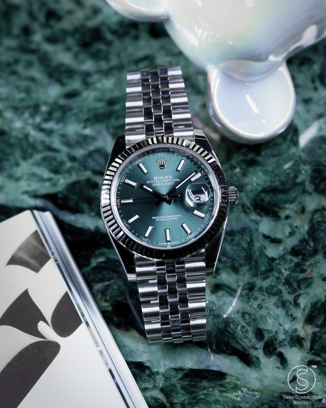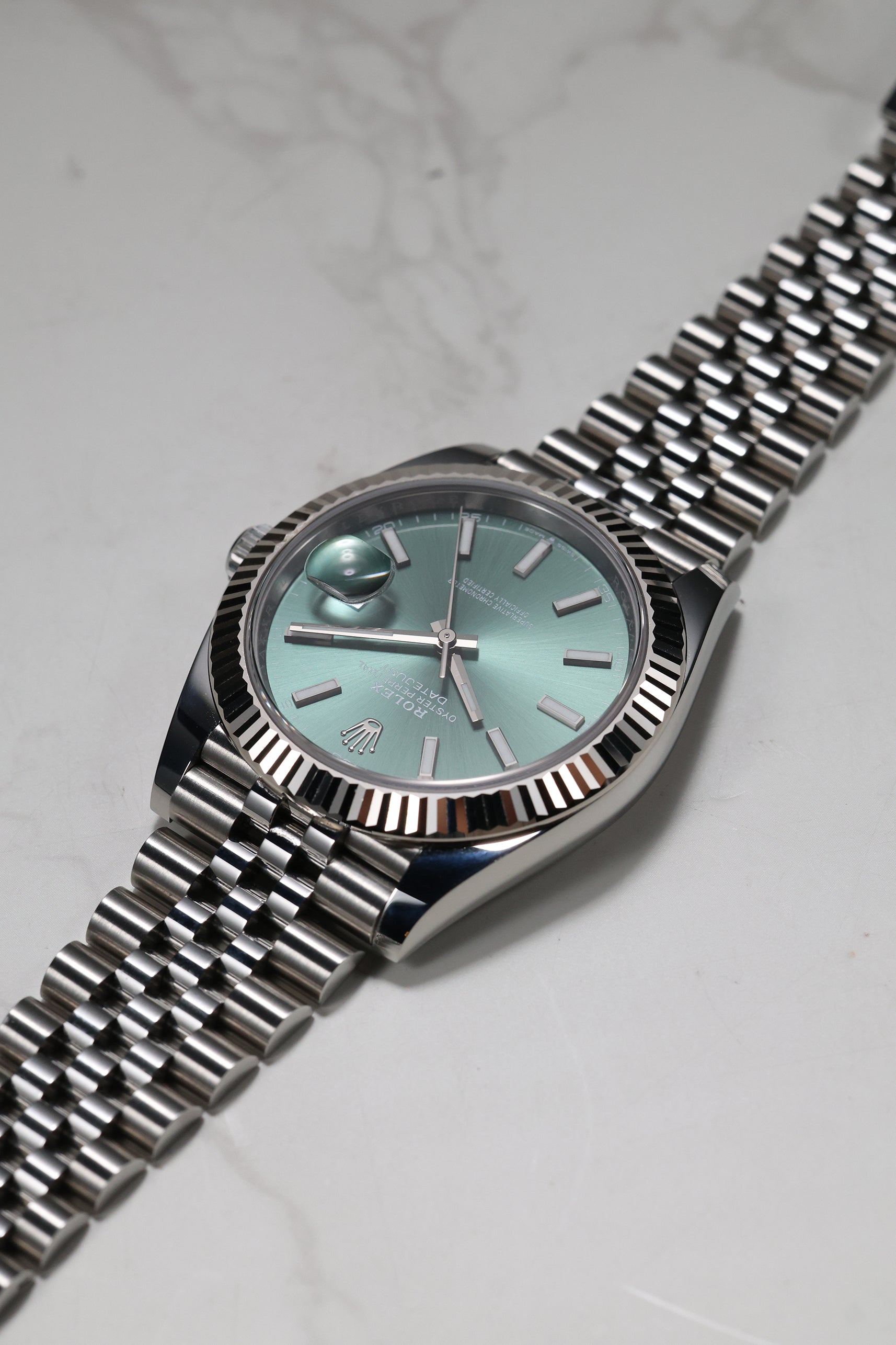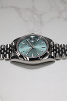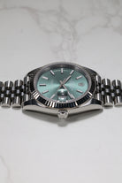 This specific Datejust 41 captivates with its highly sought-after Mint Green dial. This contemporary hue, celebrated for its subtle yet vibrant character, is finished with a stunning sunray effect, allowing the color to shift beautifully with the light. The dial is elegantly marked by crisp luminous index hour markers that ensure superb clarity. The iconic fluted bezel frames the dial with brilliant precision, while the signature Cyclops lens magnifies the date, a hallmark of Rolex's commitment to both aesthetics and clear utility.