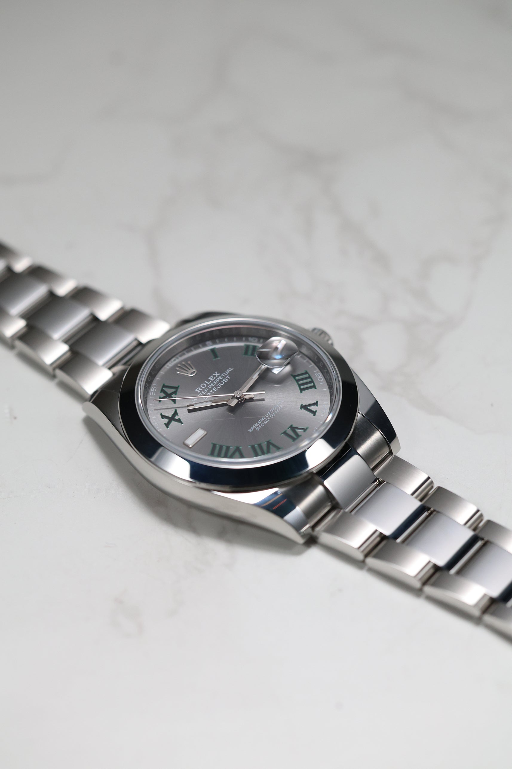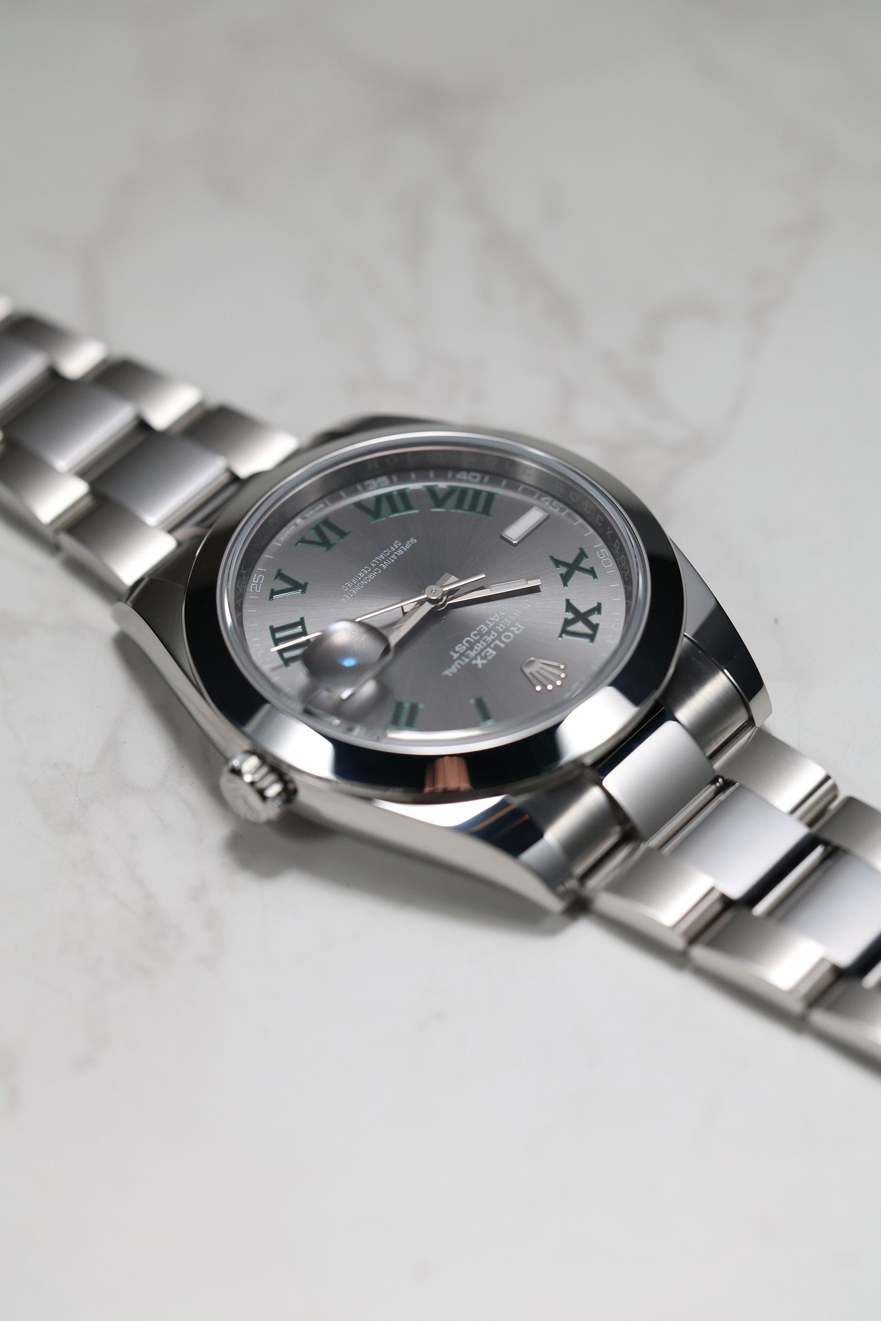 The watch's centerpiece is the now-iconic "Wimbledon" dial, an instantly recognizable feature. Its slate grey sunray finish provides a sophisticated and unique backdrop for the bold green Roman numerals that pay tribute to Rolex's long-standing heritage with the tennis championship. The dial’s monochromatic color scheme is elegantly broken up by the striking green markers, giving the watch a distinguished and captivating personality.