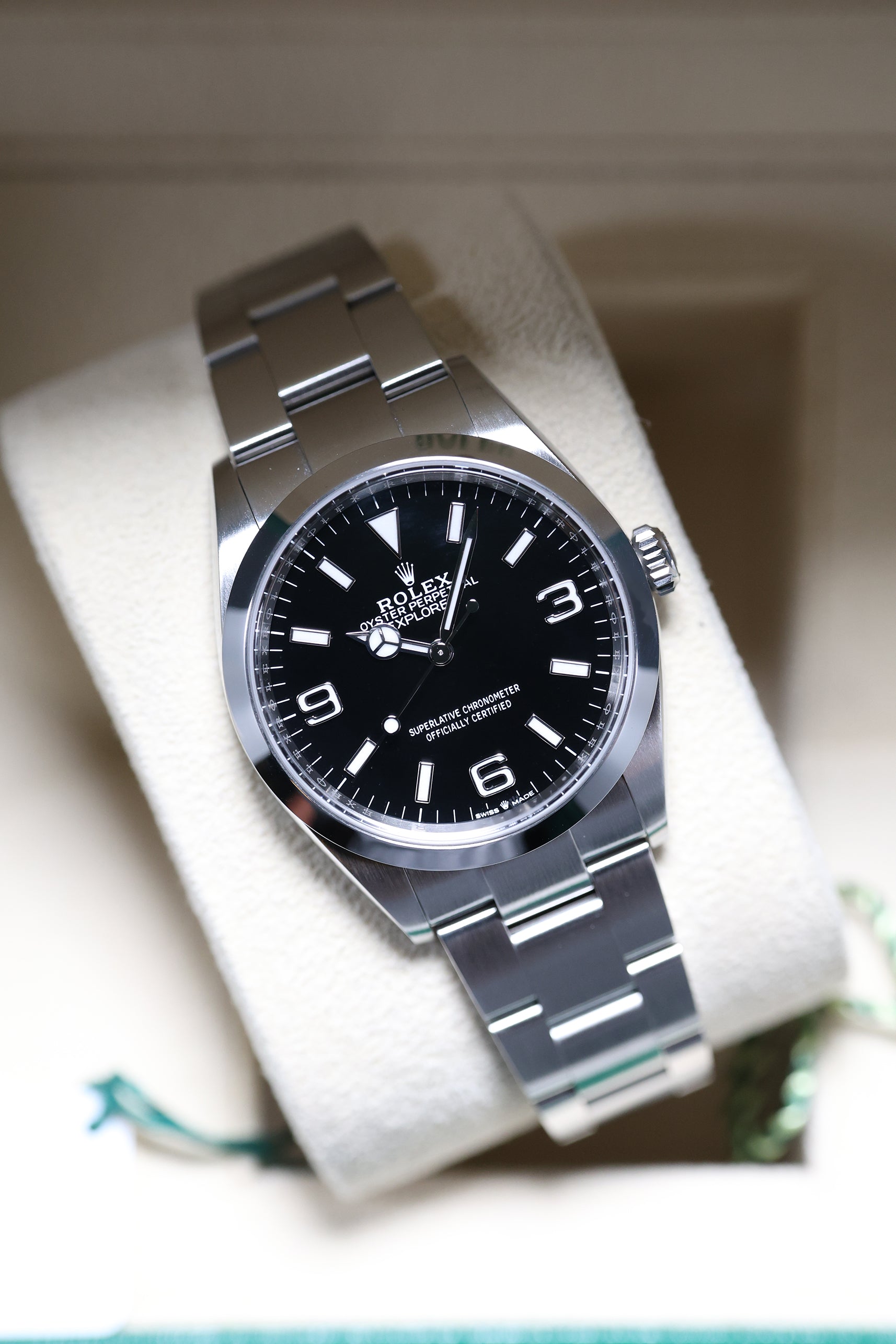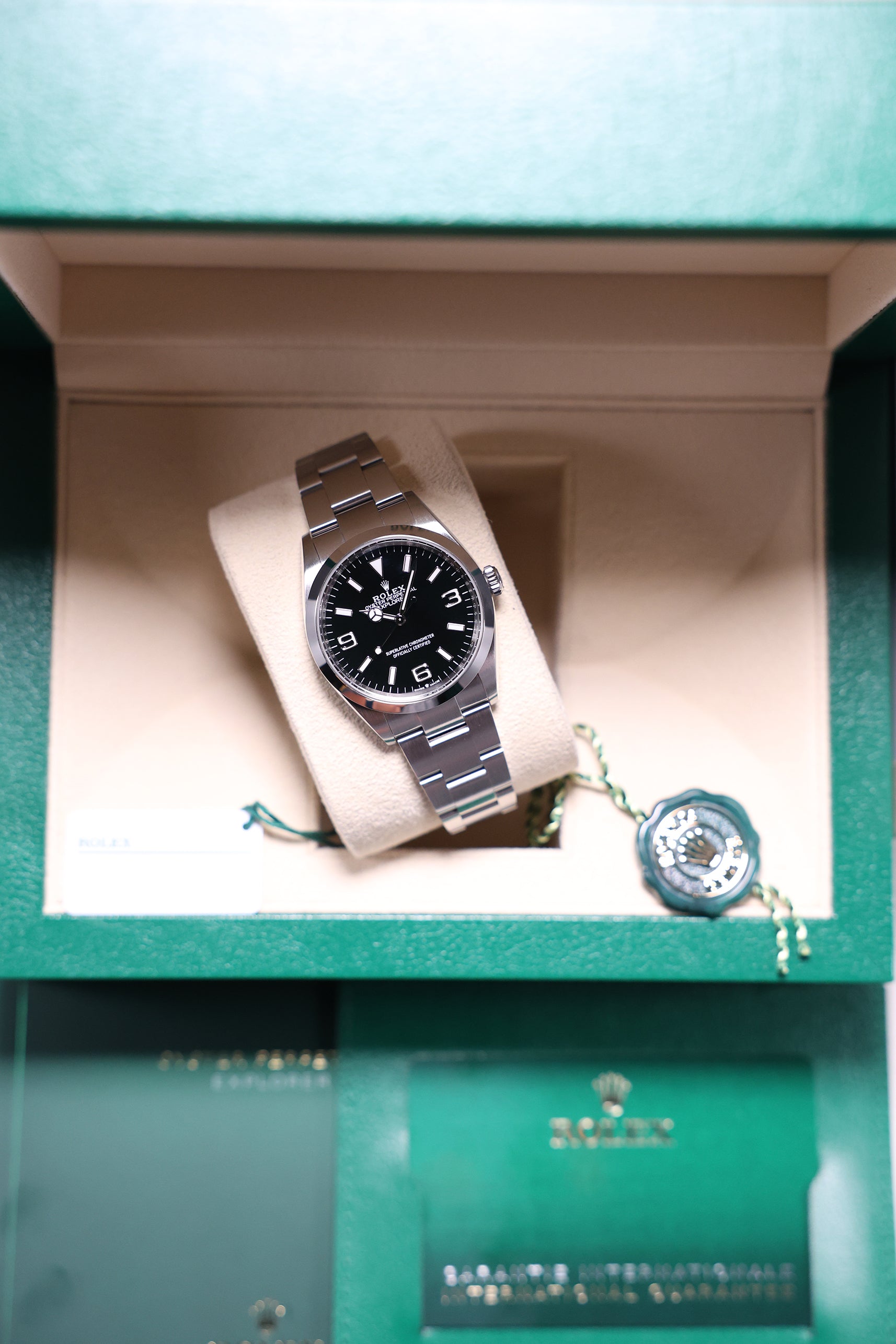 Beneath the surface, the 124270 is powered by Rolex’s Calibre 3230, a state-of-the-art movement that offers a robust 70-hour power reserve. The movement is equipped with the Chronergy escapement, ensuring greater efficiency and precision, while the Parachrom hairspring provides resistance to shocks and temperature variations. This ensures that the watch is not just aesthetically pleasing but also built to withstand the harshest conditions, true to the Explorer’s adventurous spirit.