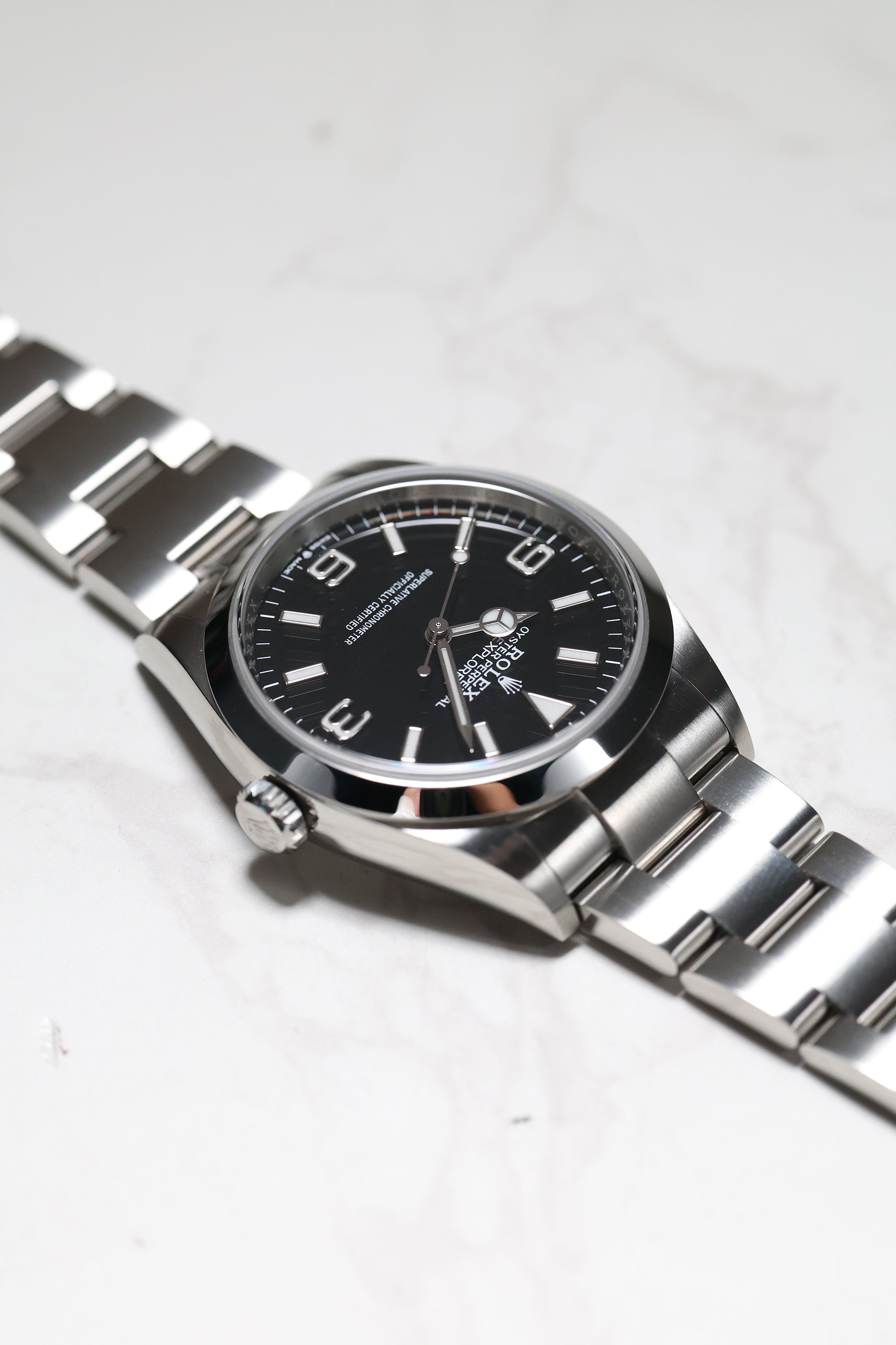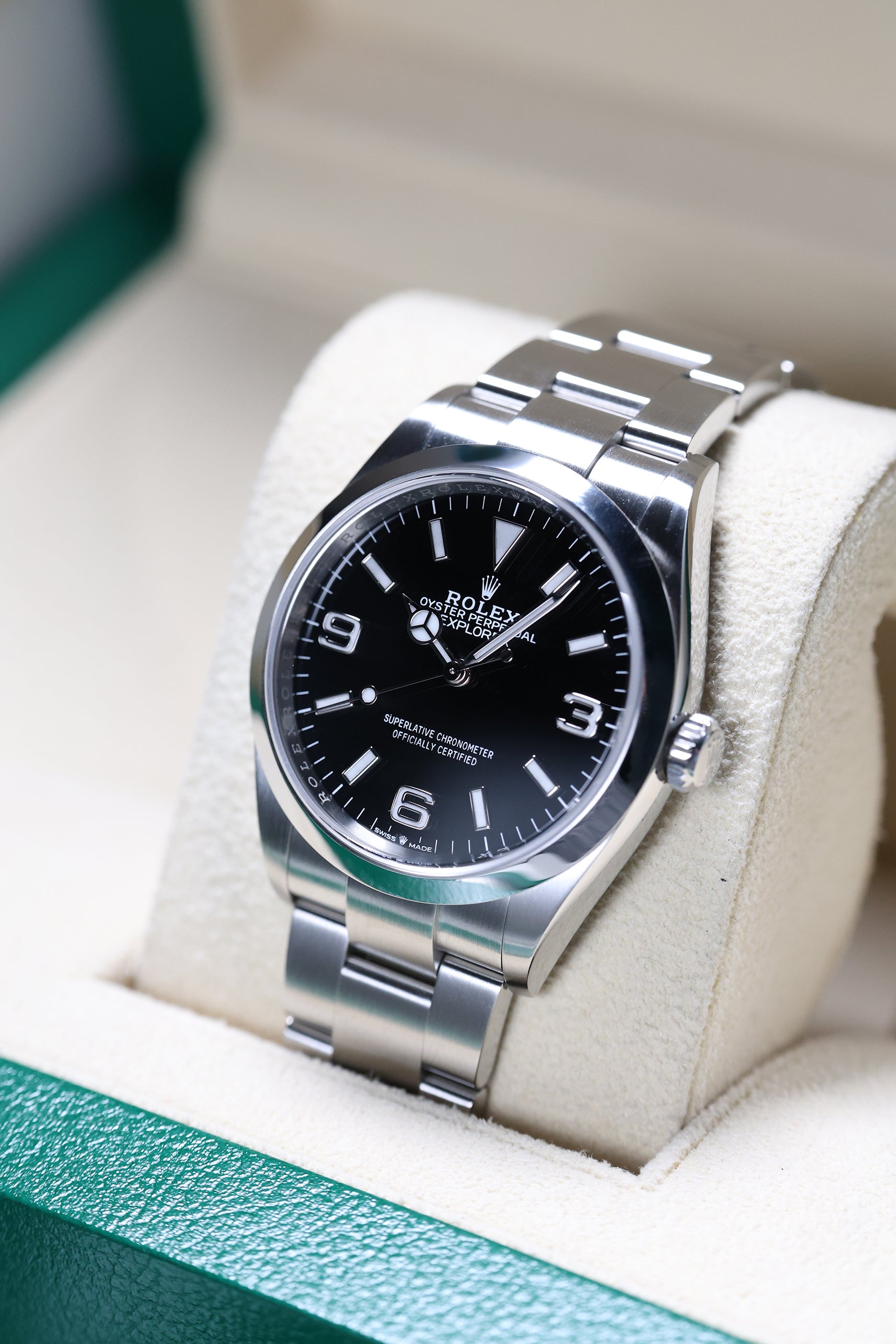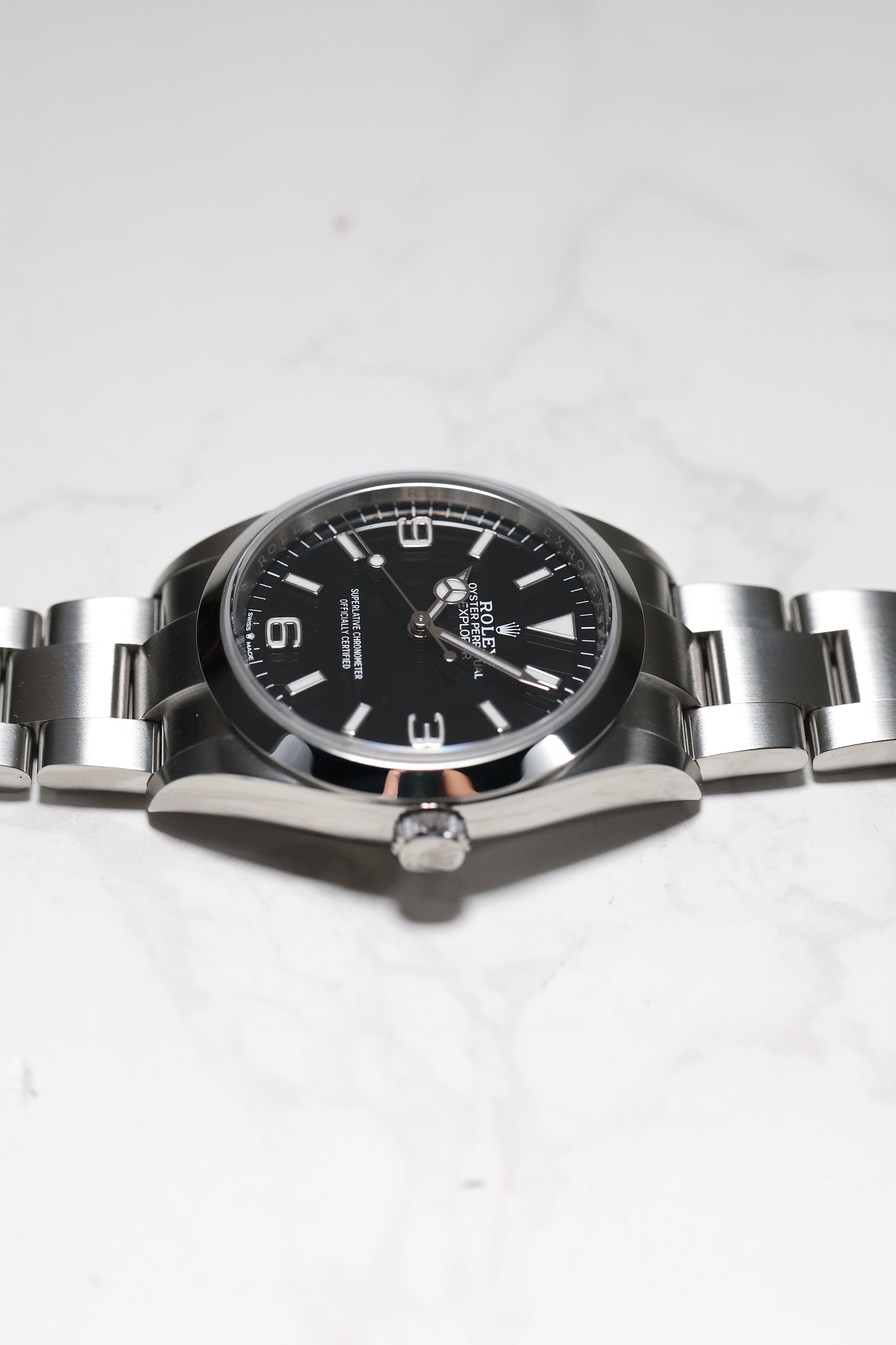 The watch comes on the sturdy Oyster bracelet, known for its durability and comfort. The Oysterlock clasp, paired with the Easylink extension system, allows for easy adjustments to ensure the perfect fit. The Rolex Explorer 1 reference 124270 remains a timeless, highly functional tool watch with a refined aesthetic, making it a must-have for collectors and enthusiasts alike. Its combination of heritage, performance, and elegance makes it a versatile choice for both daily wear and exploration.