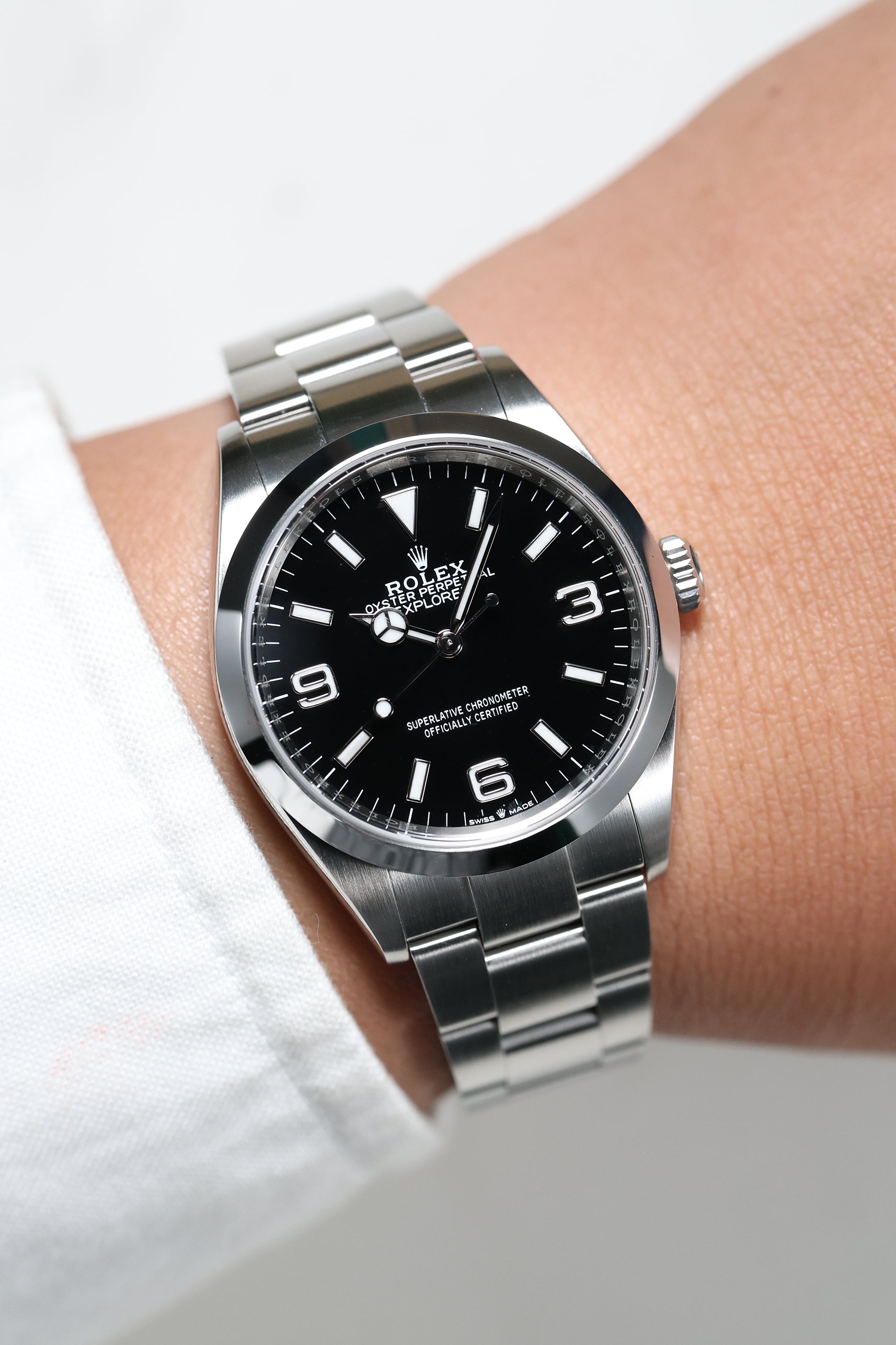 The Rolex Explorer 1, reference 124270, is a quintessential timepiece that reflects Rolex’s deep history of exploration and adventure. This model, introduced in 2021, maintains the classic 36mm case size, a nod to the original Explorer released in 1953. The 36mm sizing offers a versatile and comfortable fit, ideal for those who prefer a more traditional, understated wrist presence. Its compact proportions make it the perfect blend of elegance and rugged functionality, suited for both formal settings and outdoor expeditions.