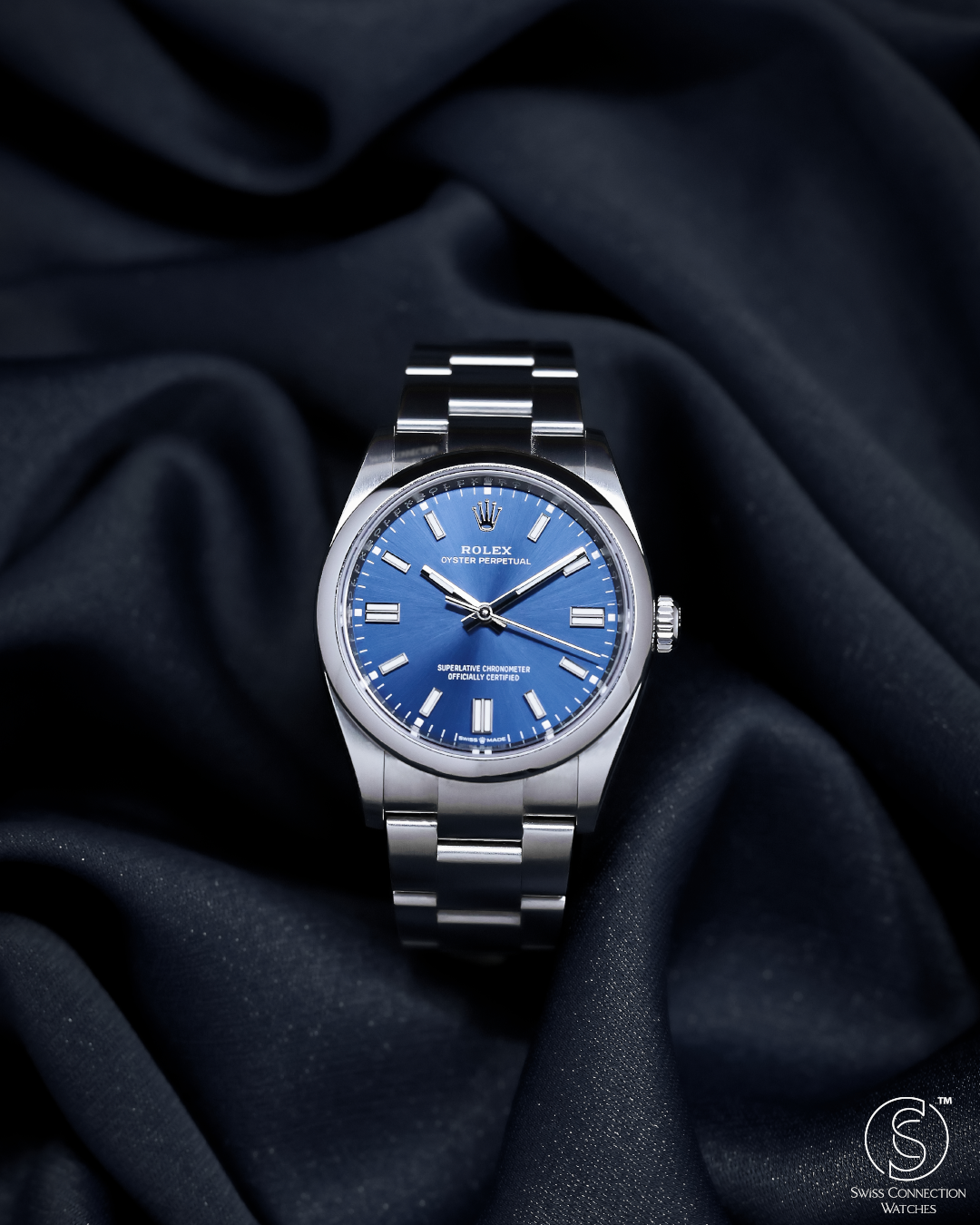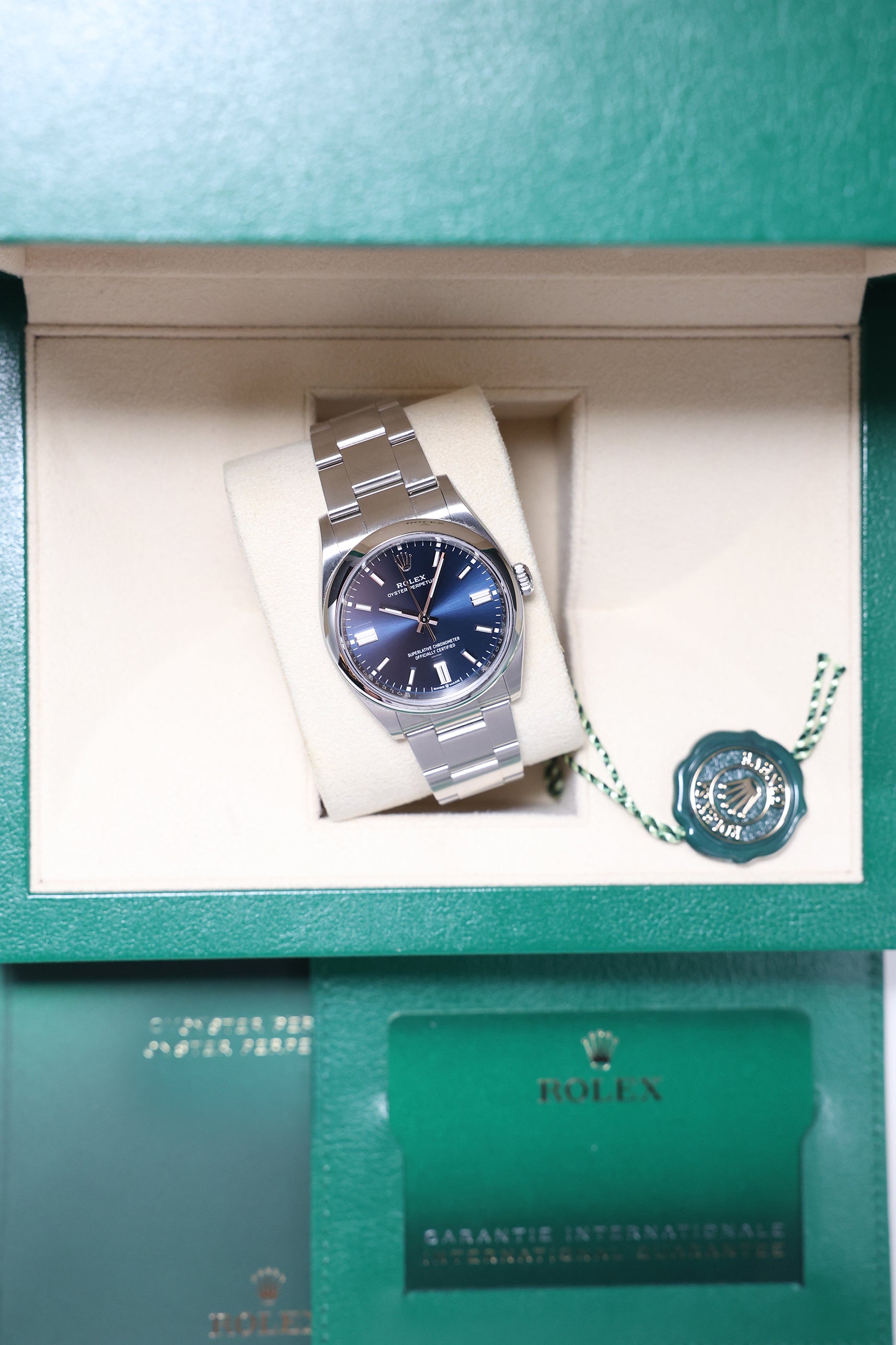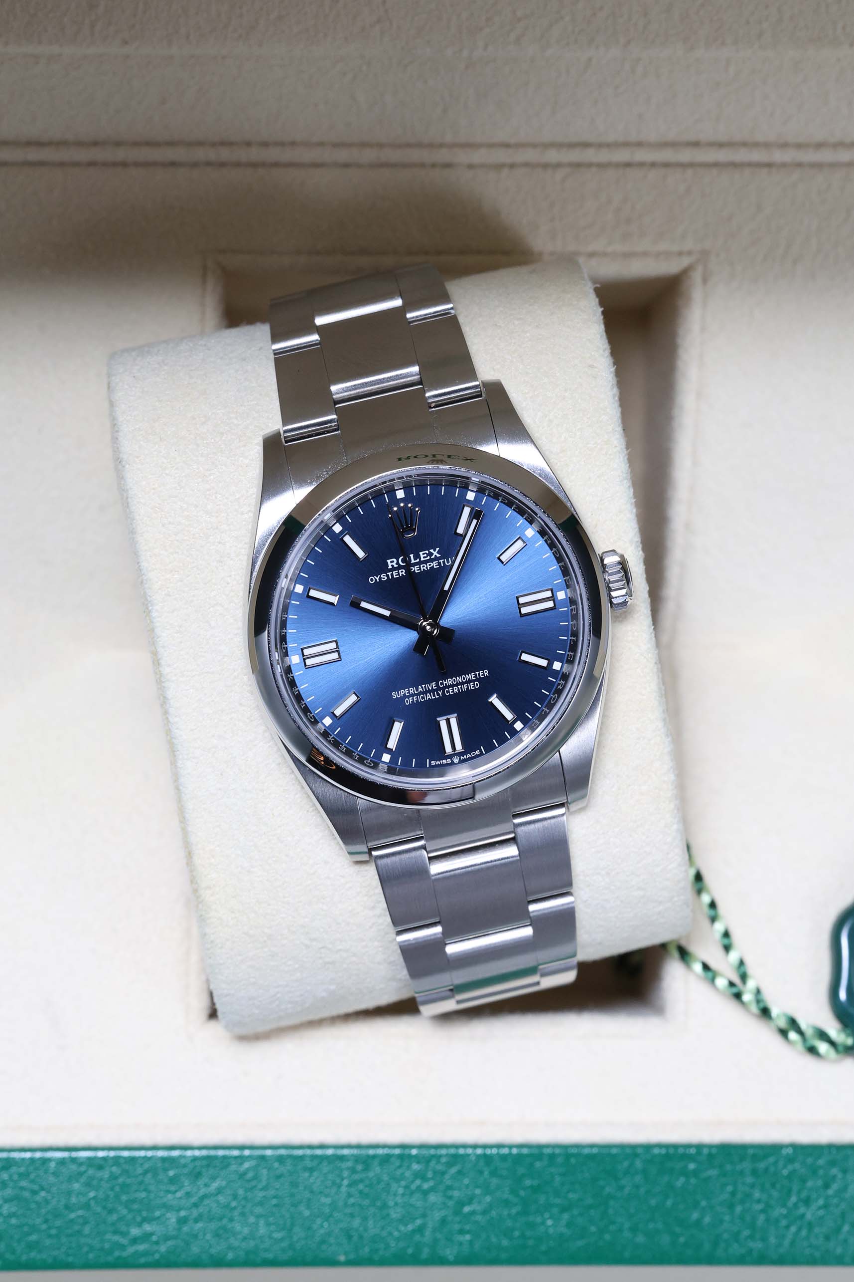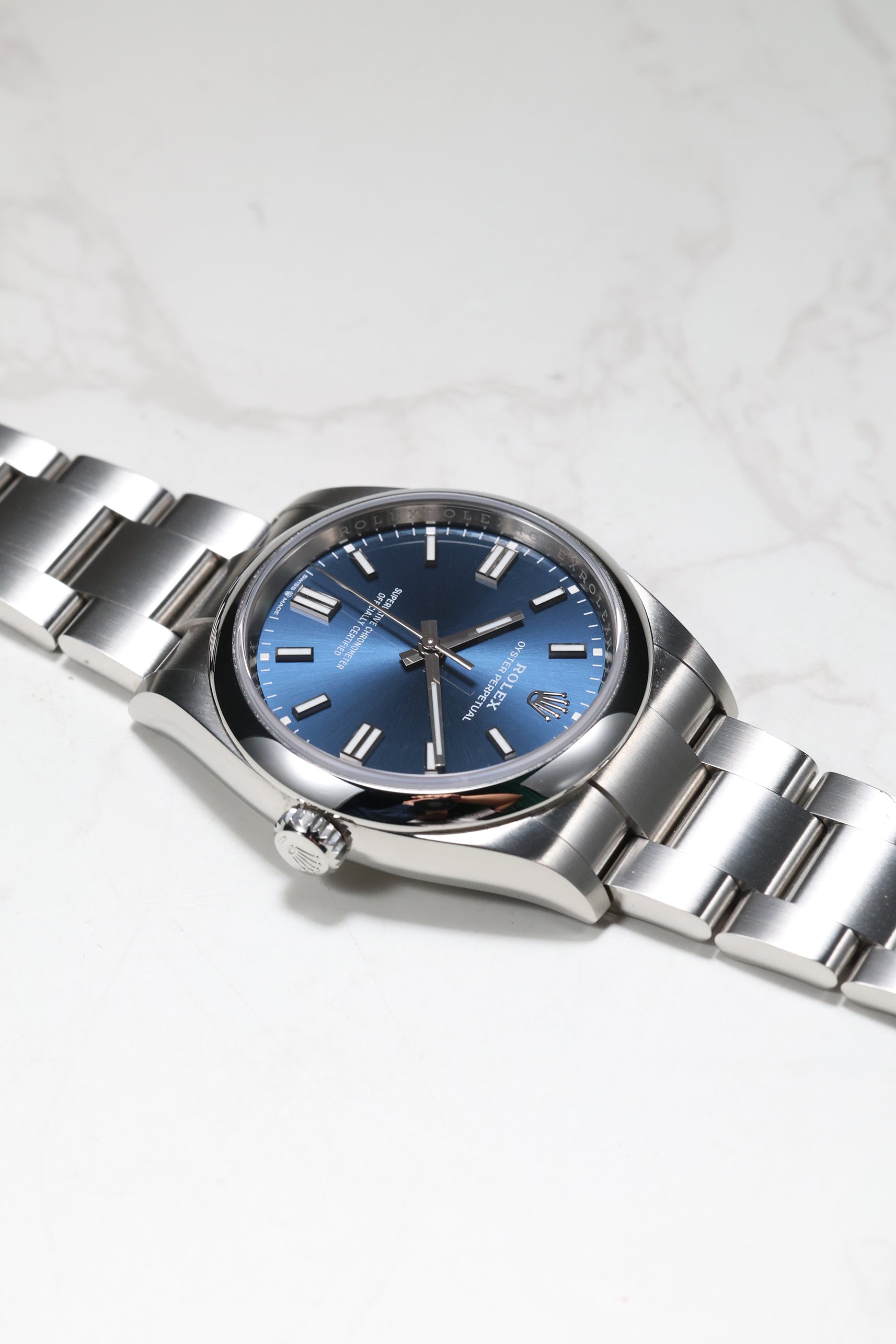 Powering the timepiece is Rolex's new-generation in-house automatic Calibre 3230. This movement guarantees exceptional precision, durability, and reliability, further reinforced by its Superlative Chronometer certification and a robust 70-hour power reserve. Importantly, the vibrant Bright Blue sunray dial is a discontinued reference, replaced by a matte blue finish, making this dynamic sunray iteration a particularly desirable classic that marks a celebrated period in the Oyster Perpetual's history.
