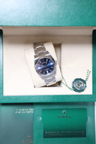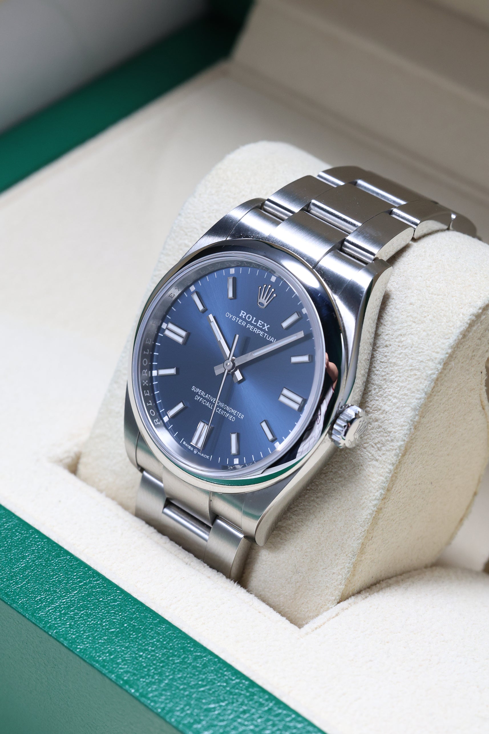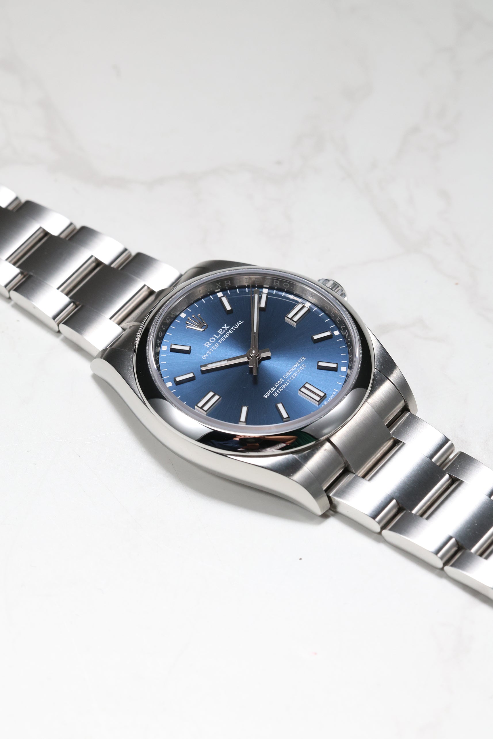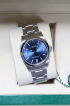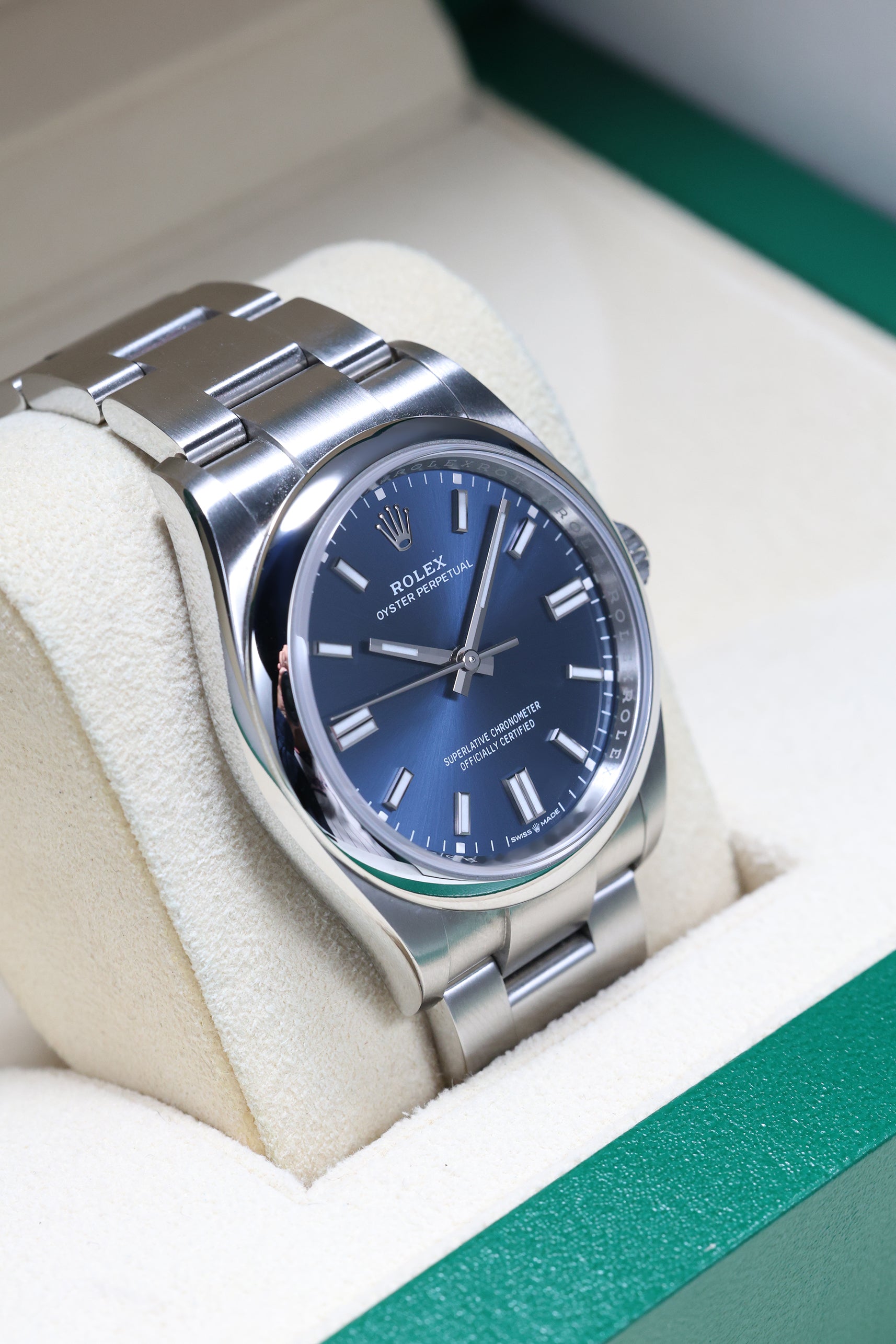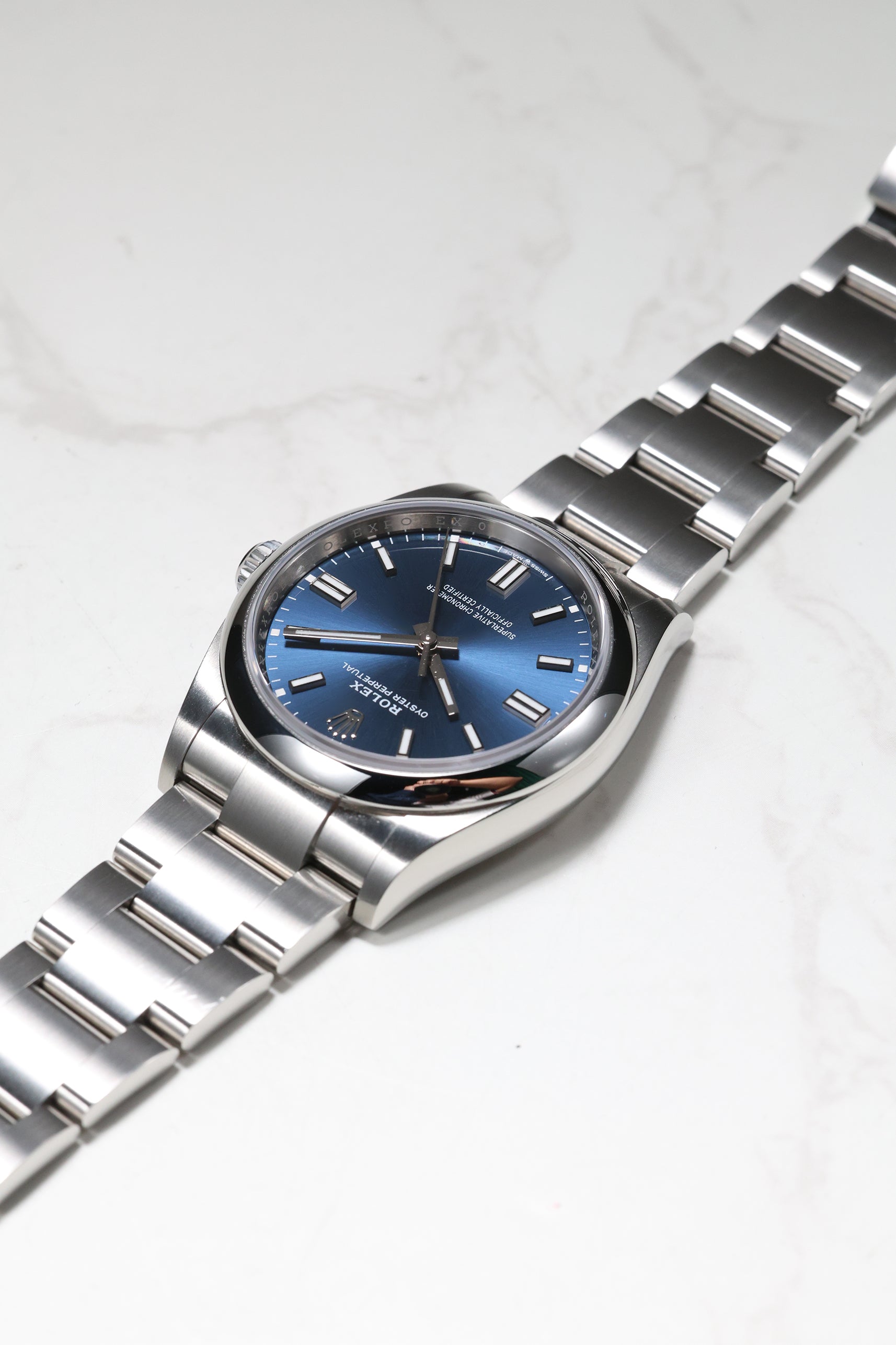 Powering the timepiece is Rolex's new-generation in-house automatic Calibre 3230. This movement guarantees exceptional precision, durability, and reliability, further reinforced by its Superlative Chronometer certification and a robust 70-hour power reserve. Importantly, the vibrant Bright Blue sunray dial is a discontinued reference, replaced by a matte blue finish, making this dynamic sunray iteration a particularly desirable classic that marks a celebrated period in the Oyster Perpetual's history.