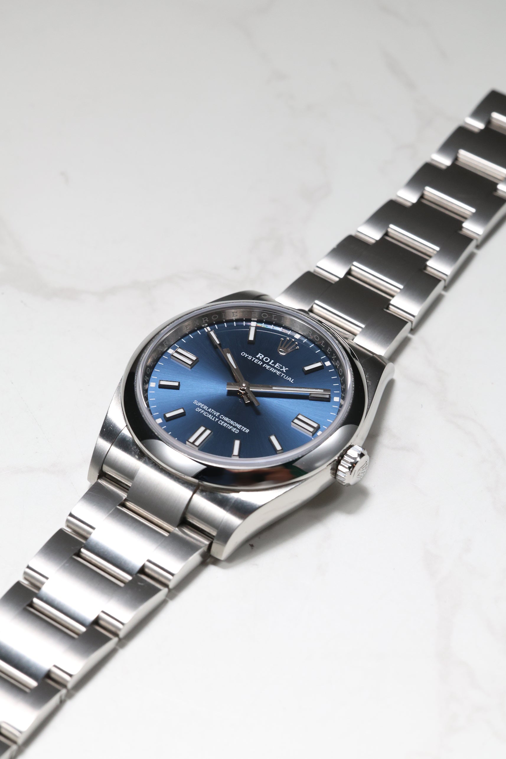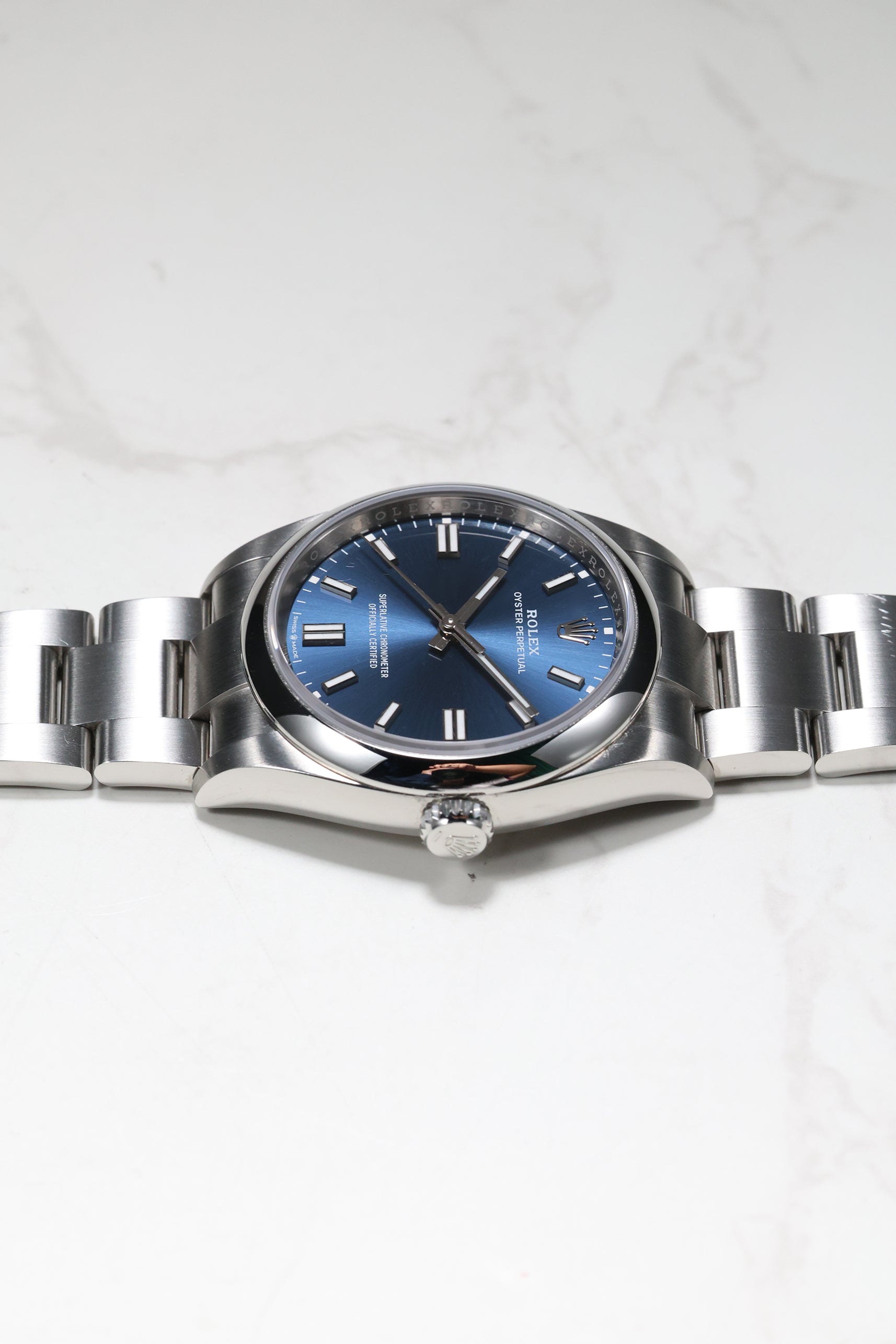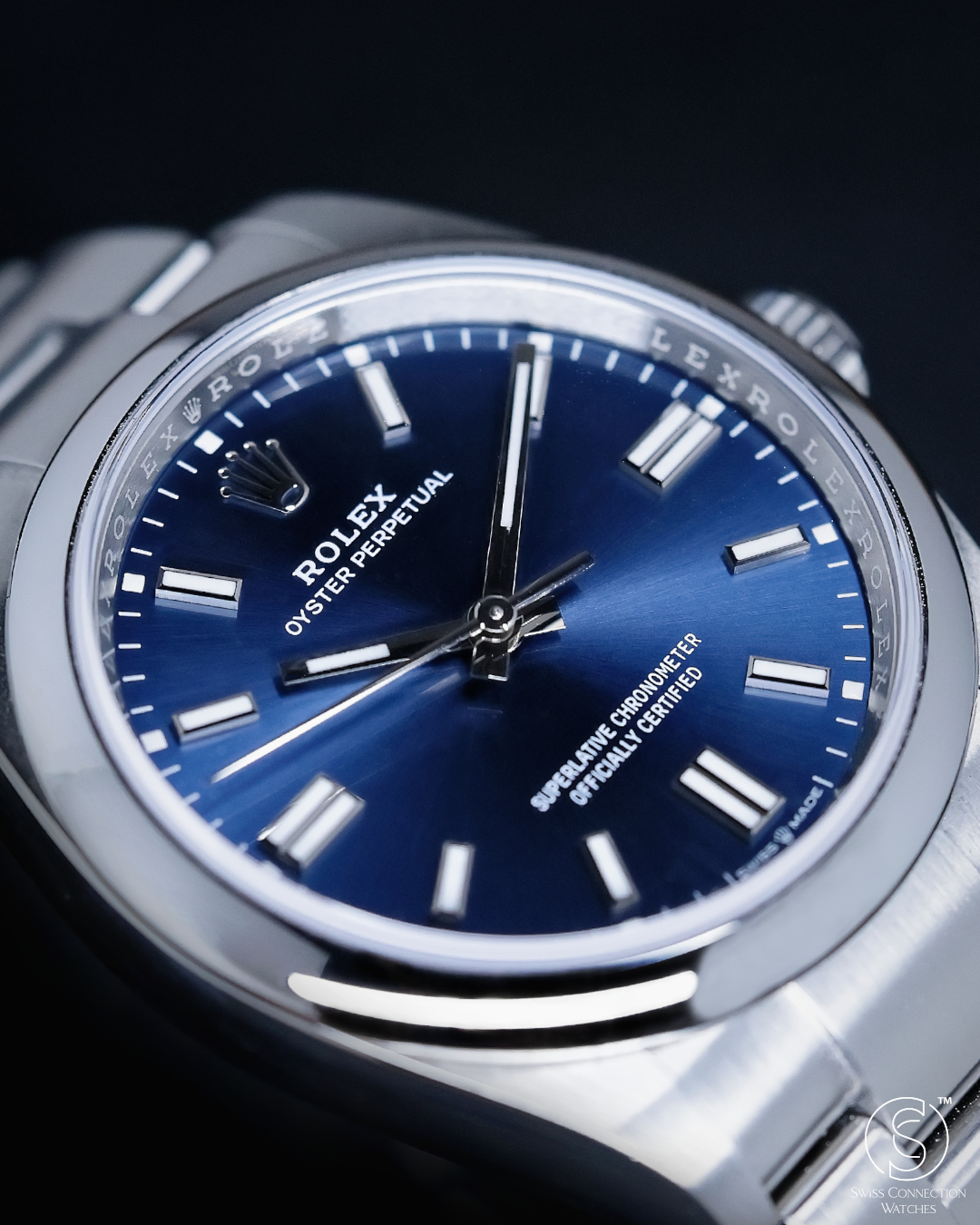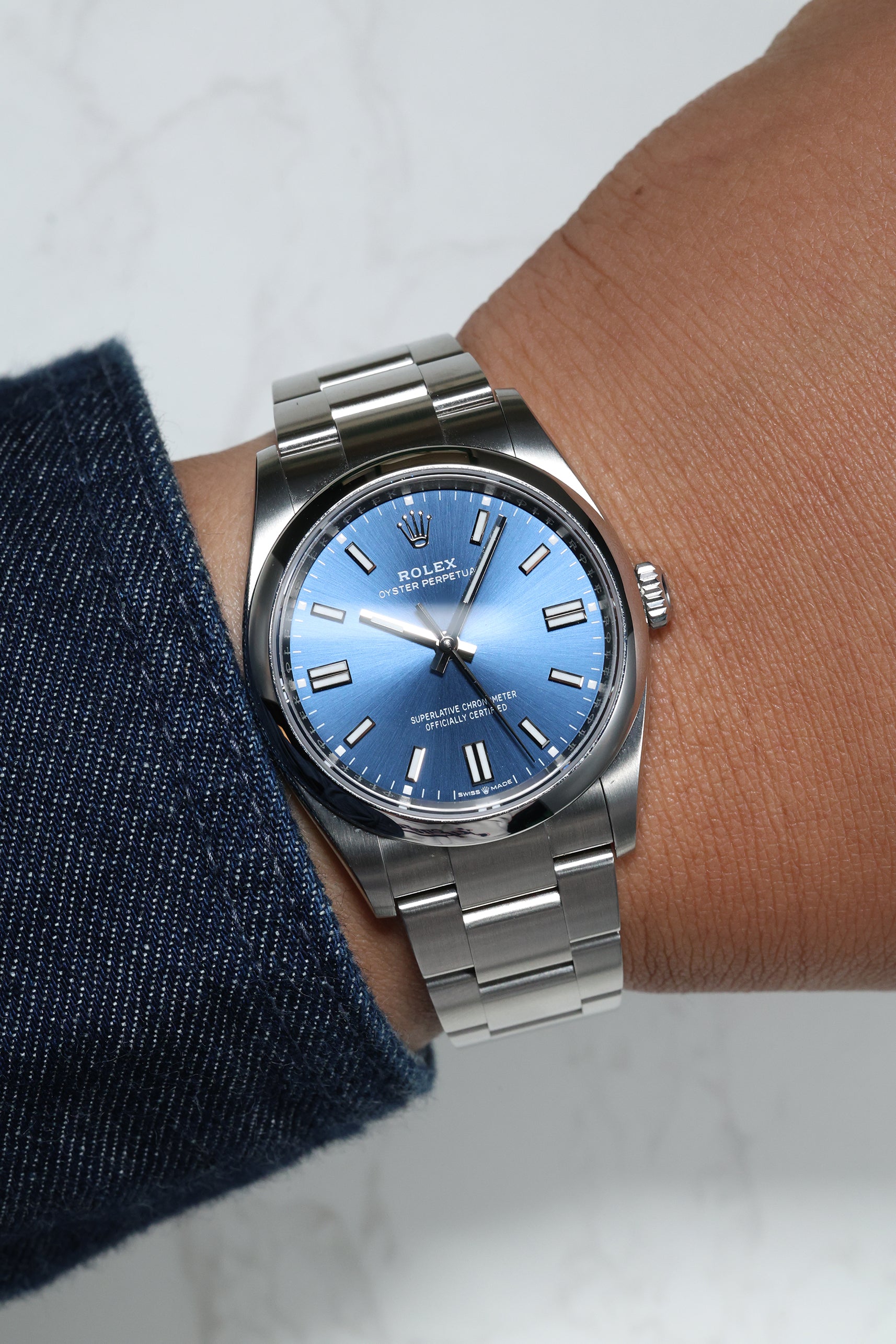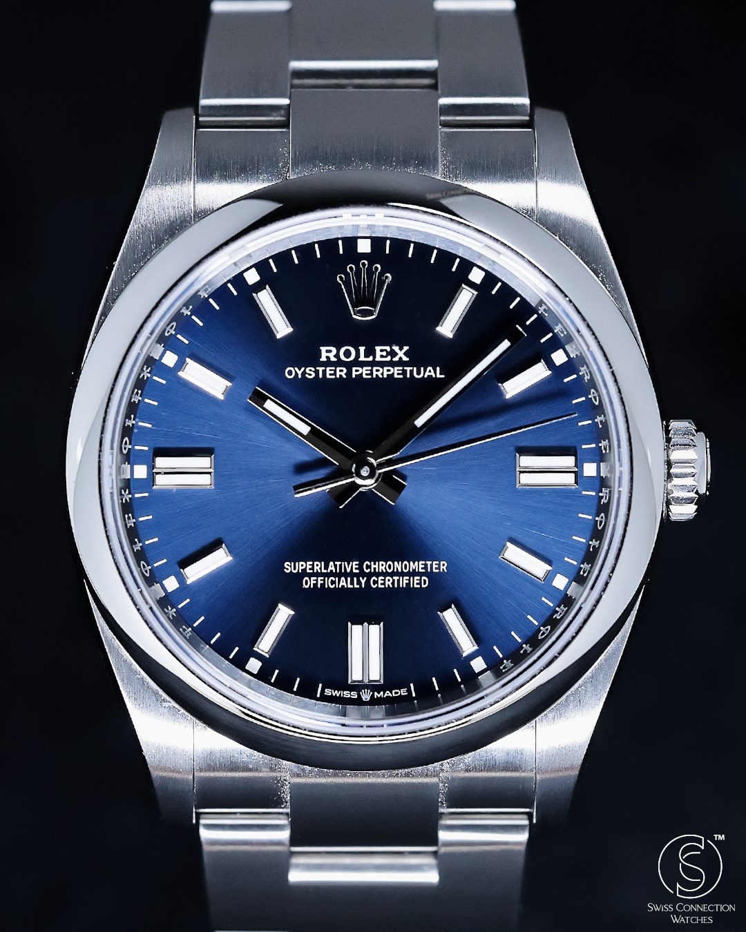 Powering the timepiece is Rolex's new-generation in-house automatic Calibre 3230. This movement guarantees exceptional precision, durability, and reliability, further reinforced by its Superlative Chronometer certification and a robust 70-hour power reserve. Importantly, the vibrant Bright Blue sunray dial is a discontinued reference, replaced by a matte blue finish, making this dynamic sunray iteration a particularly desirable classic that marks a celebrated period in the Oyster Perpetual's history.