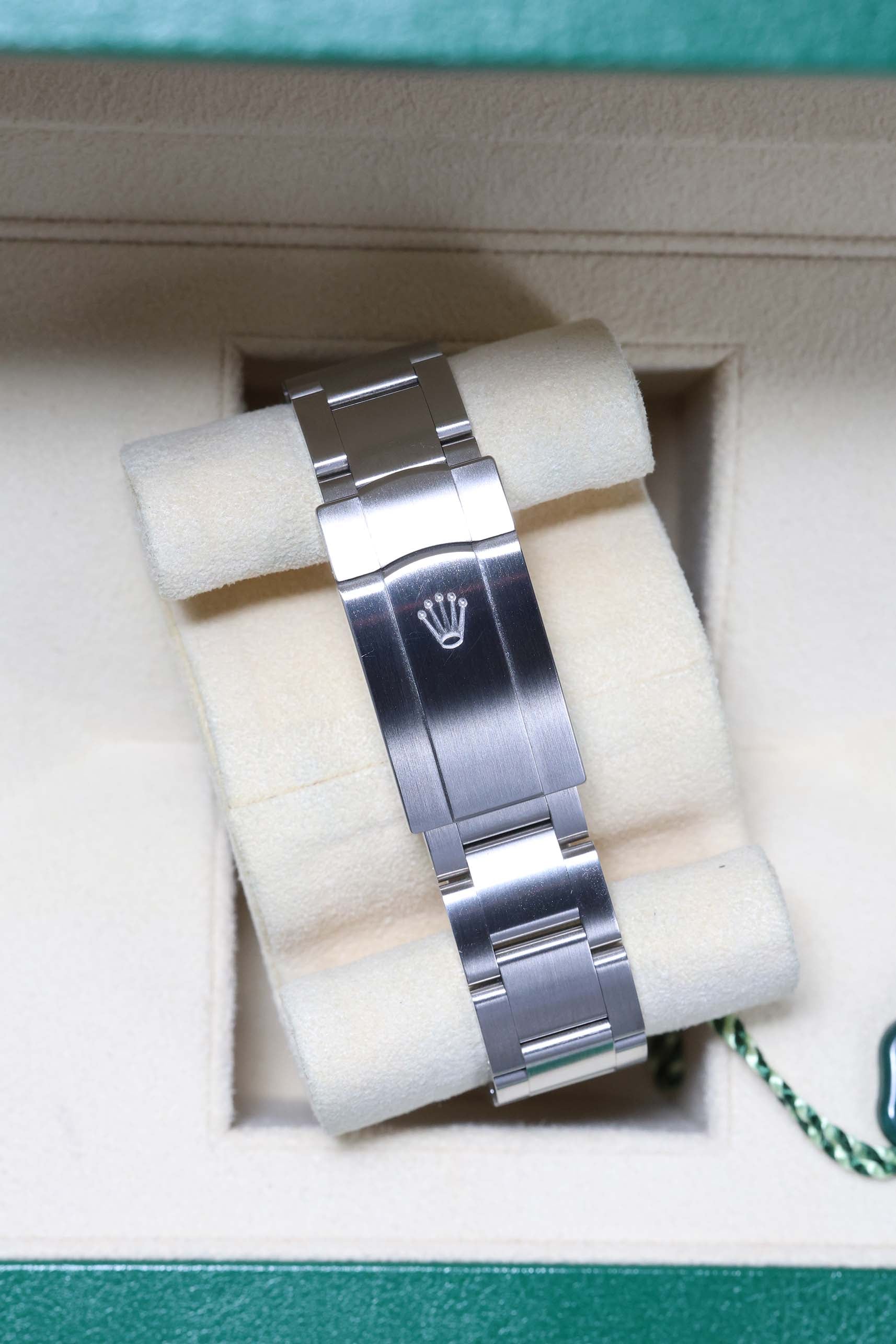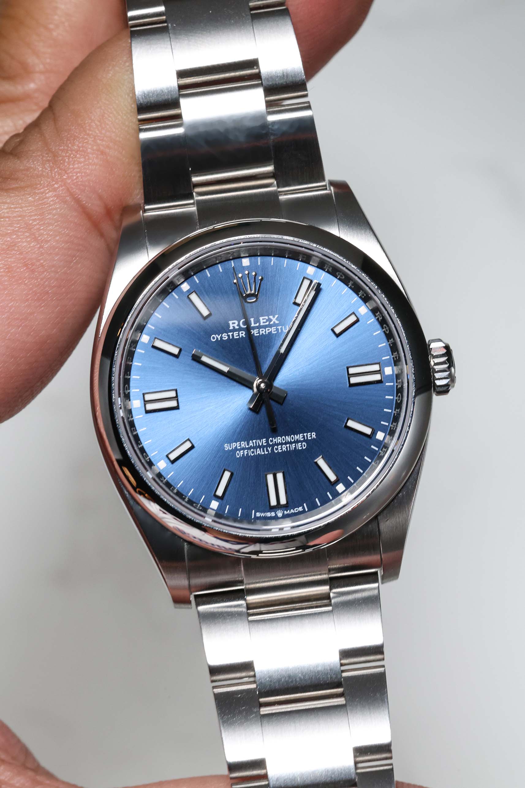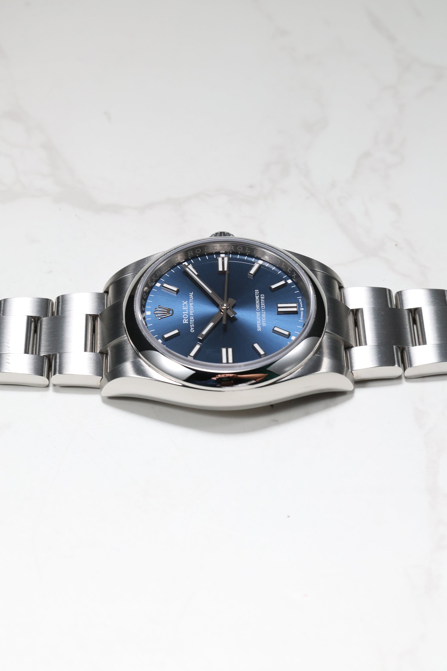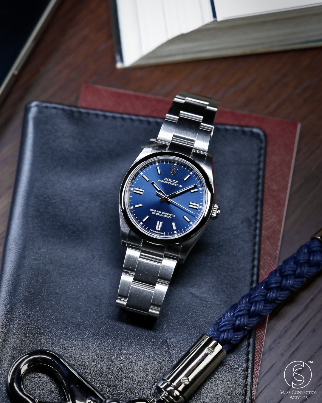 Powering the timepiece is Rolex's new-generation in-house automatic Calibre 3230. This movement guarantees exceptional precision, durability, and reliability, further reinforced by its Superlative Chronometer certification and a robust 70-hour power reserve. Importantly, the vibrant Bright Blue sunray dial is a discontinued reference, replaced by a matte blue finish, making this dynamic sunray iteration a particularly desirable classic that marks a celebrated period in the Oyster Perpetual's history.