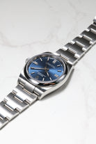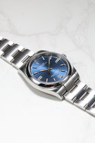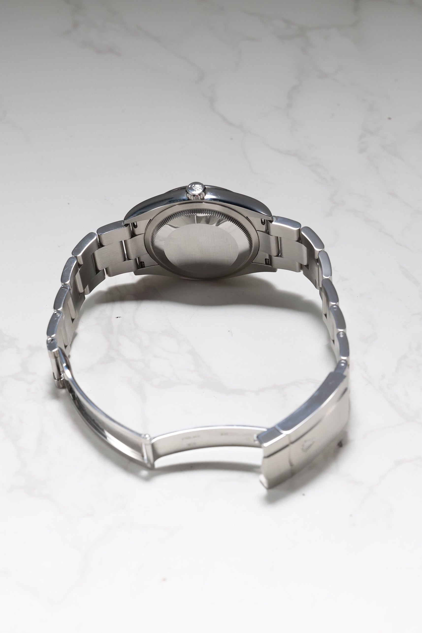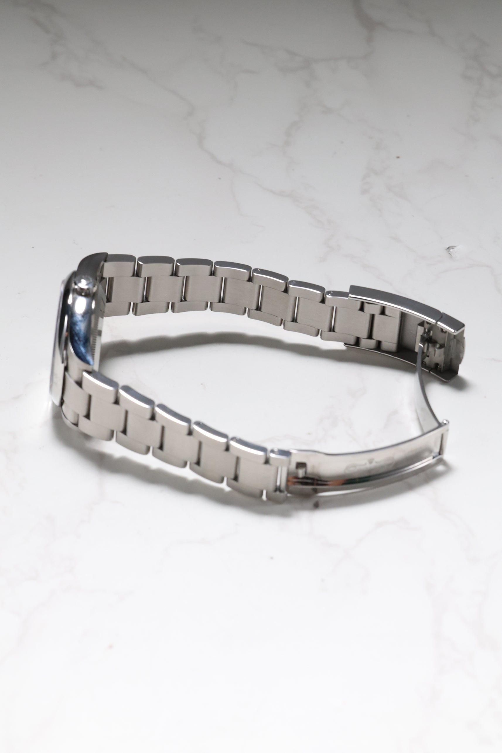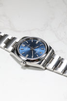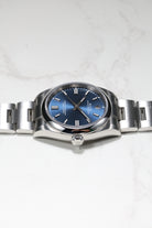 This specific configuration is highly sought after for its stunning Bright Blue dial, distinguished by a dynamic sunray finish—a key aesthetic now discontinued by Rolex. This refined detail allows the dial to play spectacularly with light, shifting tones and offering a vibrant, dynamic aesthetic that perfectly complements its versatile nature. The watch features the iconic Oyster case, crafted from robust Oystersteel, ensuring a comfortable and durable fit for daily wear while maintaining an effortlessly refined look that prioritizes clarity and harmony.