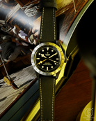The watch is fitted with a unique hybrid rubber and leather strap, offering a distinct blend of rugged durability and refined comfort. This innovative strap provides both a secure and supple feel on the wrist, perfectly complementing the watch's sporty yet sophisticated character. It's designed to seamlessly transition from active pursuits to more relaxed settings, ensuring both resilience and style.