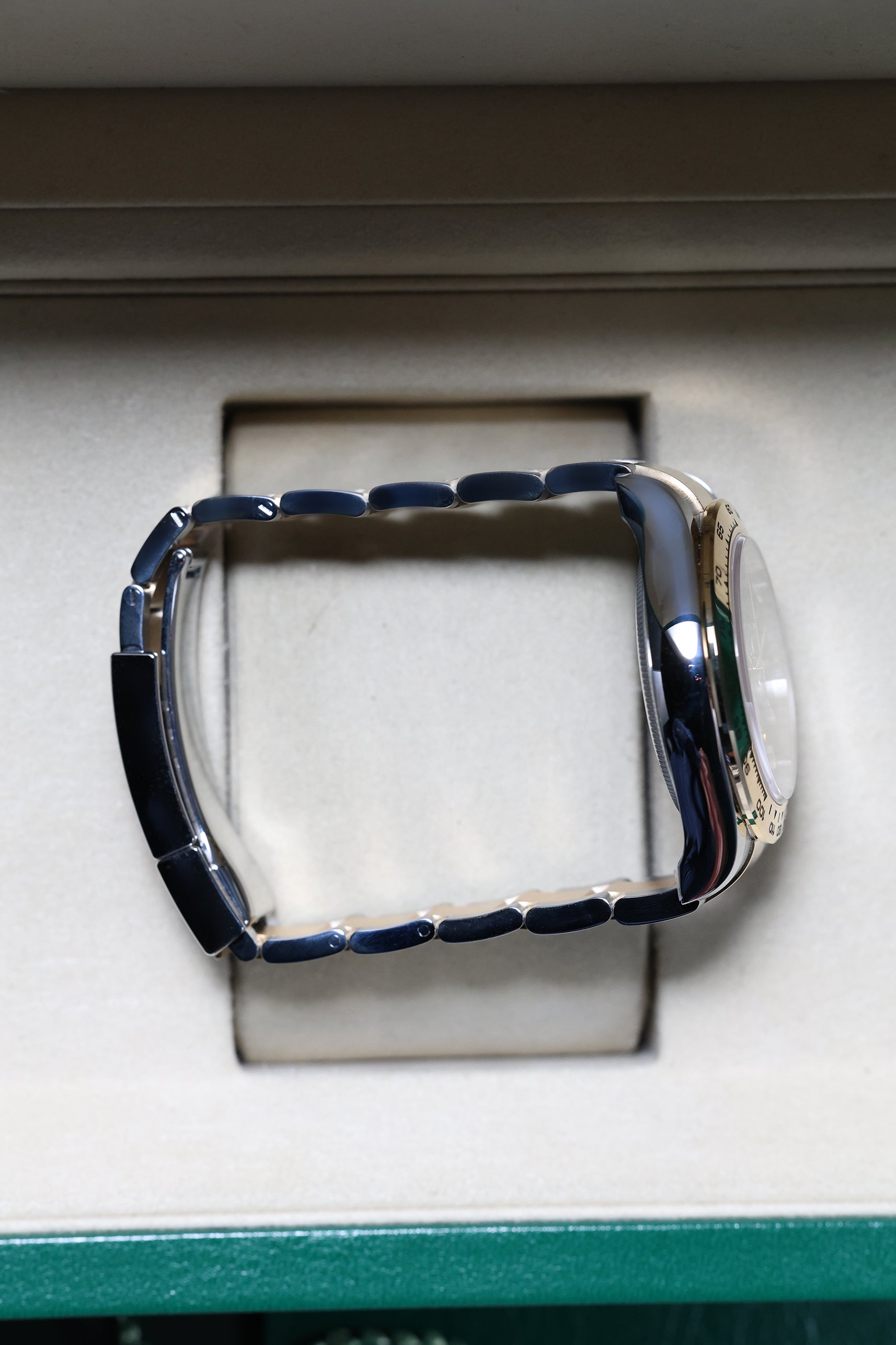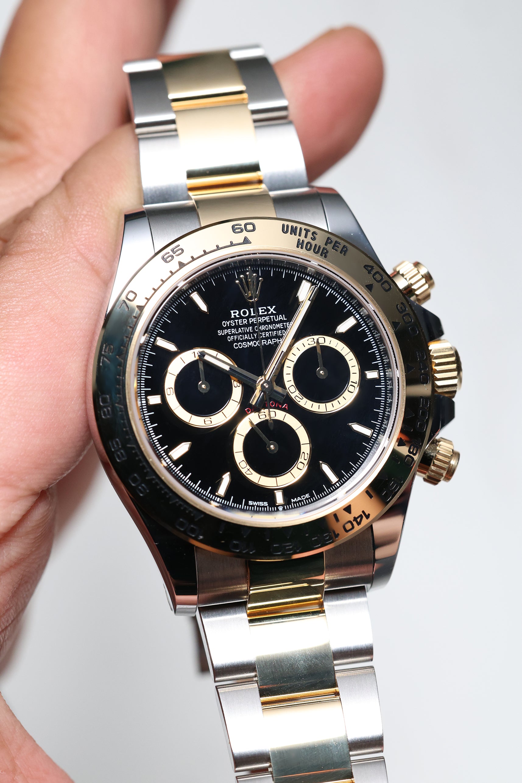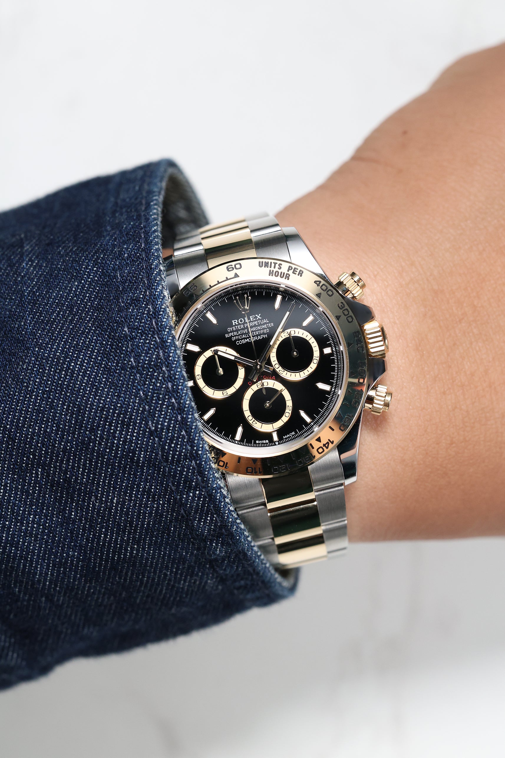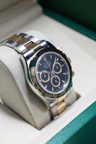 The 126503 builds on this legacy with the new-generation design, subtly refining the 40mm case and Oyster bracelet for an even more ergonomic and comfortable fit. The watch is instantly recognizable by its signature 18k yellow gold bezel, engraved with the iconic tachymeter scale that defines the Daytona’s racing pedigree. This fusion of steel and gold offers a visually striking and luxurious yet robust presence on the wrist.