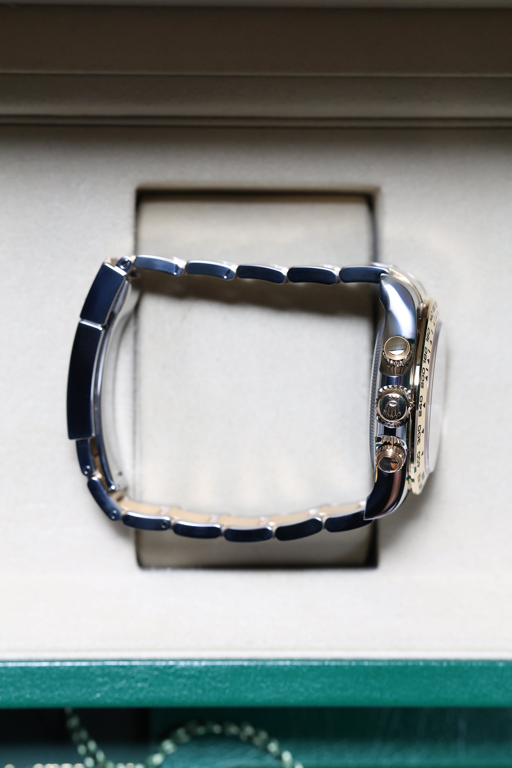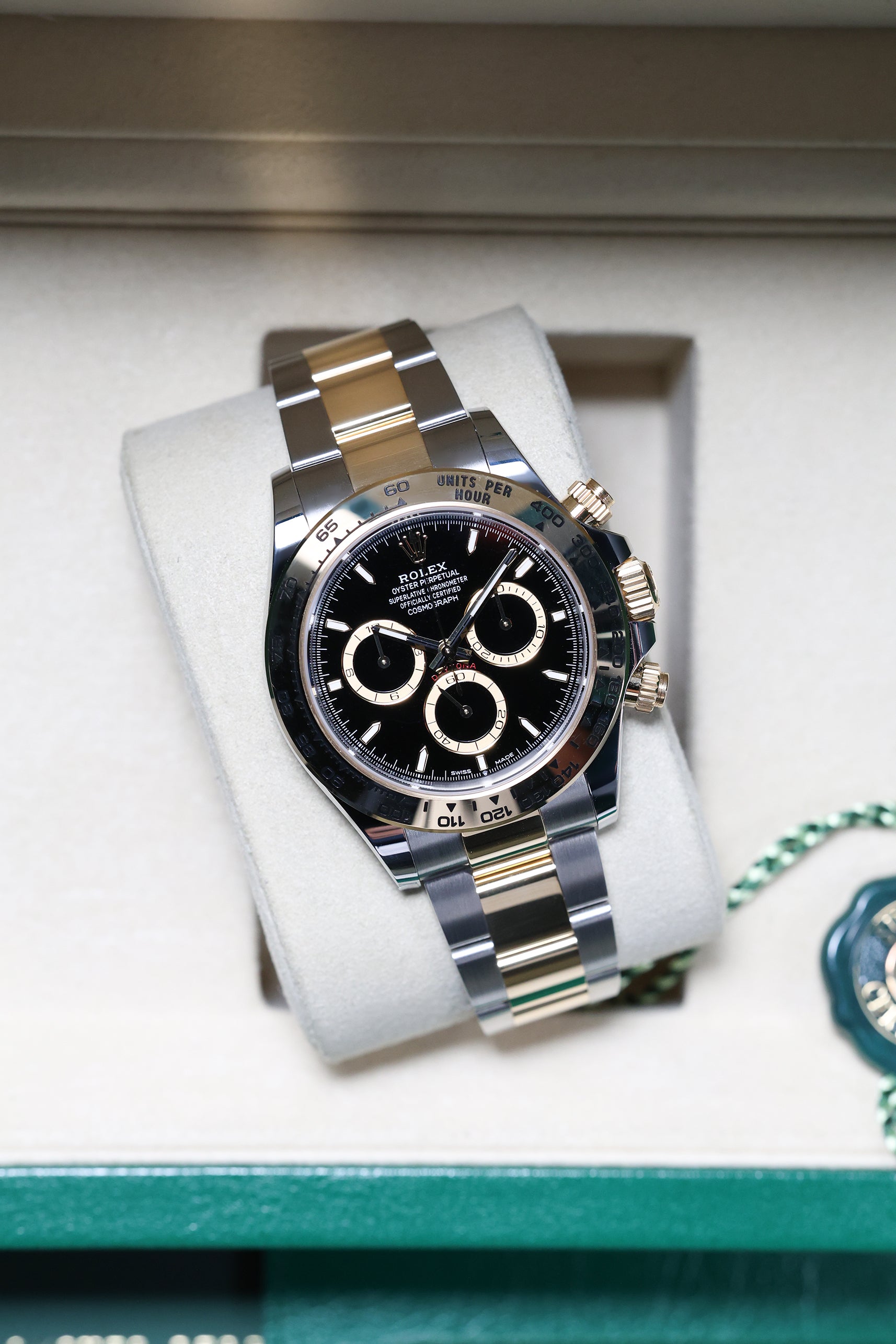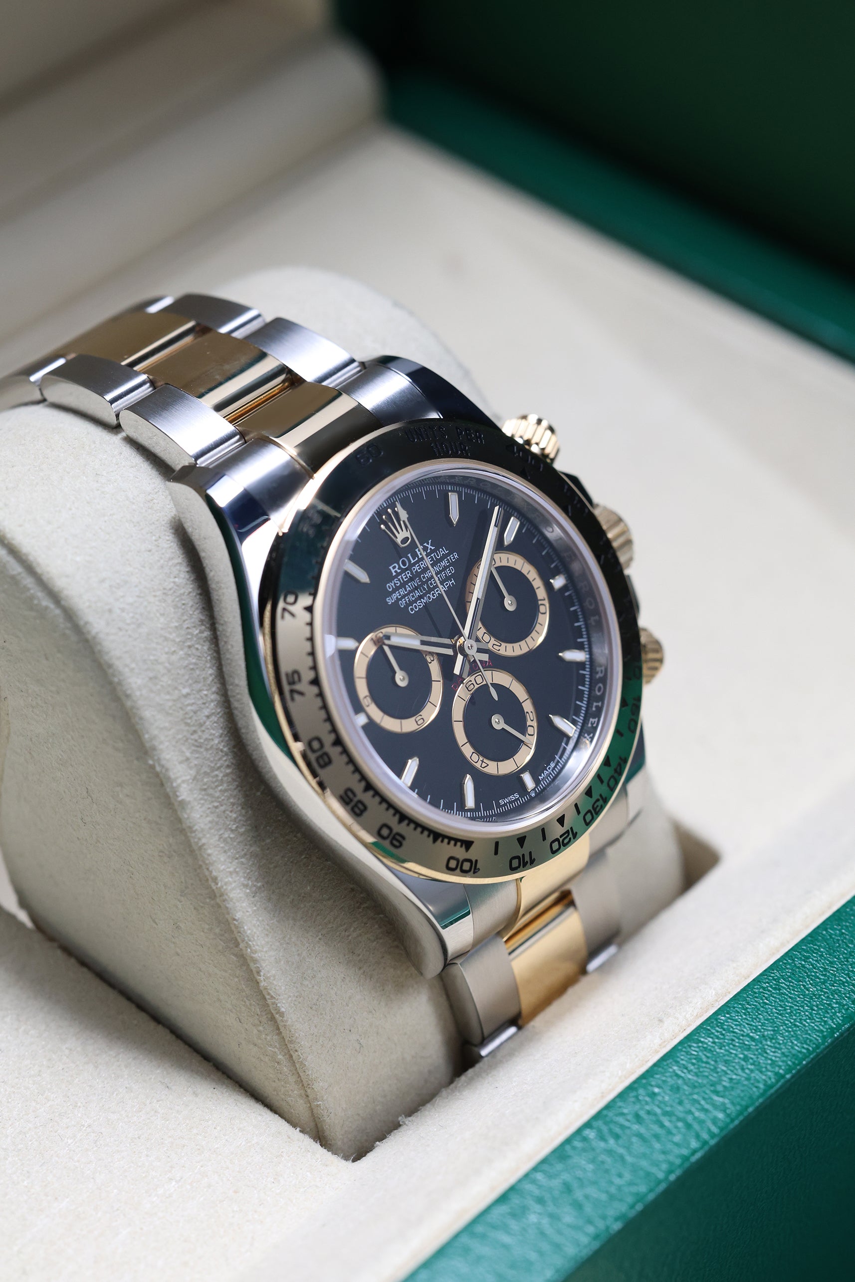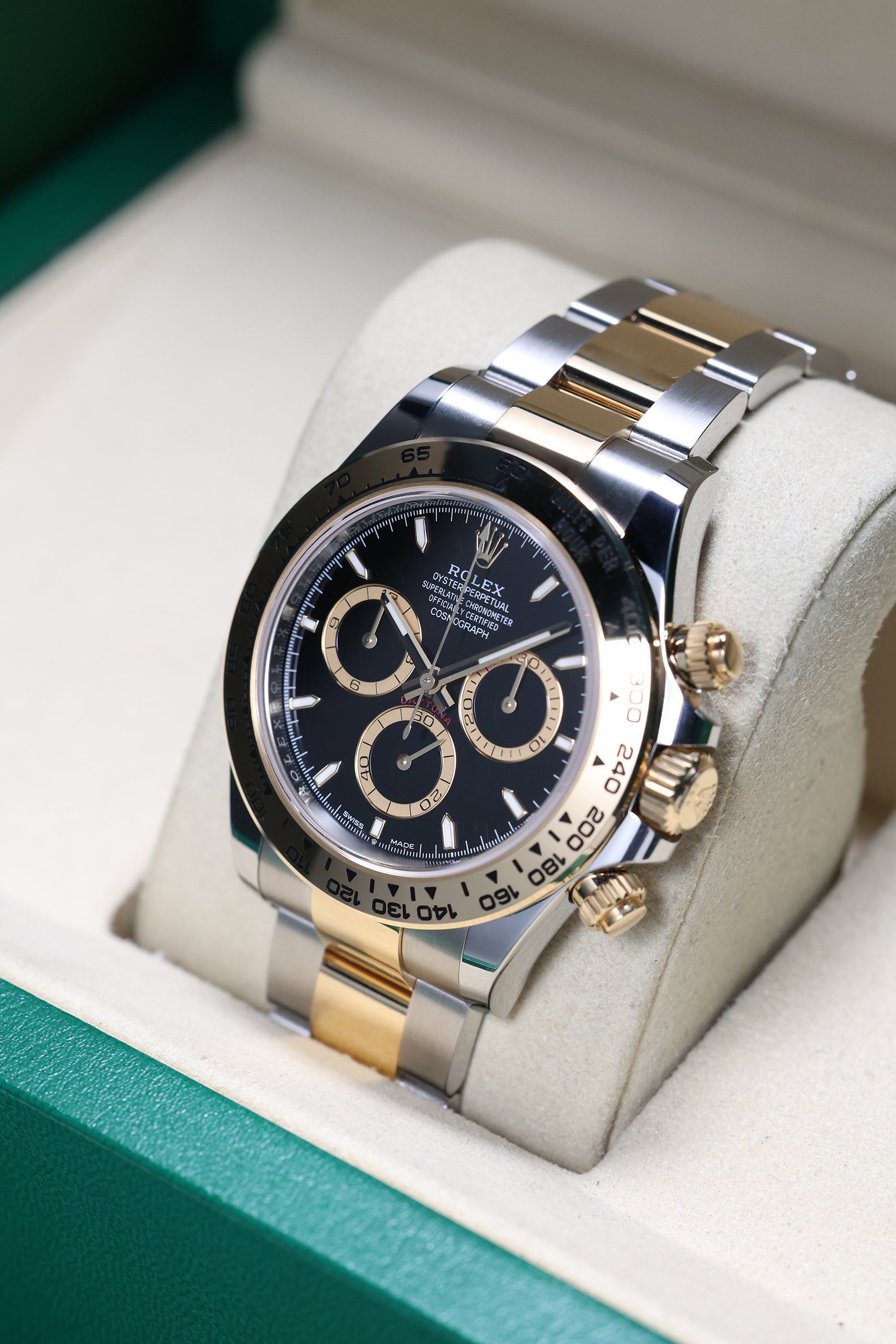 Powering the 126503 is Rolex's new-generation in-house Calibre 4131 automatic chronograph movement. This updated caliber features a column wheel and vertical clutch for precise timing, along with an impressive 72-hour power reserve. As a certified Superlative Chronometer, the movement reflects Rolex’s unwavering commitment to precision and reliability. The Yellow Rolesor Daytona stands as a testament to Rolex’s ability to innovate while honoring its iconic past, solidifying its place as a must-have for discerning collectors.