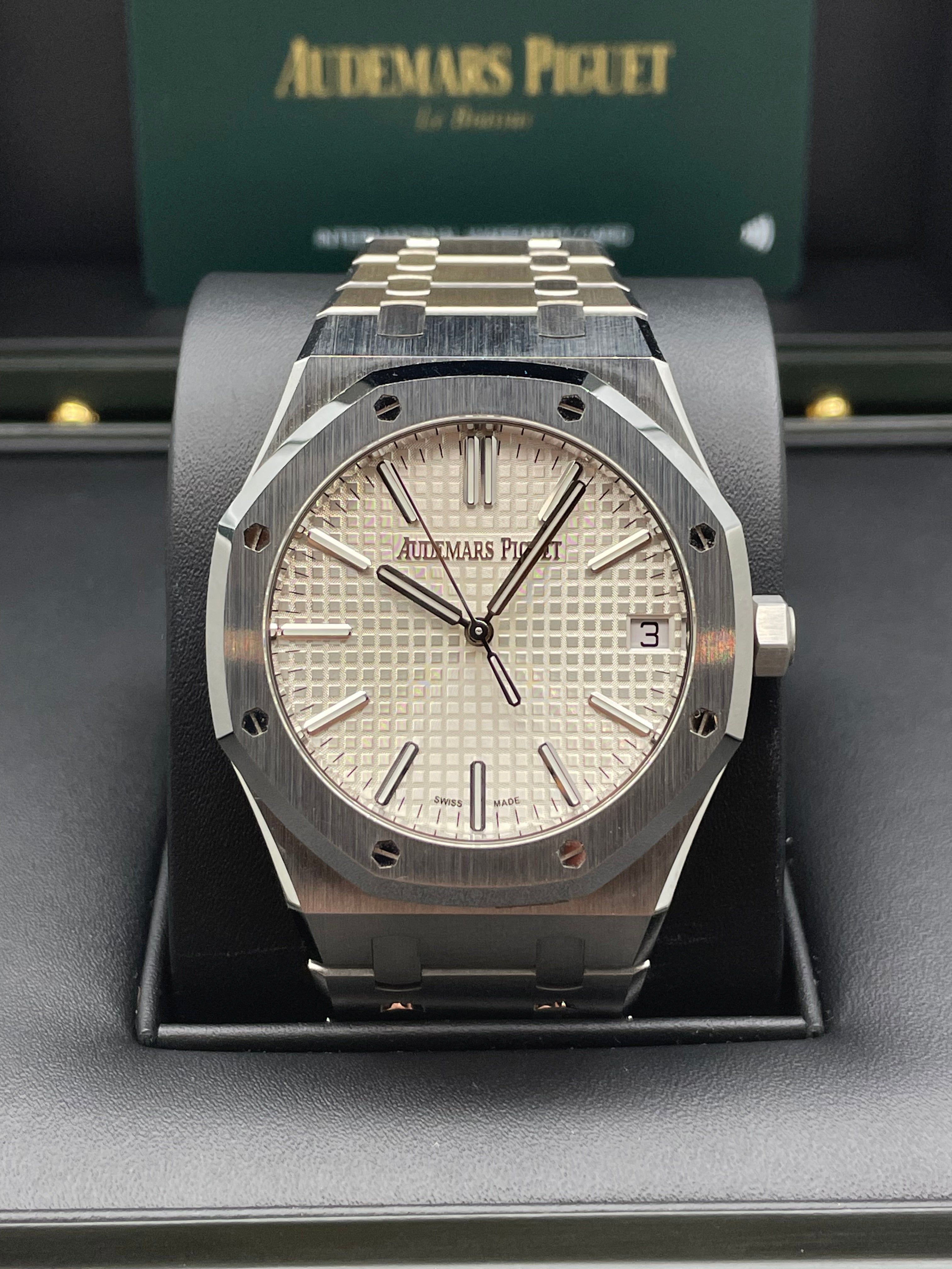 At 41mm in stainless steel, the 15510ST features Audemars Piguet’s signature brushed and polished case finishing, emphasizing sharp angles and flawless craftsmanship. The silver-toned dial, adorned with the iconic "Grande Tapisserie" pattern, creates a sophisticated, textured backdrop that plays beautifully with light. The applied white gold hour markers and Royal Oak hands, both filled with luminescent material, ensure clarity and legibility, while the date window at 3 o’clock integrates seamlessly, maintaining the dial’s balanced proportions.