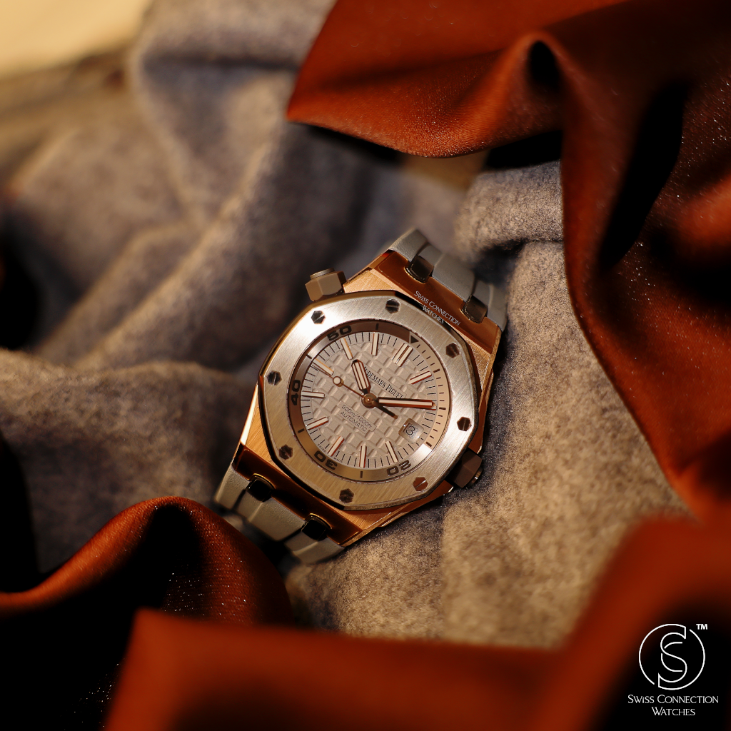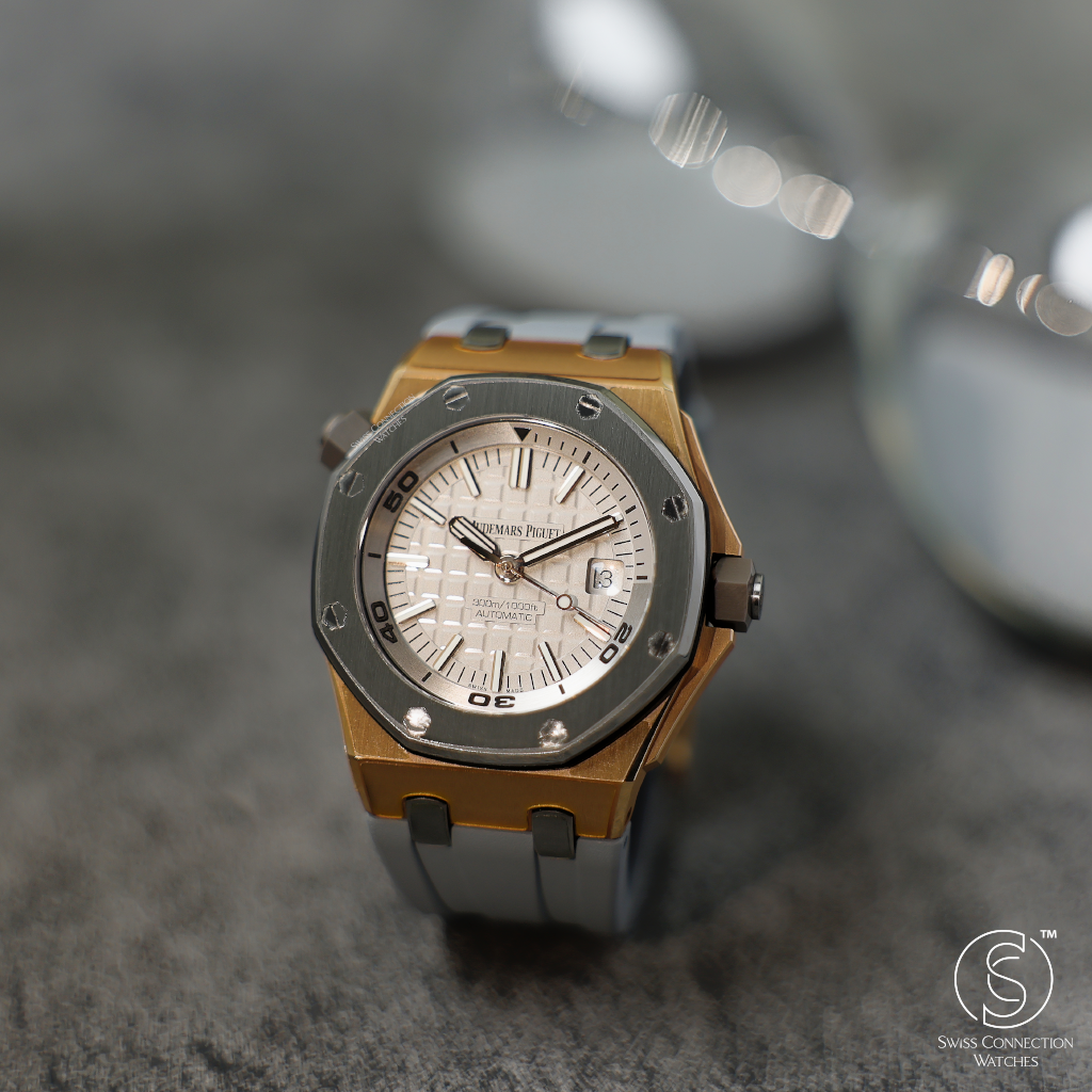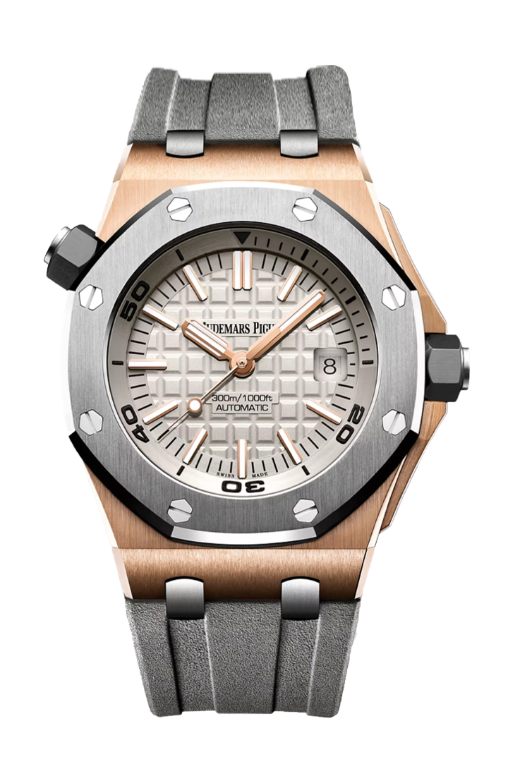 The grey dial, with its signature "Méga Tapisserie" pattern, provides a sophisticated yet functional canvas. The pink gold applied hour markers and Royal Oak hands, generously filled with luminescence, ensure exceptional legibility, even in the darkest underwater conditions. This thoughtful design highlights AP's commitment to both form and function, ensuring that its luxurious elements don't detract from its primary purpose as a serious diver. The inner rotating bezel, controlled by a dedicated crown, further underscores its professional utility.