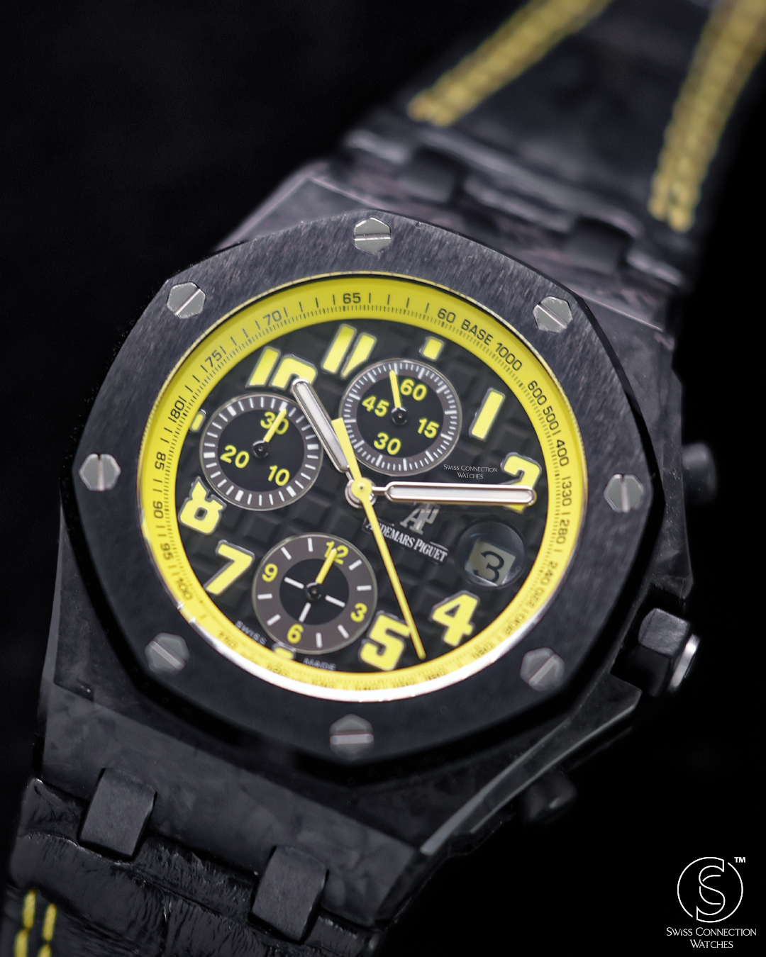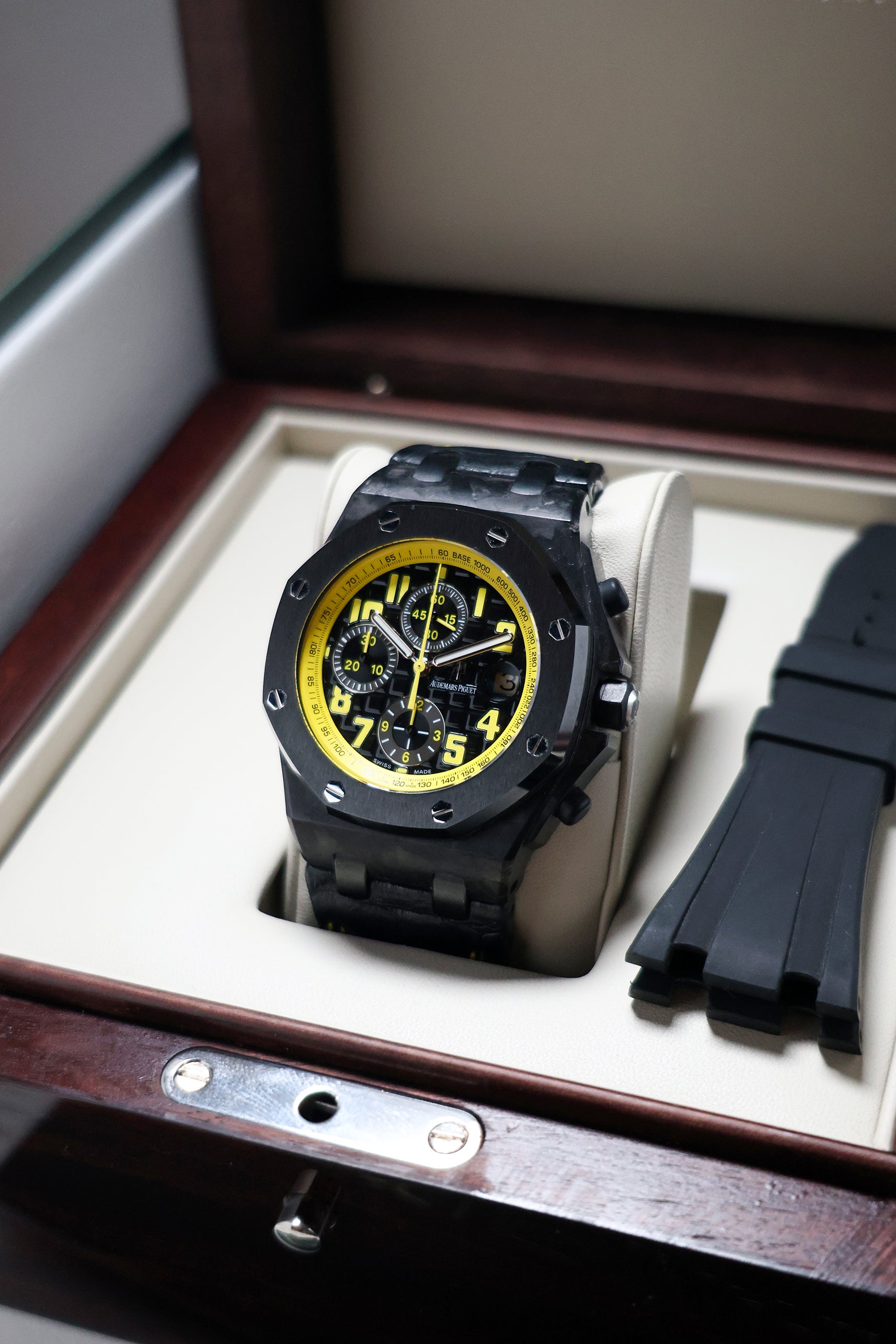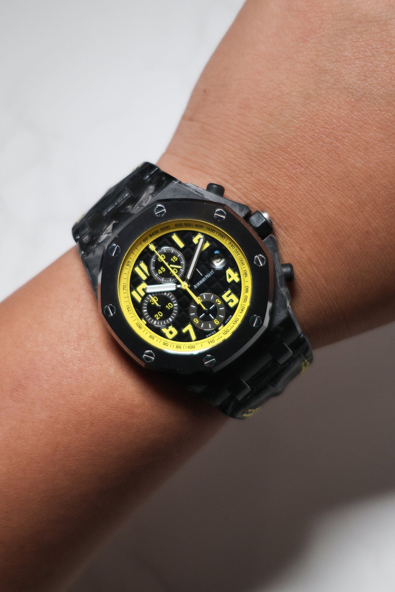 Central to its allure is the Forged Carbon case, a proprietary material that was at the cutting edge of watchmaking innovation at its debut. Lightweight, incredibly durable, and visually dynamic, Forged Carbon imparts an almost organic, subtly marbled texture to the 42mm case, unlike anything seen in traditional horology. This material is now exclusive to AP's legacy, as the brand no longer produces watches using it. It's brilliantly paired with a black ceramic bezel and yellow tachymeter, creating a powerful interplay of structure and high-contrast visuals that amplify the watch's bold, technical aesthetic.