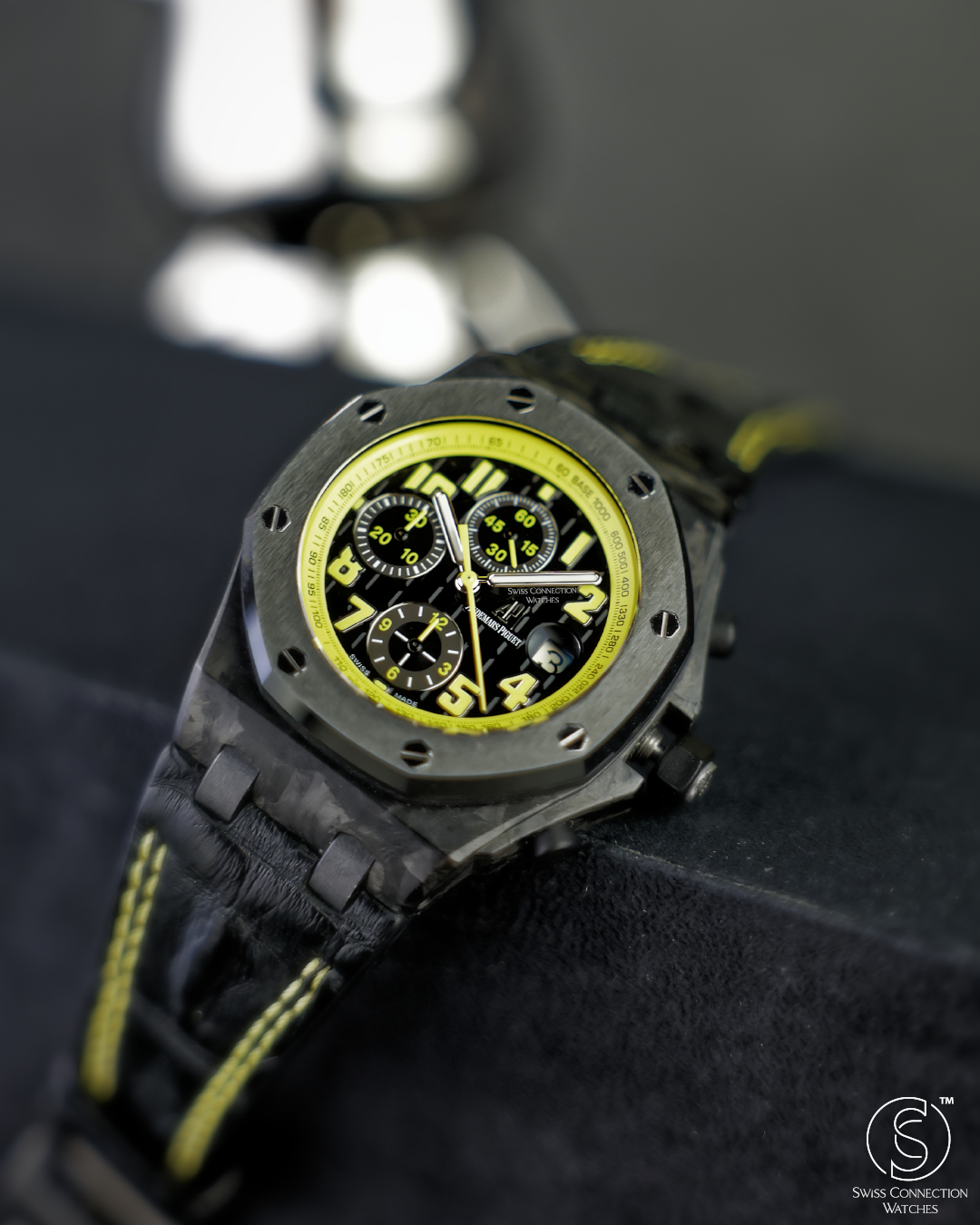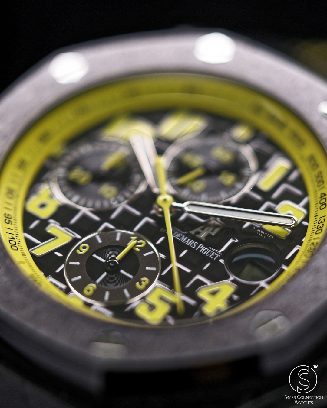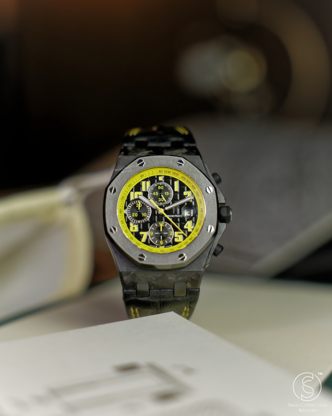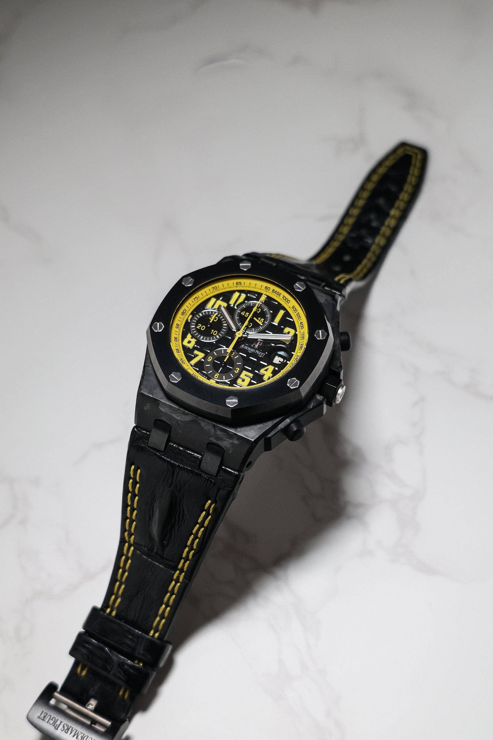 Central to its allure is the Forged Carbon case, a proprietary material that was at the cutting edge of watchmaking innovation at its debut. Lightweight, incredibly durable, and visually dynamic, Forged Carbon imparts an almost organic, subtly marbled texture to the 42mm case, unlike anything seen in traditional horology. This material is now exclusive to AP's legacy, as the brand no longer produces watches using it. It's brilliantly paired with a black ceramic bezel and yellow tachymeter, creating a powerful interplay of structure and high-contrast visuals that amplify the watch's bold, technical aesthetic.
