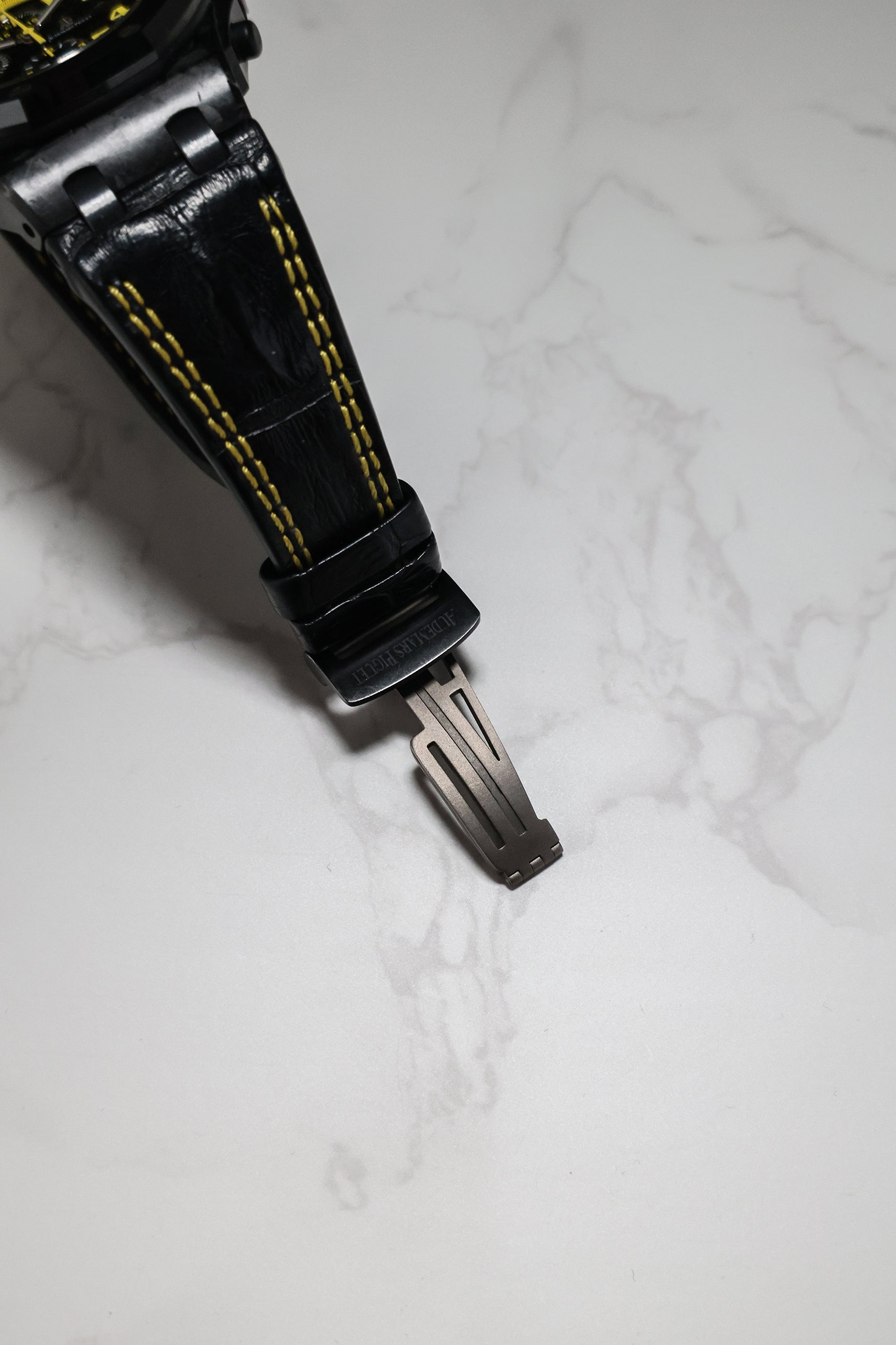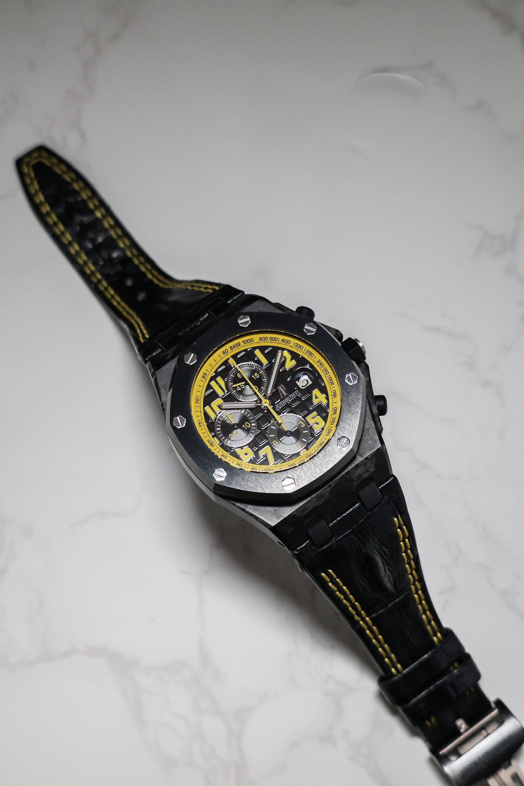 The dial is quintessential Royal Oak Offshore: bold, highly legible, and featuring the signature Méga Tapisserie texture. Vibrant yellow Arabic numerals and luminous white gold hands ensure clarity, while a trio of sub-dials meticulously tracks the chronograph functions. A date window at 3 o'clock, magnified by a lens integrated into the sapphire crystal, adds practicality without disrupting the dial's aggressive yet refined composition. The theme is perfectly completed by a hand-stitched black leather strap with vivid yellow contrast stitching, unequivocally cementing its "Bumblebee" identity.