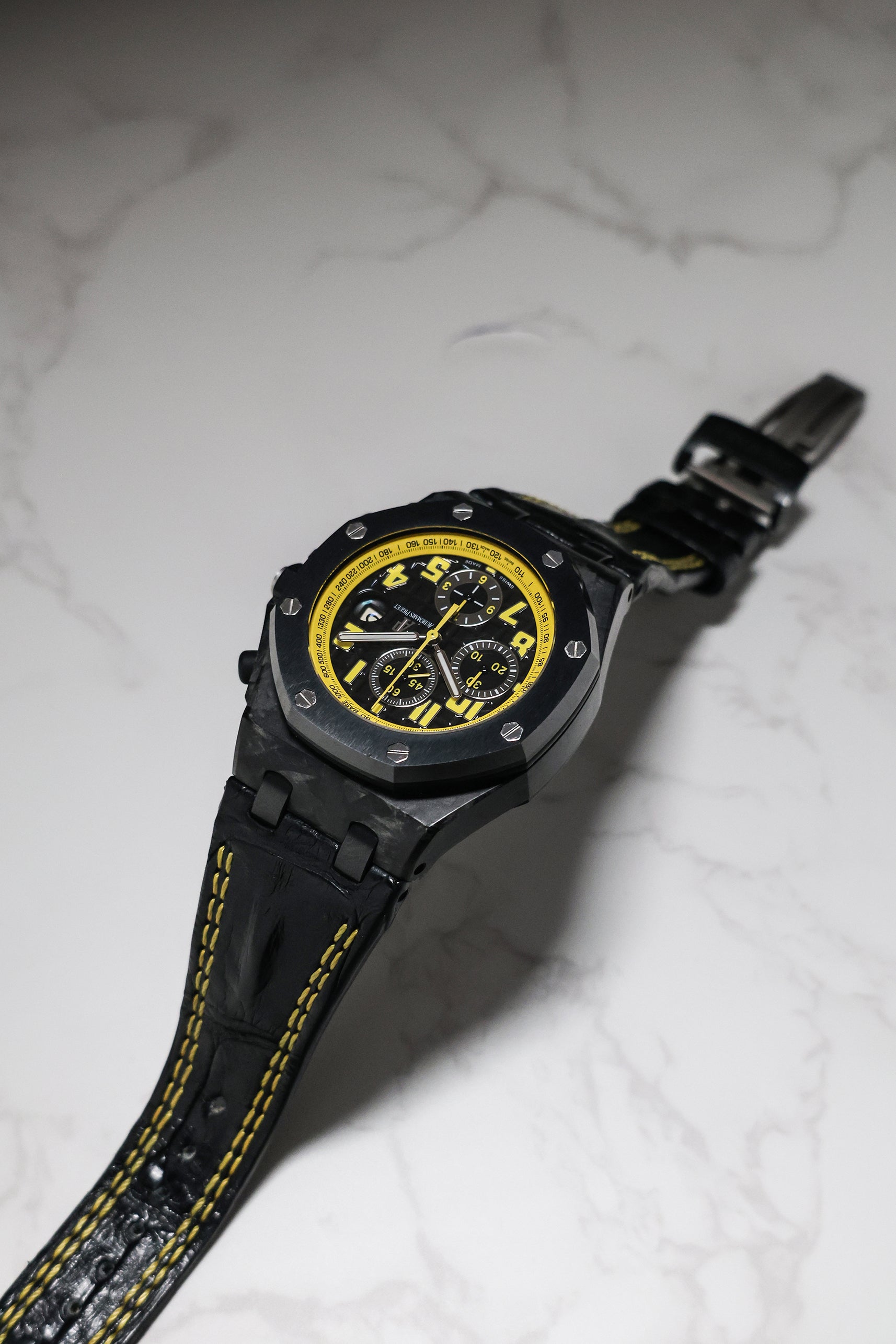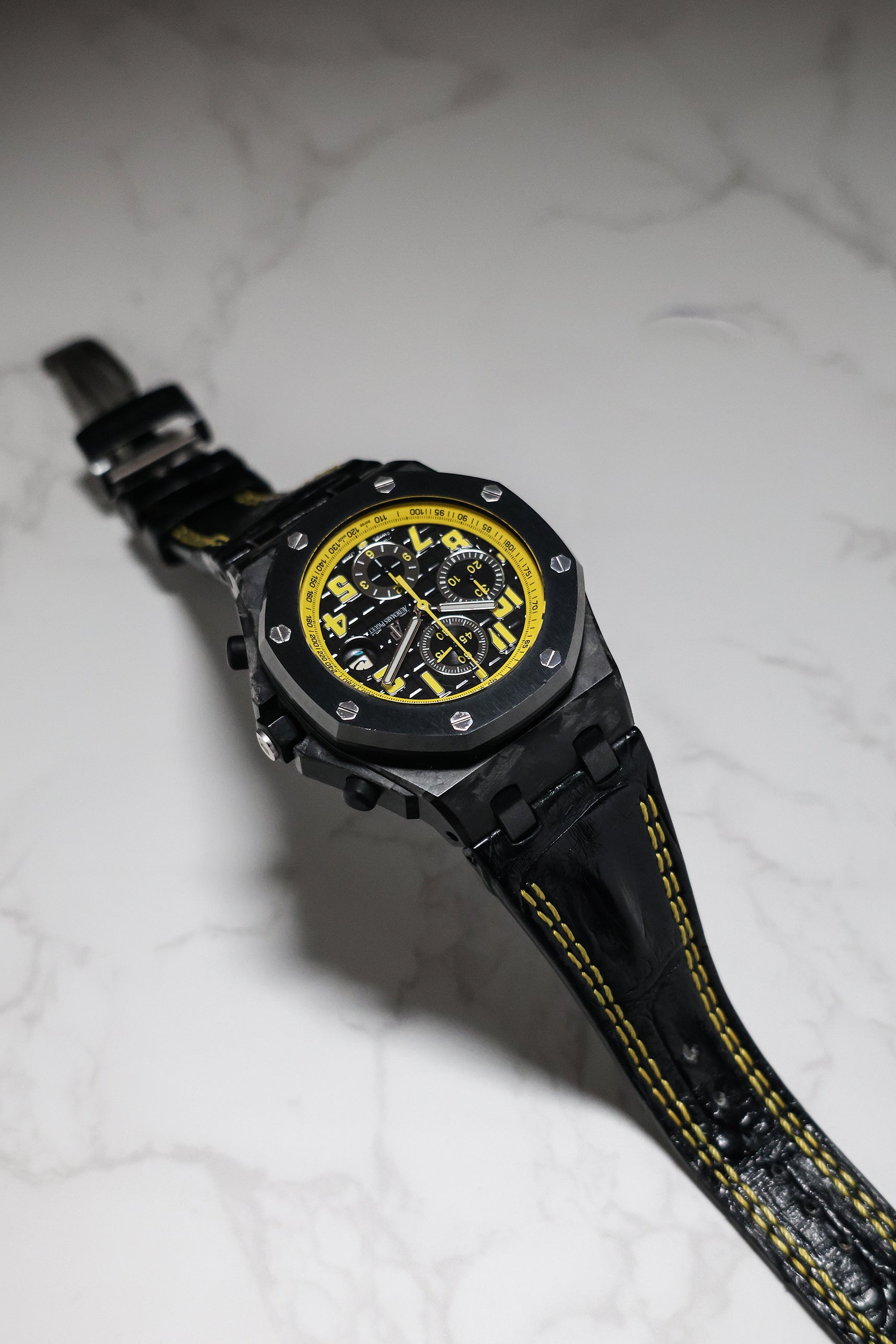 The Audemars Piguet Royal Oak Offshore “Bumblebee” 26176FO.OO.D101CR.02 stands as one of the most distinctive and boundary-pushing expressions within the iconic Offshore line. Introduced in 2010 and now discontinued, the "Bumblebee" nickname perfectly captures its striking visual identity, defined by bold yellow accents against a deep carbon-black backdrop. This timepiece is a powerful testament to a pivotal moment when Audemars Piguet fearlessly redefined the landscape of luxury sports chronographs.