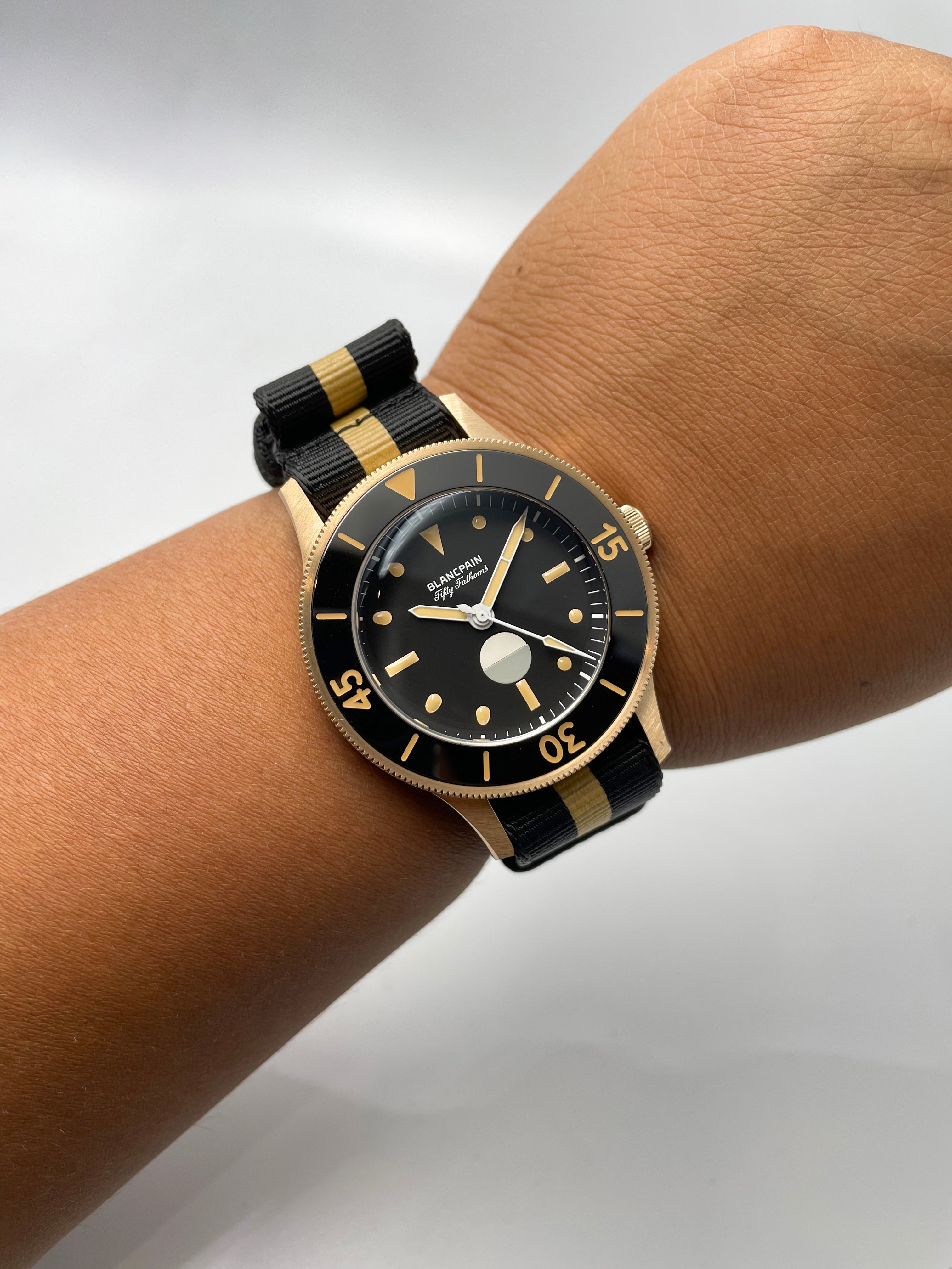Blancpain continues its 70th anniversary celebration of the iconic Fifty Fathoms with Act 3, a bronze-gold homage to the vintage MIL-SPEC models. Limited to 555 pieces, this new iteration captures the essence of the military-issued dive watches of the late 1950s.