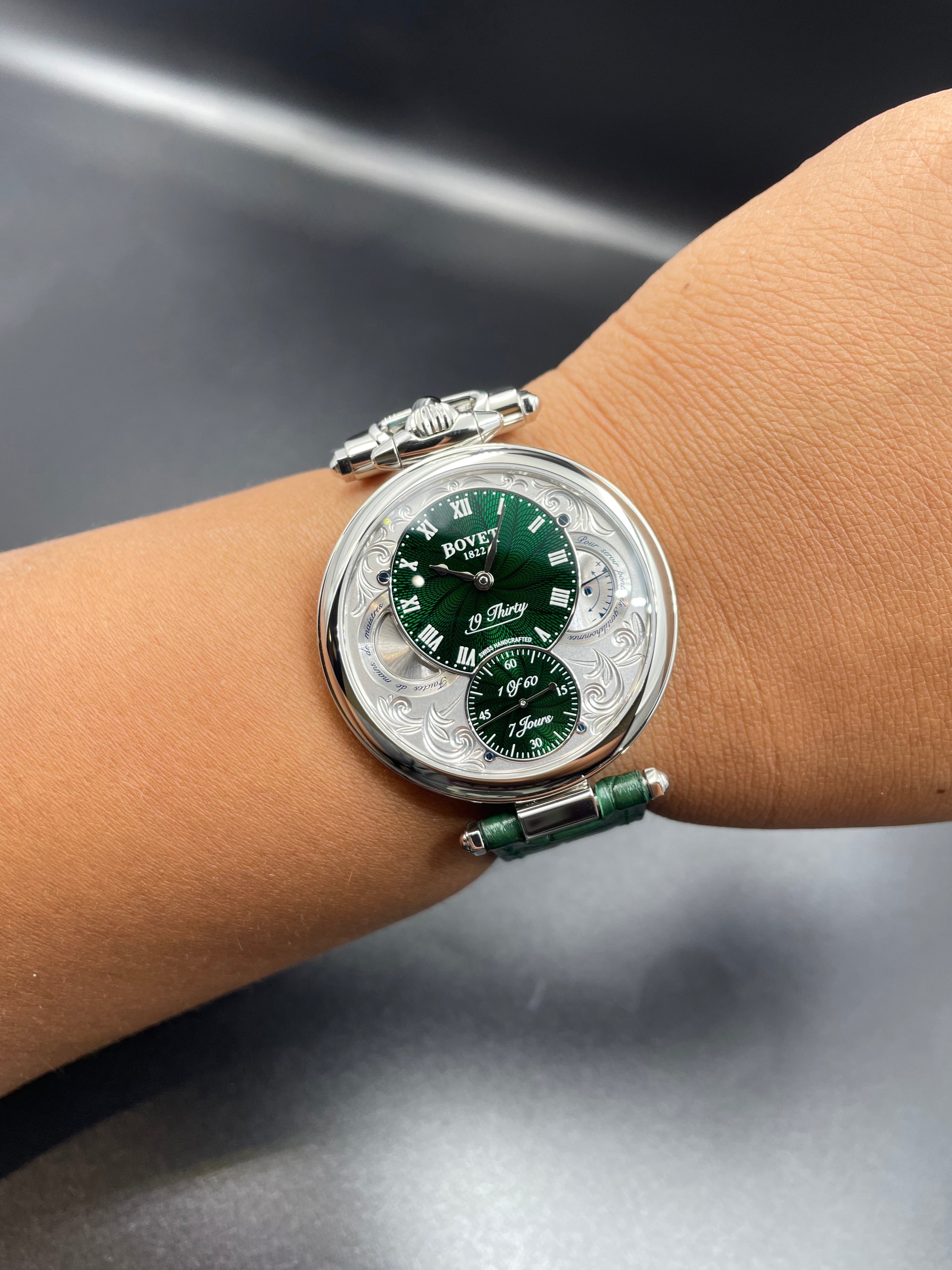 The Bovet Fleurier series looms sensuously over the upscale part of the watchmaking industry, from Miss Audrey's slender yet graceful shape to the 19Thirty's exquisitely constructed guilloche dial. The watches of the Bovet Fleurier collection have intricate complexities and a display case back, making them not only works of art but also examples of great mechanical design. Although the straps are composed of premium leather, the watches in this line stand out because of the