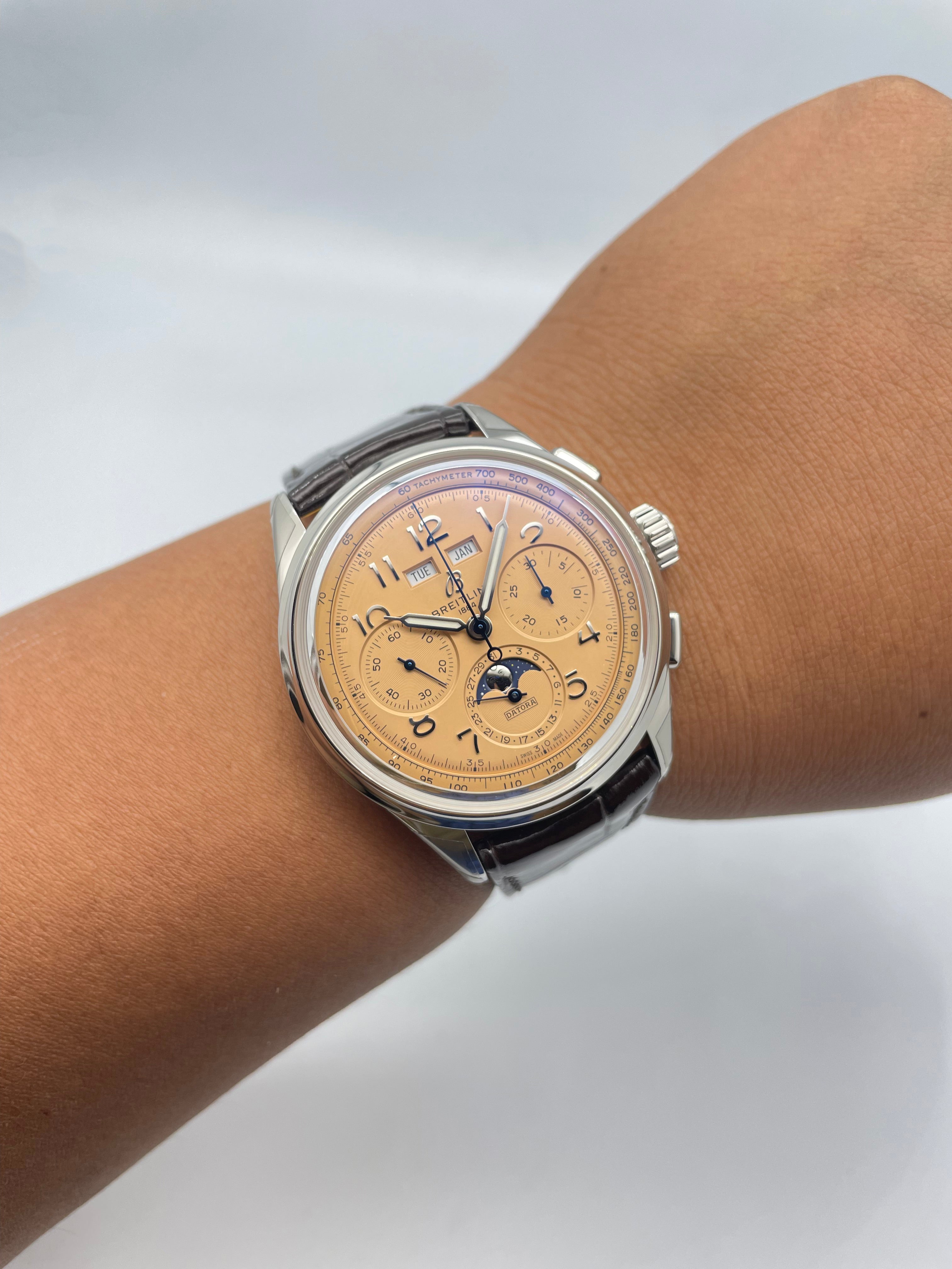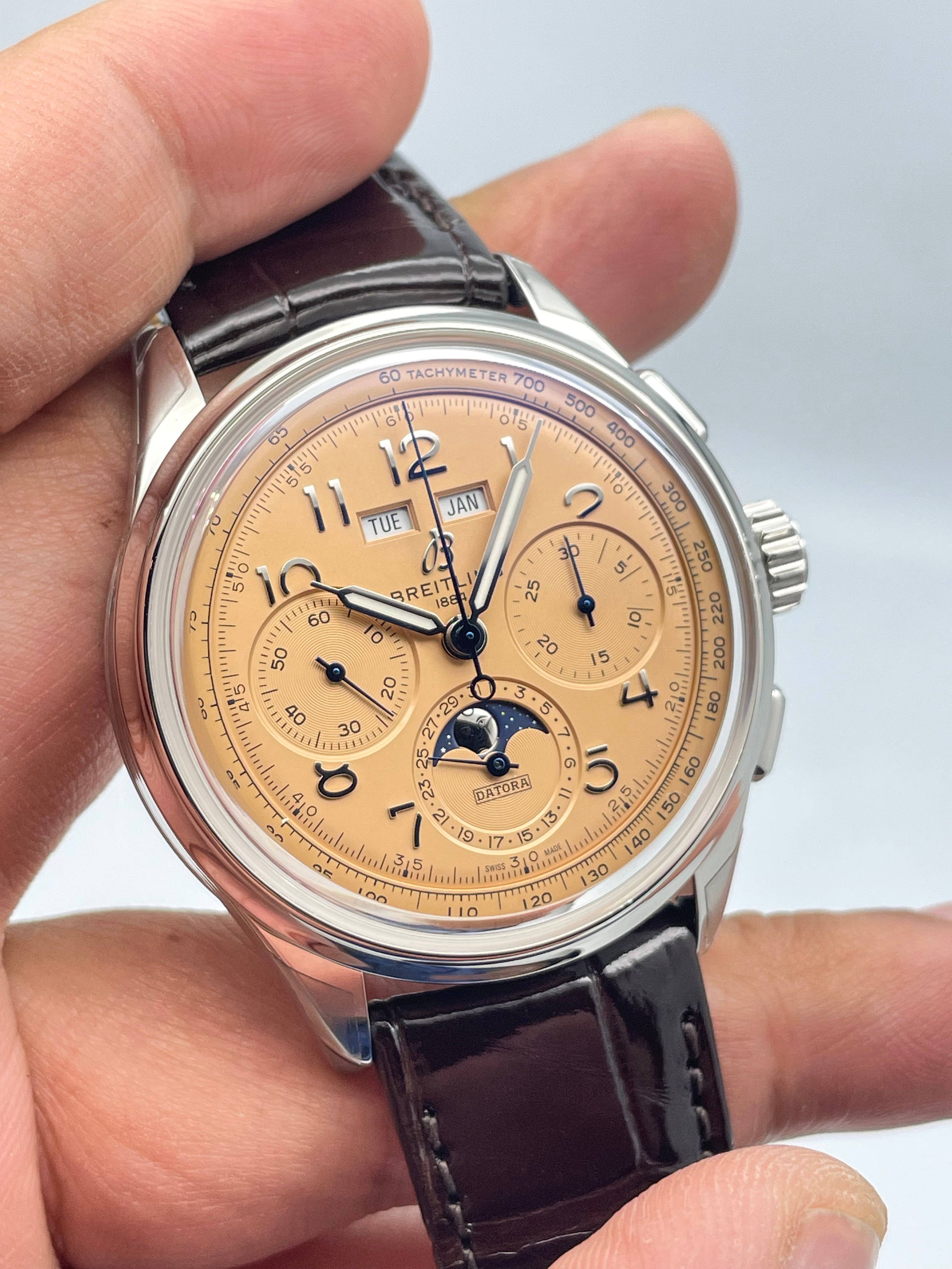 The Breitling Premier B25 Datora AB2510201K1P1 is a stunning example of classic chronograph design fused with modern watchmaking excellence. Part of Breitling’s Premier collection, it exudes vintage-inspired elegance with its copper-colored dial, which beautifully complements the polished stainless steel 42mm case. The dial is intricate yet balanced, featuring a full calendar complication with day, date, and month displays, as well as a moonphase at 6 o’clock, making it one of the most refined and sophisticated timepieces in Breitling’s lineup.