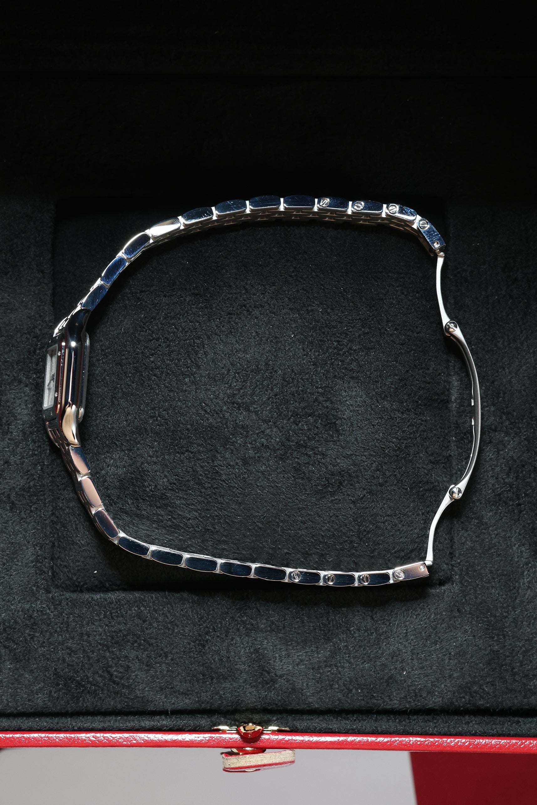 Crafted in polished stainless steel, the WSPN0012 showcases Cartier’s signature radiant finishes, creating a luminous yet understated aesthetic. The classic square case, measuring a dainty 25mm x 19mm, features soft edges and a distinct bezel that highlight the architectural elegance of the design. The sleek bracelet, a hallmark of the Panthère collection, is composed of supple links that ensure a comfortable and seamless fit on even the most slender wrist, while beautifully reflecting light with every movement.