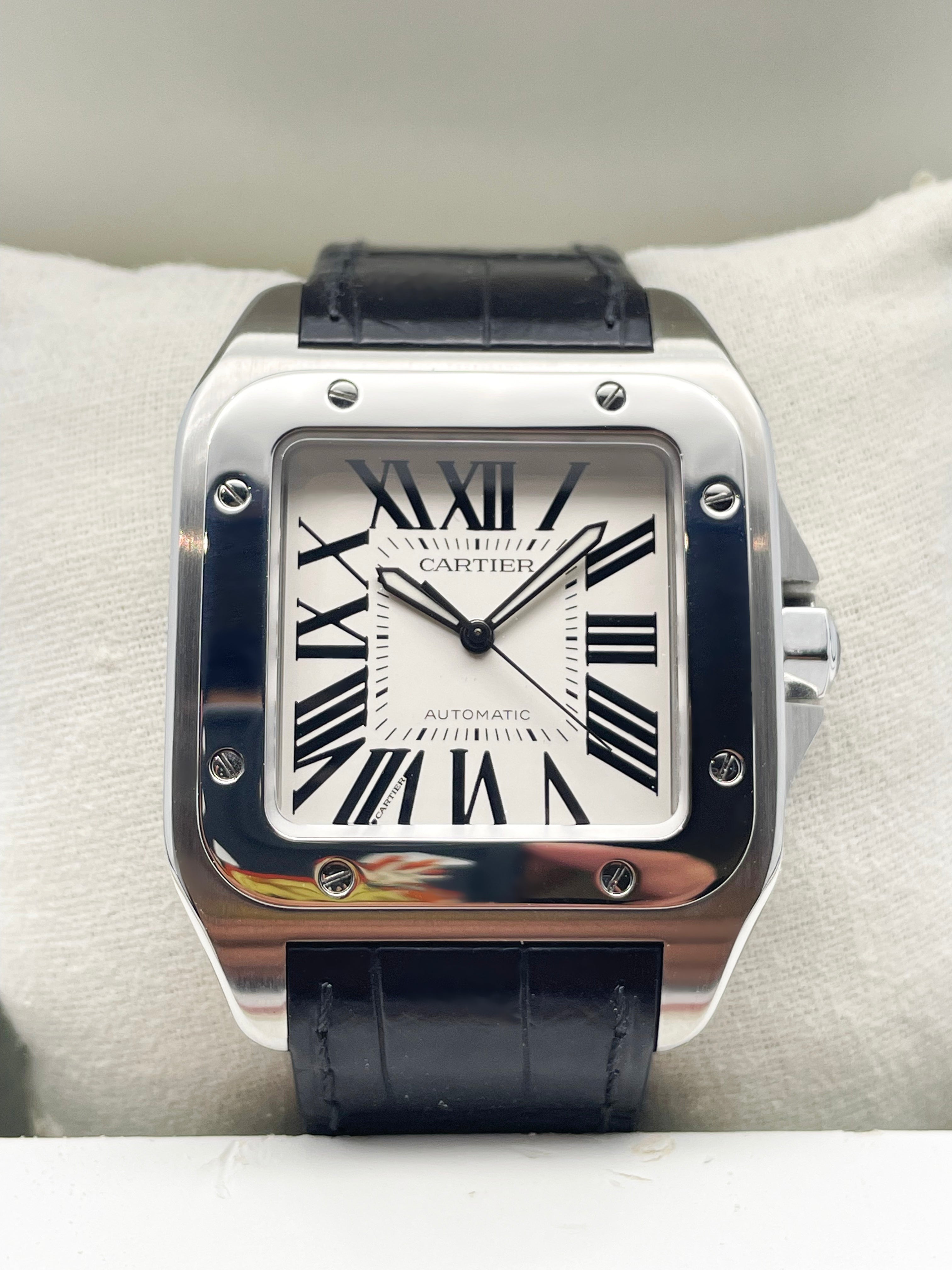 Discontinued in 2017, the Santos 100 W20073X8 has become increasingly collectible, as it represents a modern yet faithful tribute to one of Cartier's most storied designs. Its departure from production has further solidified its status as a sought-after timepiece, appealing to those who appreciate the fusion of Cartier's classic heritage with a more contemporary, oversized aesthetic. The discontinuation has also enhanced its allure on the pre-owned market, making it a coveted model for collectors and enthusiasts alike.