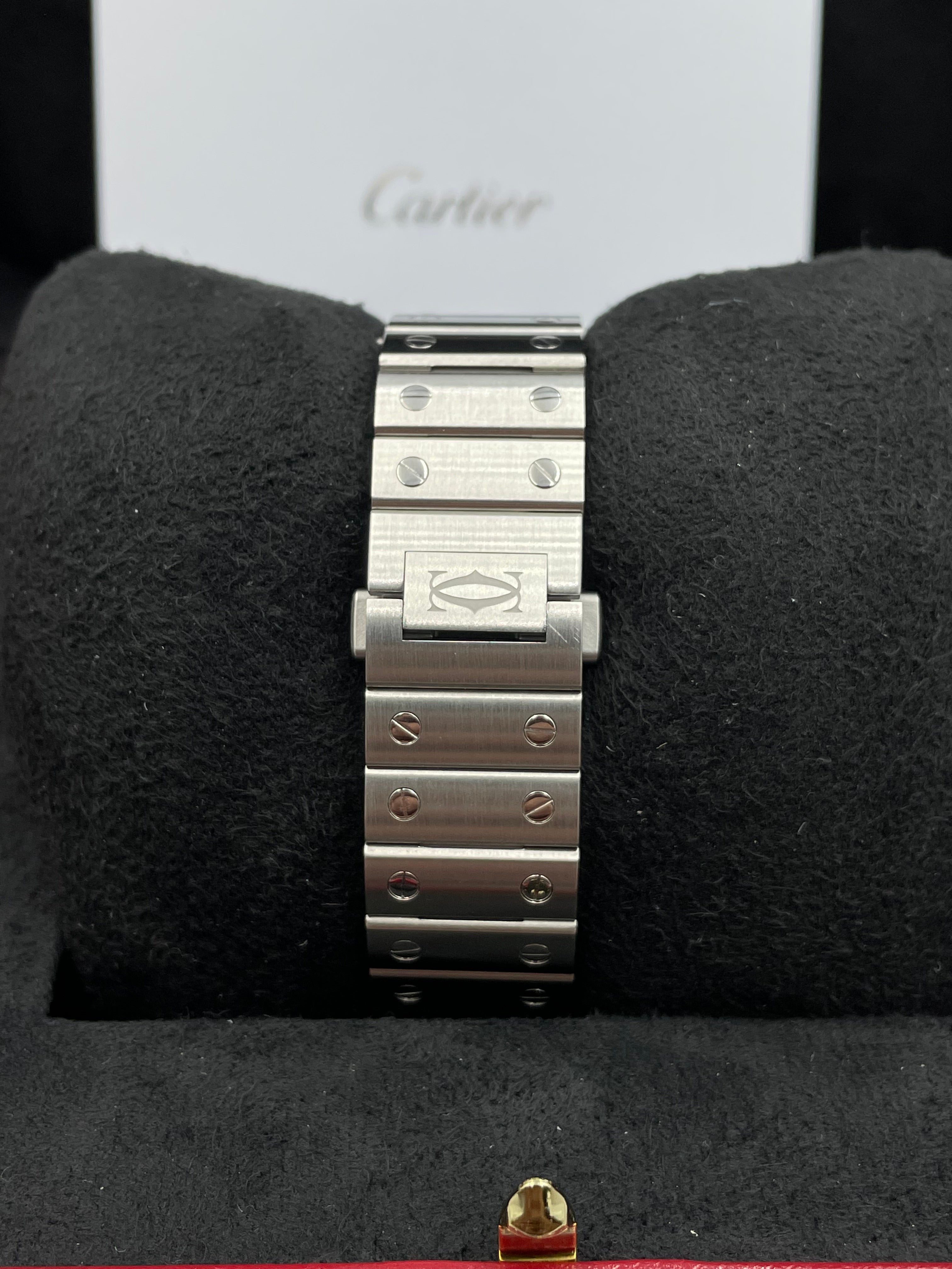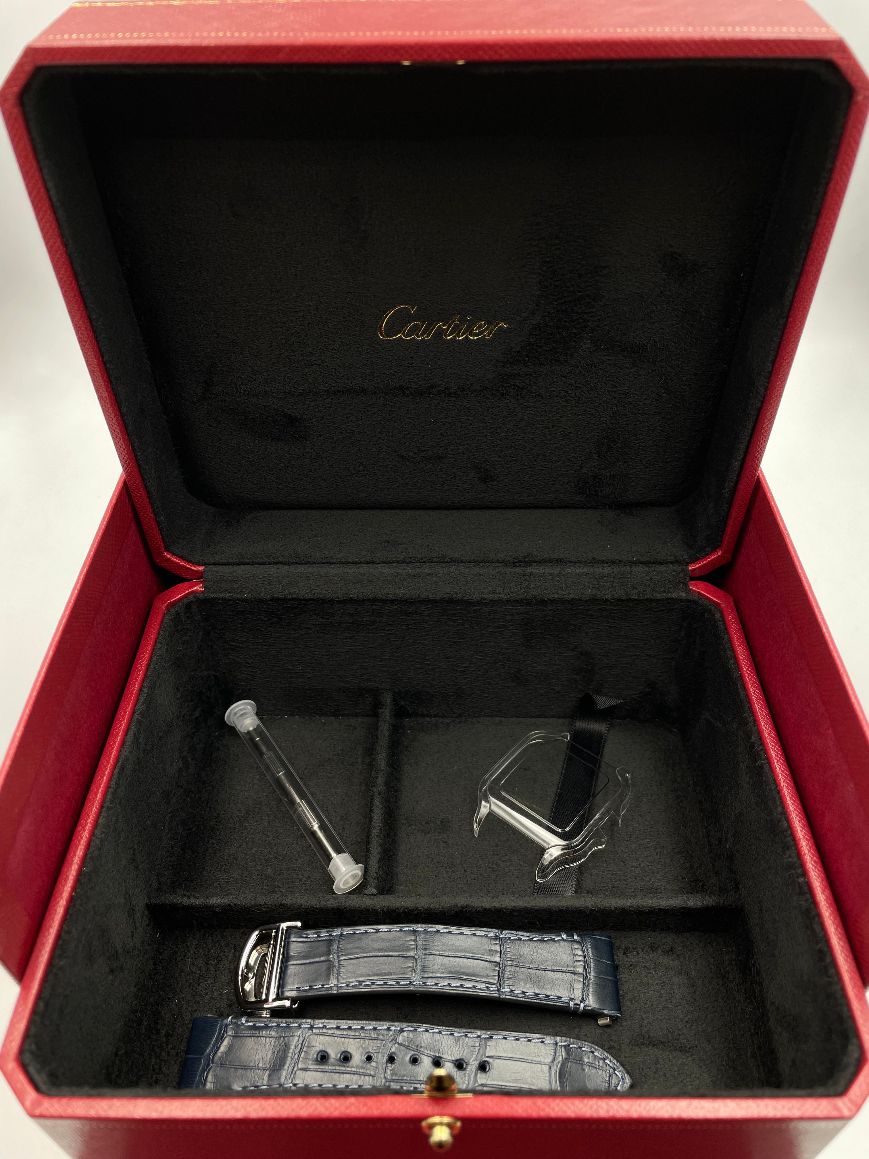 One notable feature of the Santos is its interchangeable bracelet system. It comes with a stainless steel bracelet that seamlessly integrates with the case, providing a cohesive and refined appearance. Additionally, Cartier includes alternative strap options, such as leather strap with deployant clasp, allowing you to customize the watch to suit your style and preference.