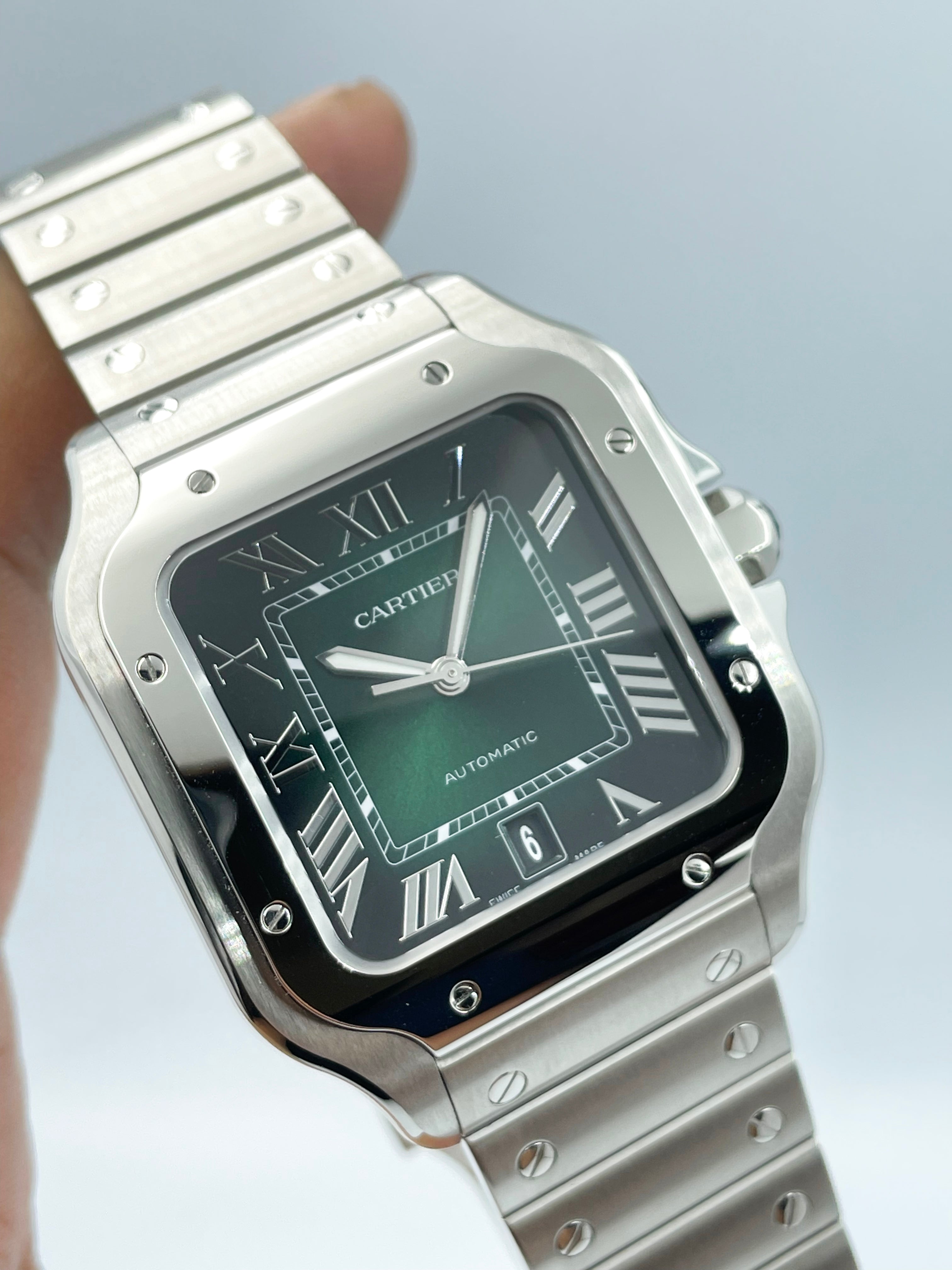 One notable feature of the Santos is its interchangeable bracelet system. It comes with a stainless steel bracelet that seamlessly integrates with the case, providing a cohesive and refined appearance. Additionally, Cartier includes alternative strap options, such as green leather strap with deployant clasp, allowing you to customize the watch to suit your style and preference.