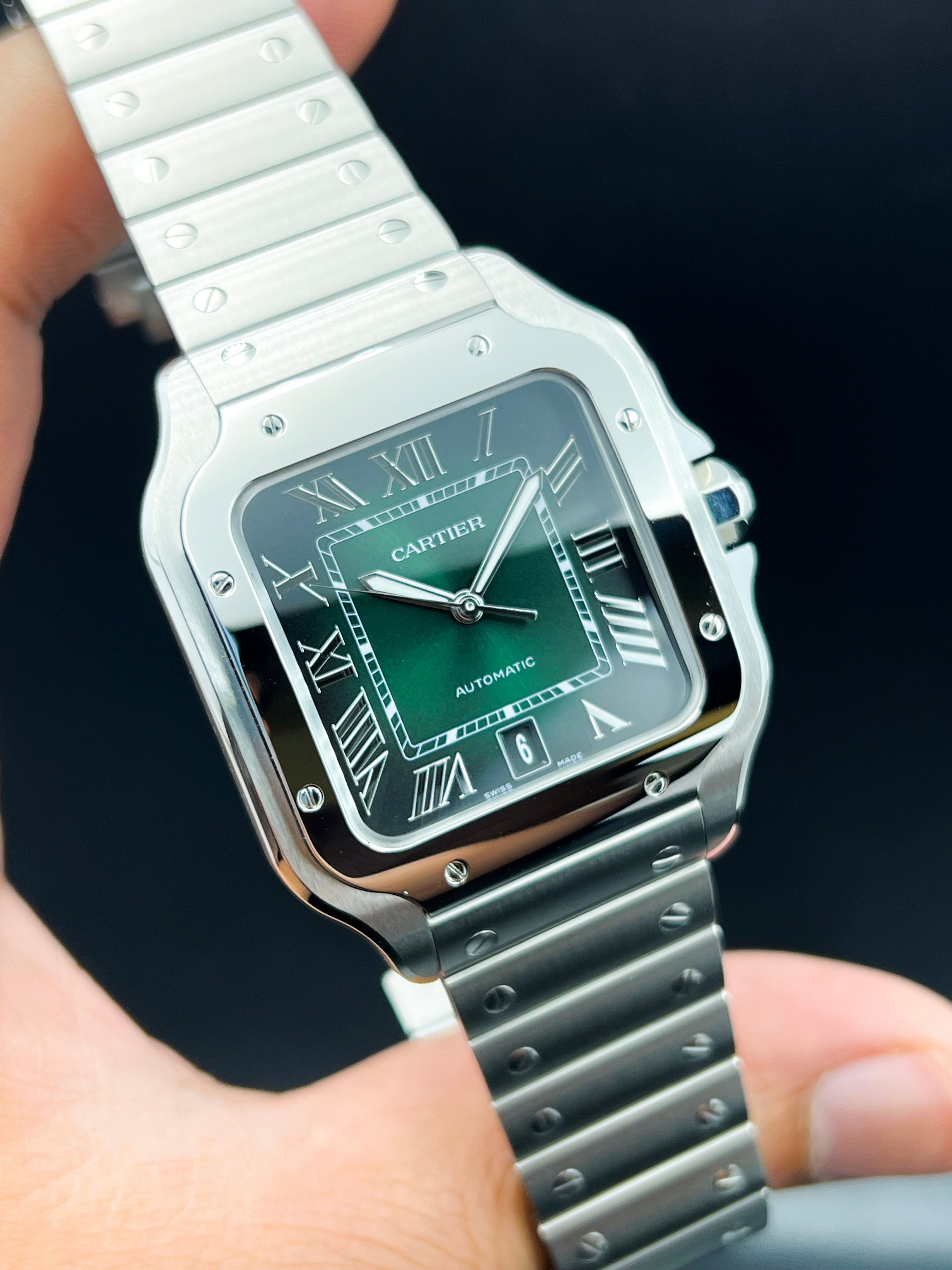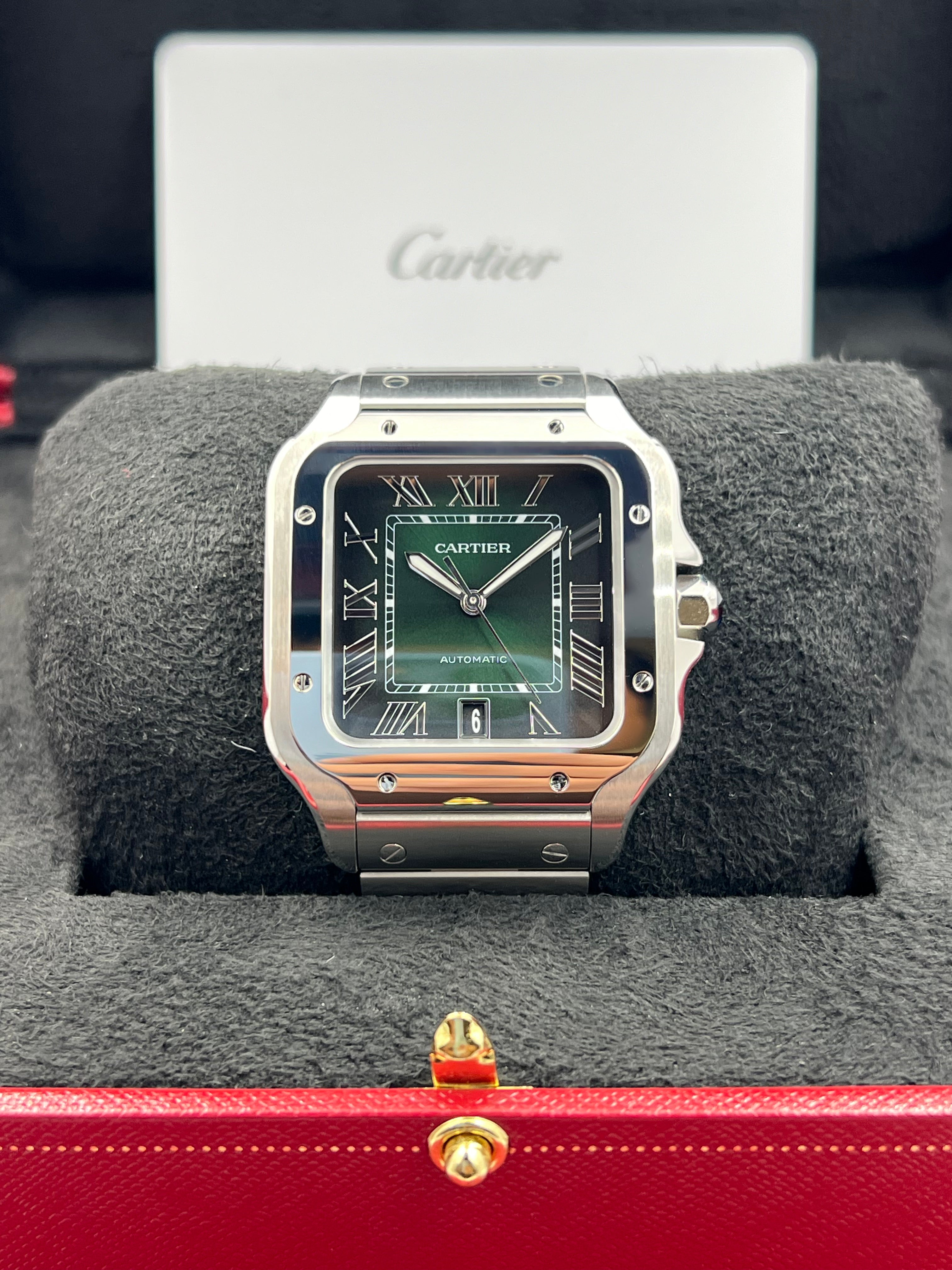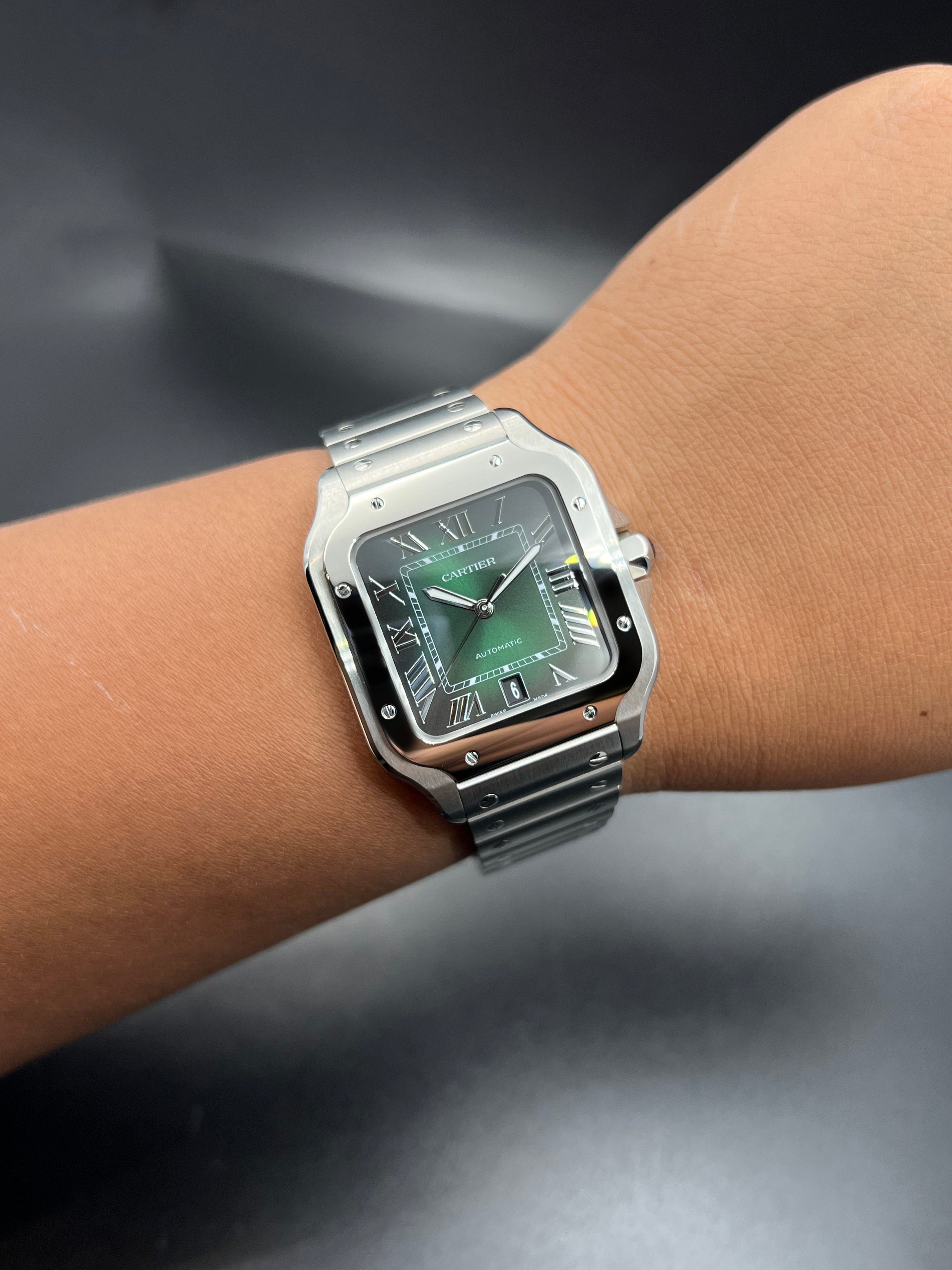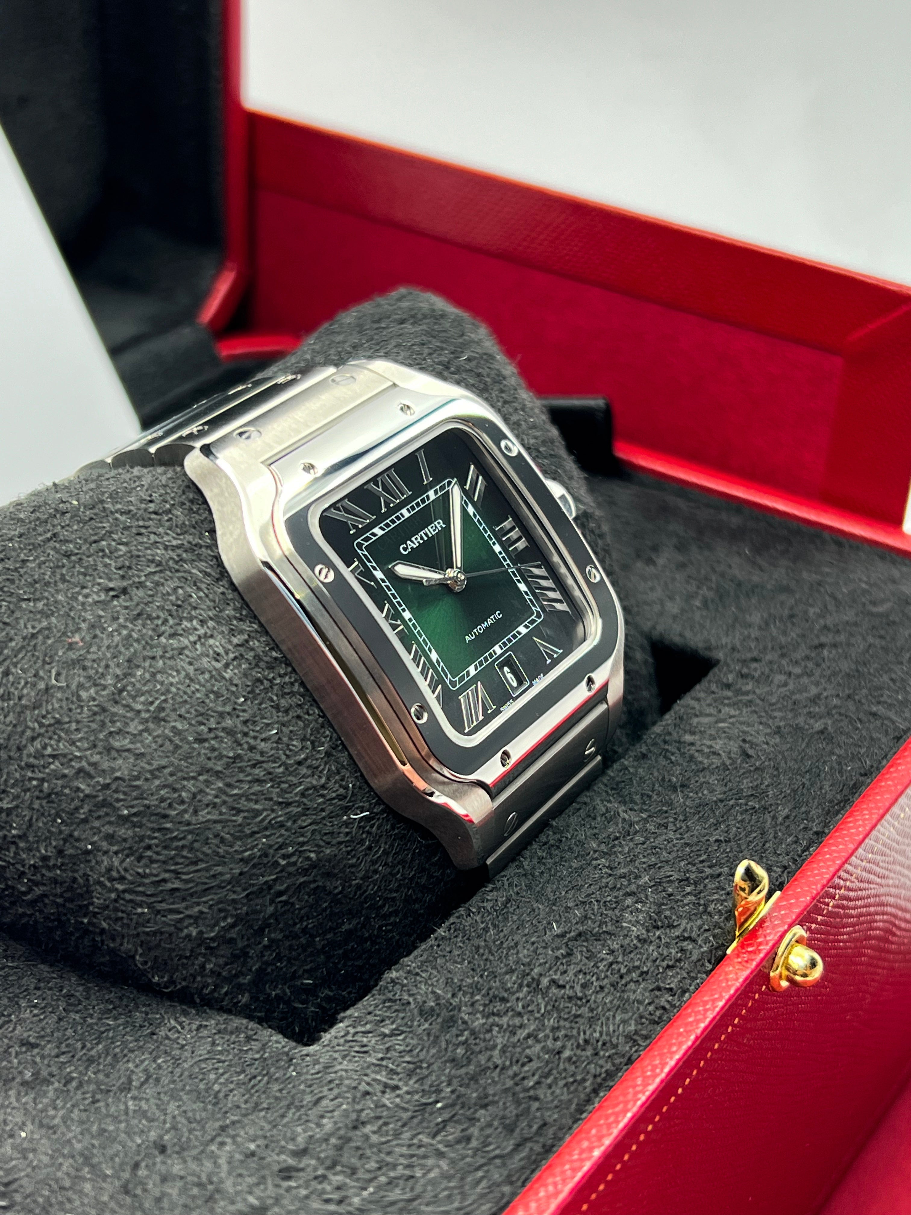 One notable feature of the Santos is its interchangeable bracelet system. It comes with a stainless steel bracelet that seamlessly integrates with the case, providing a cohesive and refined appearance. Additionally, Cartier includes alternative strap options, such as green leather strap with deployant clasp, allowing you to customize the watch to suit your style and preference.