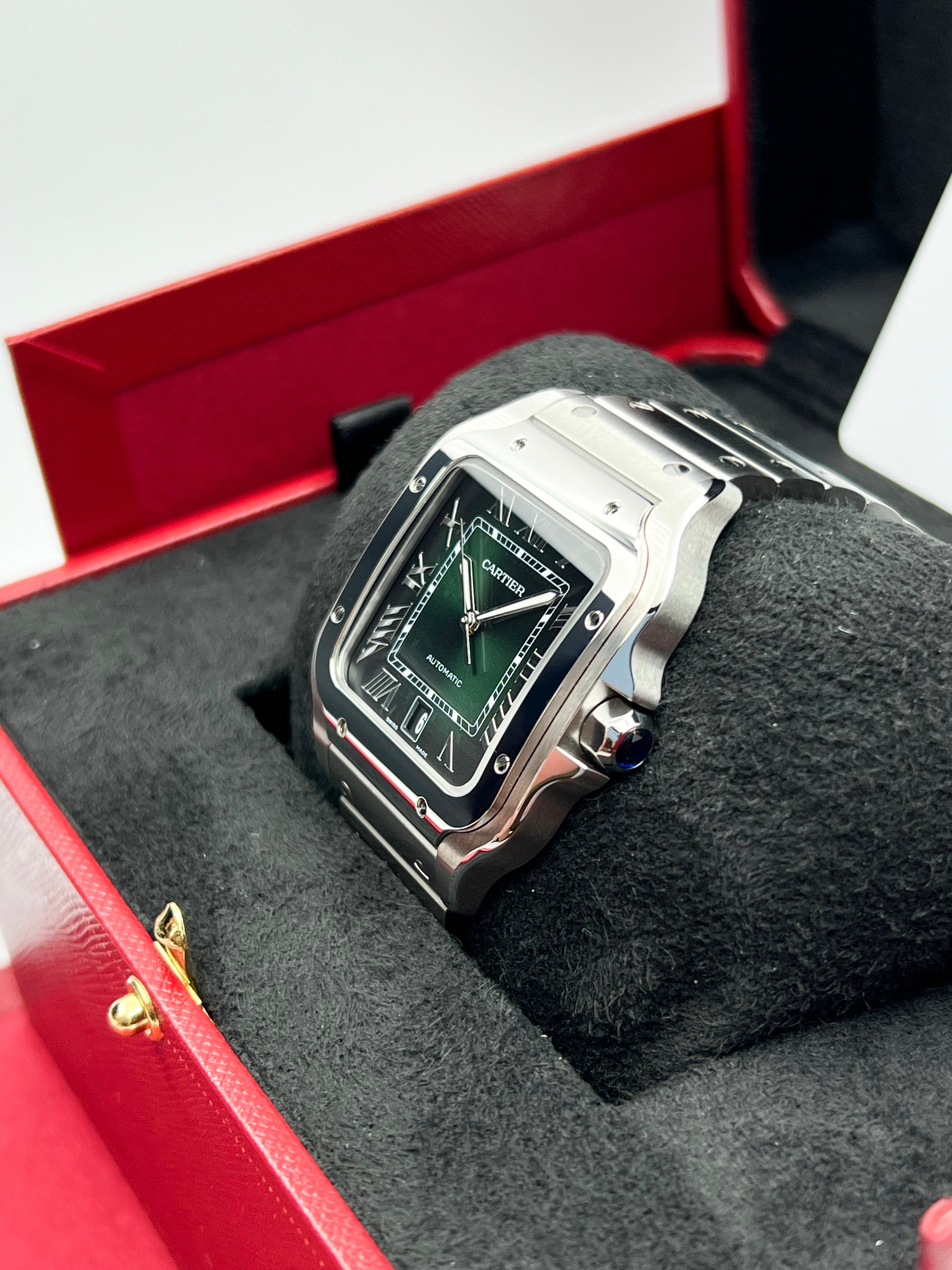 The Cartier Santos WSSA0062 features a stainless steel case that measures 40mm in diameter, offering a sleek and contemporary look. The square-shaped case is complemented by a Sunray Smoky Green dial, which showcases Roman numeral hour markers staying true to the classic Cartier aesthetic.