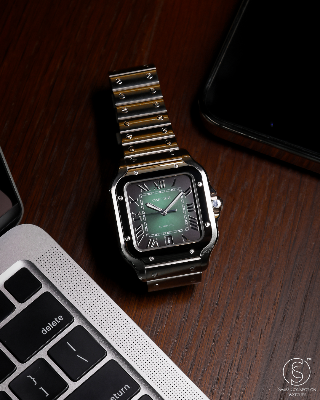 The stainless steel case retains the signature square silhouette with softly rounded edges, giving the watch a distinctive profile that’s both modern and timeless. Its polished bezel is punctuated by exposed screws—an industrial design flourish that has become one of the Santos' most recognizable hallmarks. Framing the dial is the defining feature of this reference: a mesmerizing smoky green dial. This unique hue offers remarkable depth, transitioning subtly and playing beautifully with light, adding a sophisticated, contemporary dimension. The classic Roman numerals and iconic blued-steel hands are rendered with classical Cartier finesse, while a subtle date window at 6 o’clock adds discreet practicality.