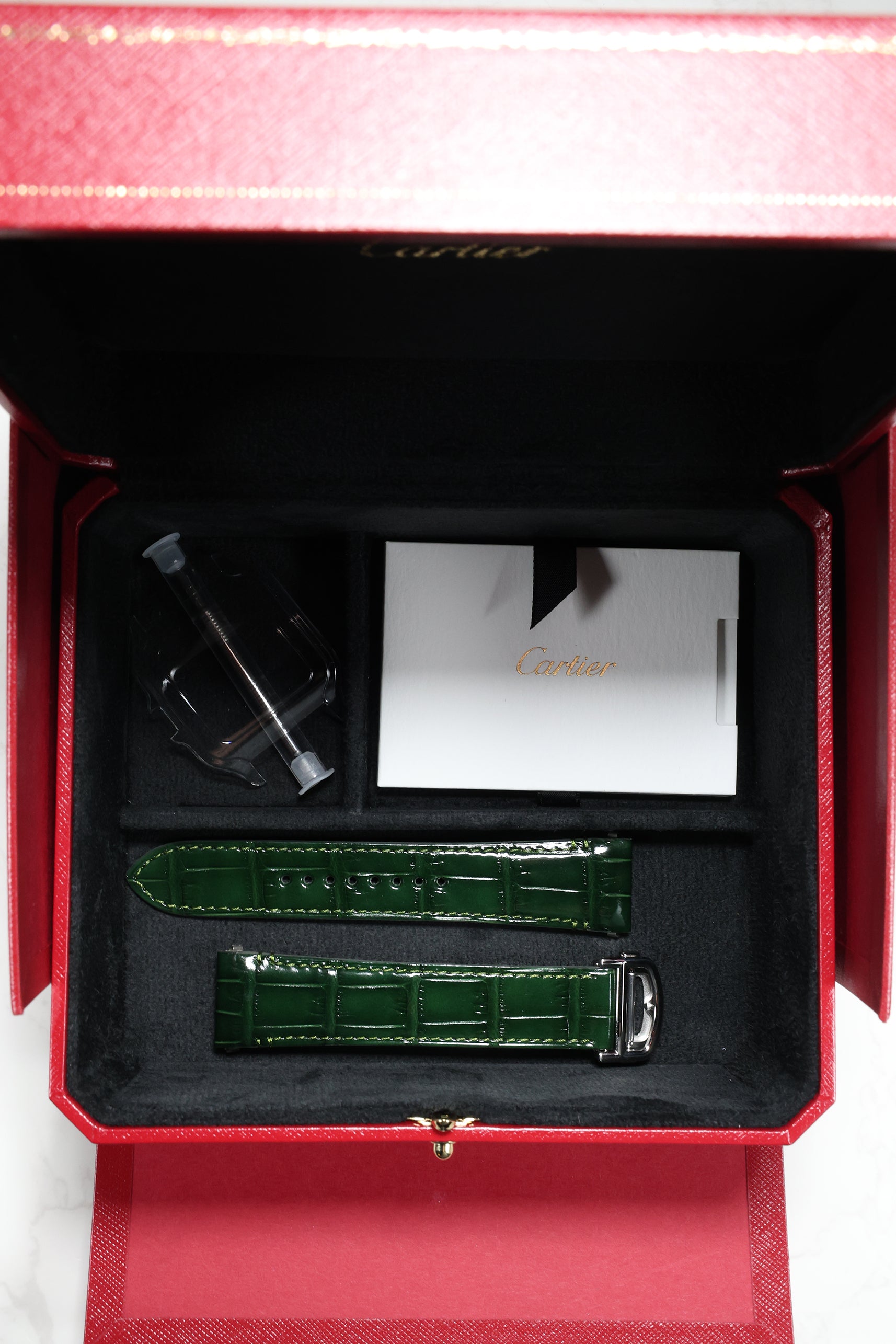 Cartier’s proprietary QuickSwitch system allows for seamless, tool-free strap changes, and the watch includes both a fully integrated stainless steel bracelet and an additional black leather strap. Paired with the SmartLink system for easy bracelet sizing, this modular approach ensures the Santos transitions effortlessly between boardroom, black-tie events, and weekend casual—always with quiet distinction and unmatched versatility.