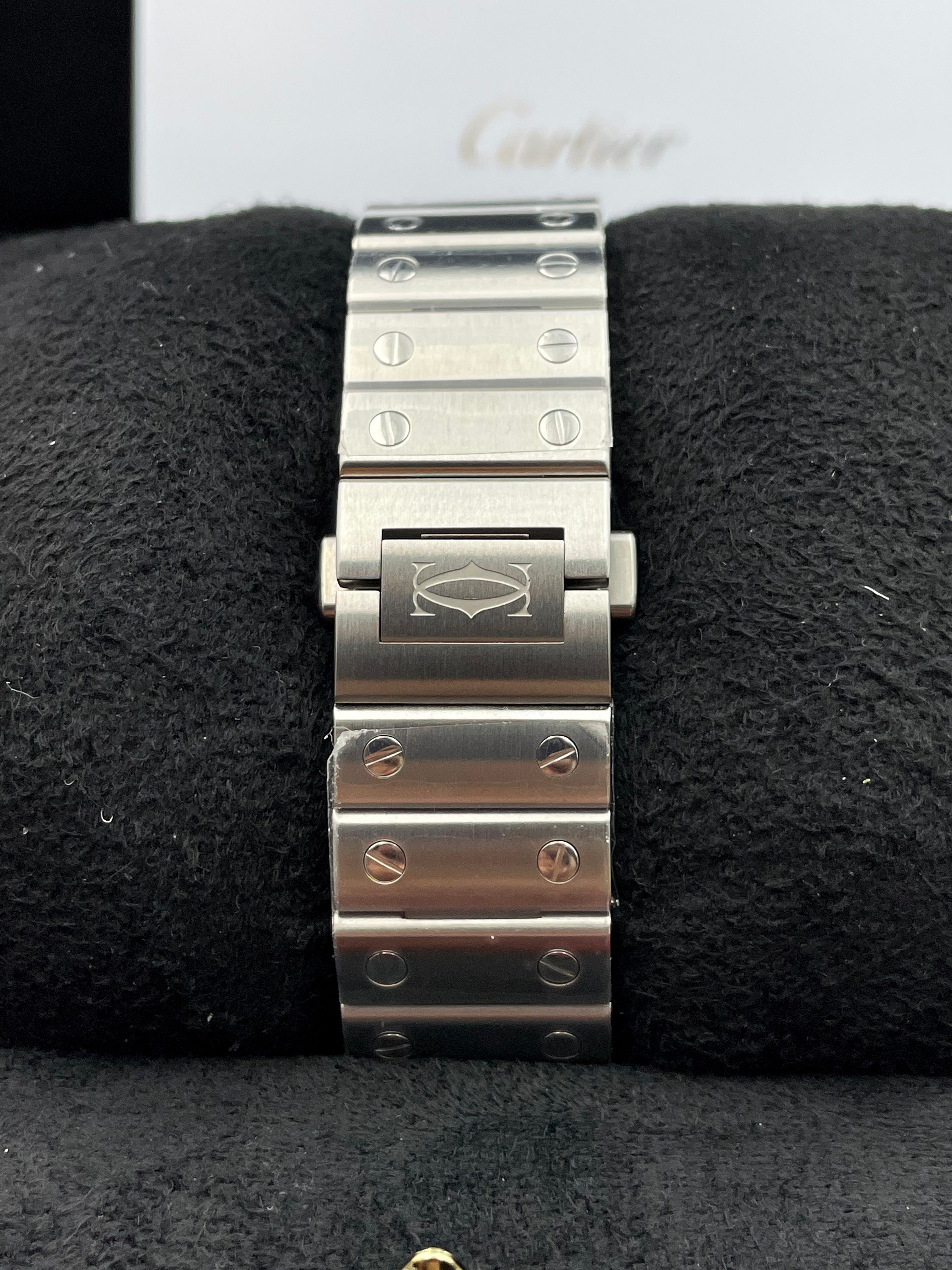 One notable feature of the Santos is its interchangeable bracelet system. It comes with a stainless steel bracelet that seamlessly integrates with the case, providing a cohesive and refined appearance. Additionally, Cartier includes alternative strap options, such as leather strap with deployant clasp, allowing you to customize the watch to suit your style and preference.