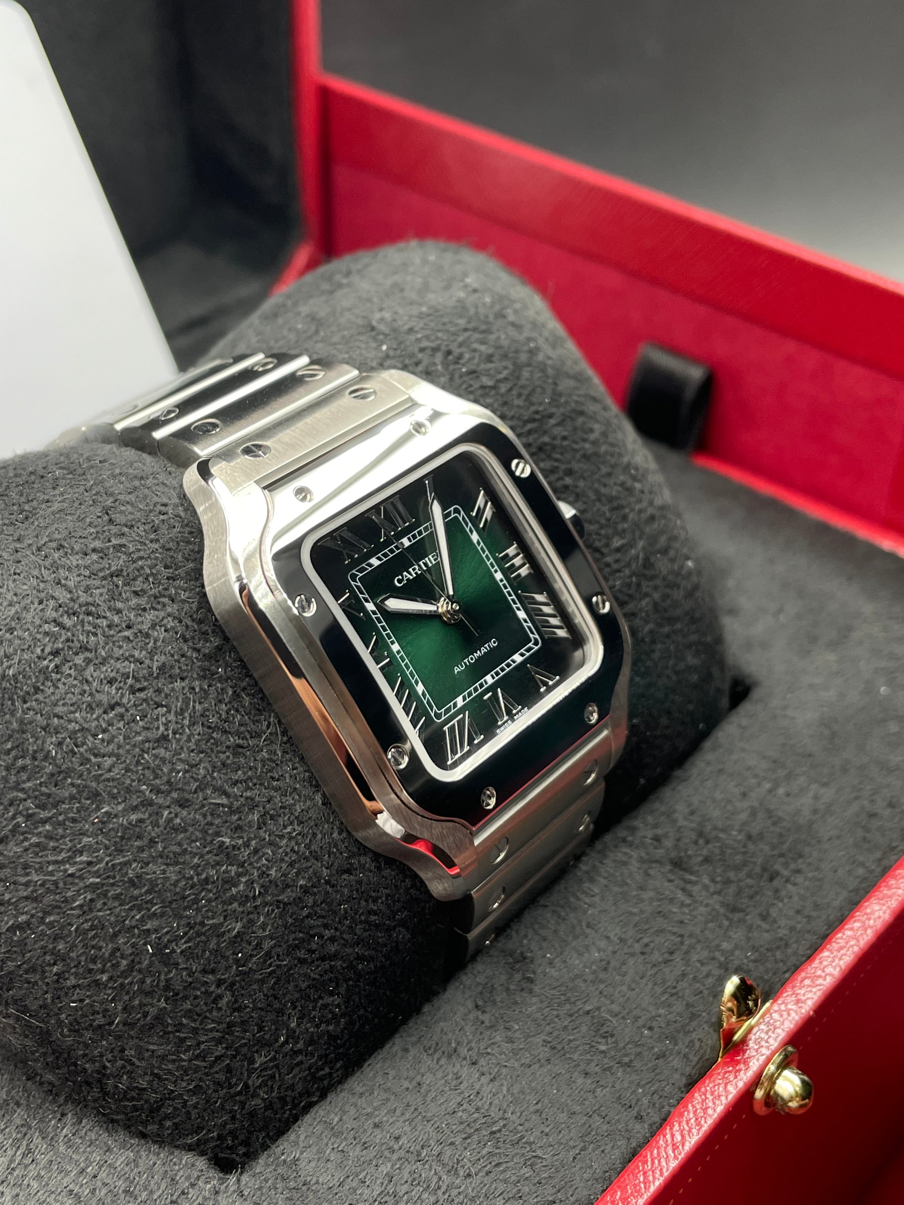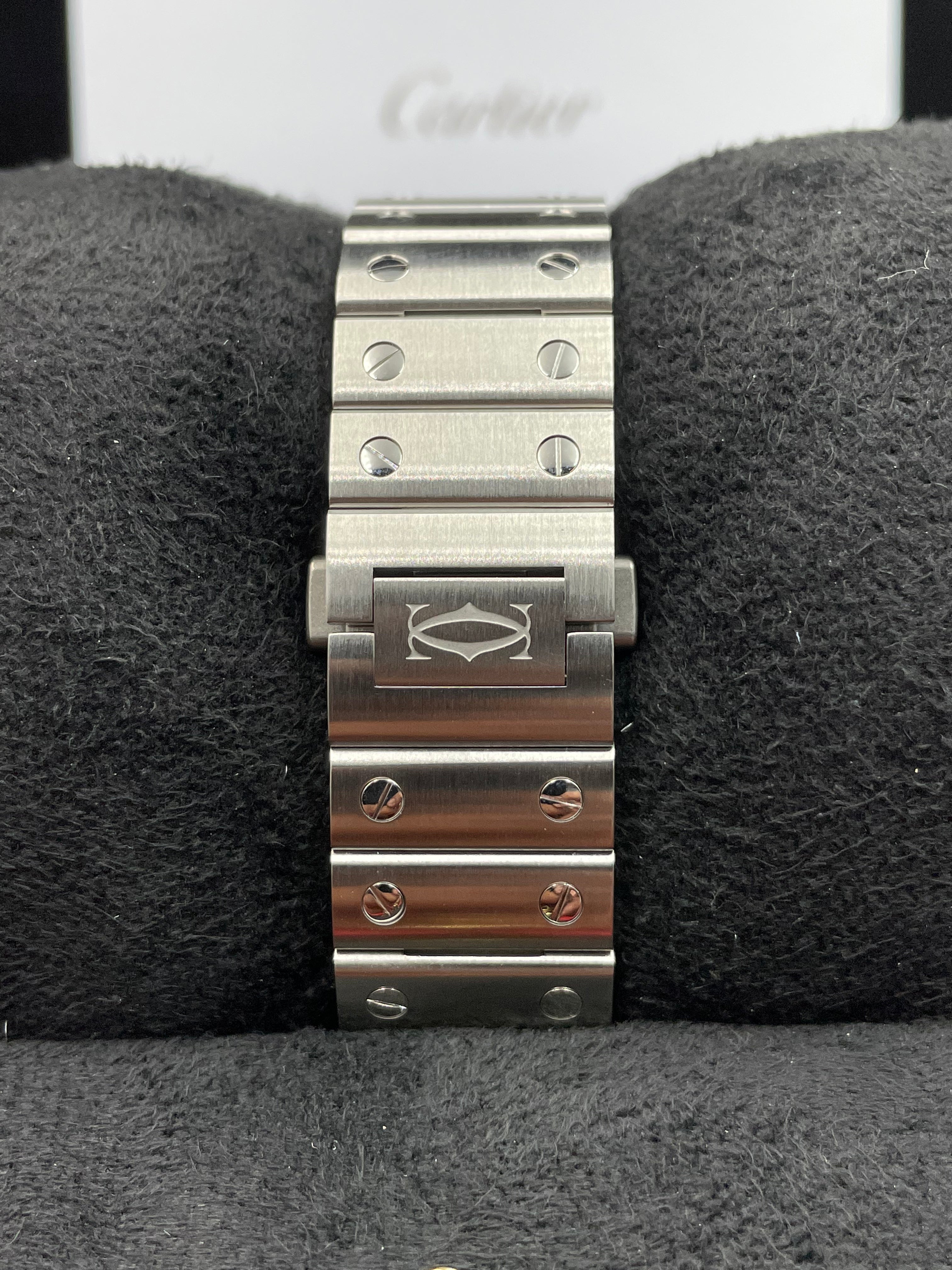 One notable feature of the Santos is its interchangeable bracelet system. It comes with a stainless steel bracelet that seamlessly integrates with the case, providing a cohesive and refined appearance. Additionally, Cartier includes alternative strap options, such as leather strap with deployant clasp, allowing you to customize the watch to suit your style and preference.