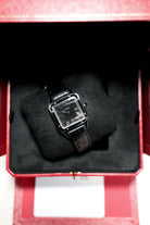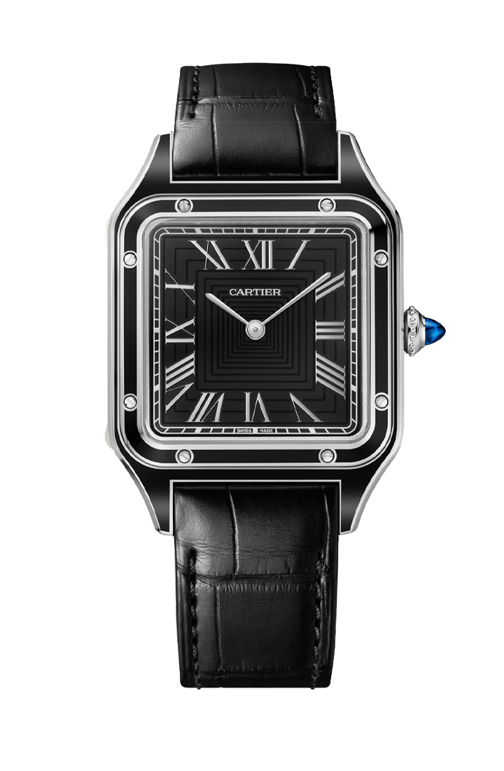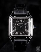 The defining feature of this Santos-Dumont is its brilliant polished stainless steel case, intricately adorned with striking black lacquer inlays. These inlays seamlessly trace the iconic shape of the bezel and case sides, creating a sophisticated and harmonious contrast that draws the eye. The classic silver Roman numerals and precise rail-track minute scale stand out crisply against the lacquered dial, perfectly complemented by elegant silver sword-shaped hands, ensuring impeccable harmony and balance in the design. This refined aesthetic not only pays tribute to the original Santos-Dumont but also introduces a distinctively modern, artistic flair that enhances the watch’s already commanding presence.