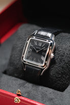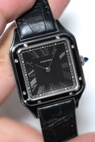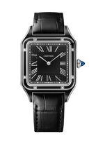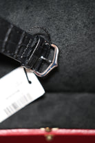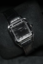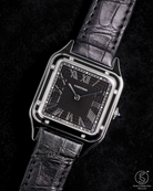 On the wrist, the Santos-Dumont Lacquer exudes sleek, understated elegance, further enhanced by its ultra-thin profile and reliable manual-winding movement, which reinforces its vintage-inspired charm. The monochromatic look of the silver hands and numerals against the black lacquer ensures a cohesive and polished appearance. Paired with a supple black alligator strap, the watch offers effortless versatility—equally suited for the most formal occasions or as a sophisticated everyday statement piece. Its slender case and the deliberate absence of a seconds hand further emphasize its refined, dressy character, embodying pure horological minimalism.