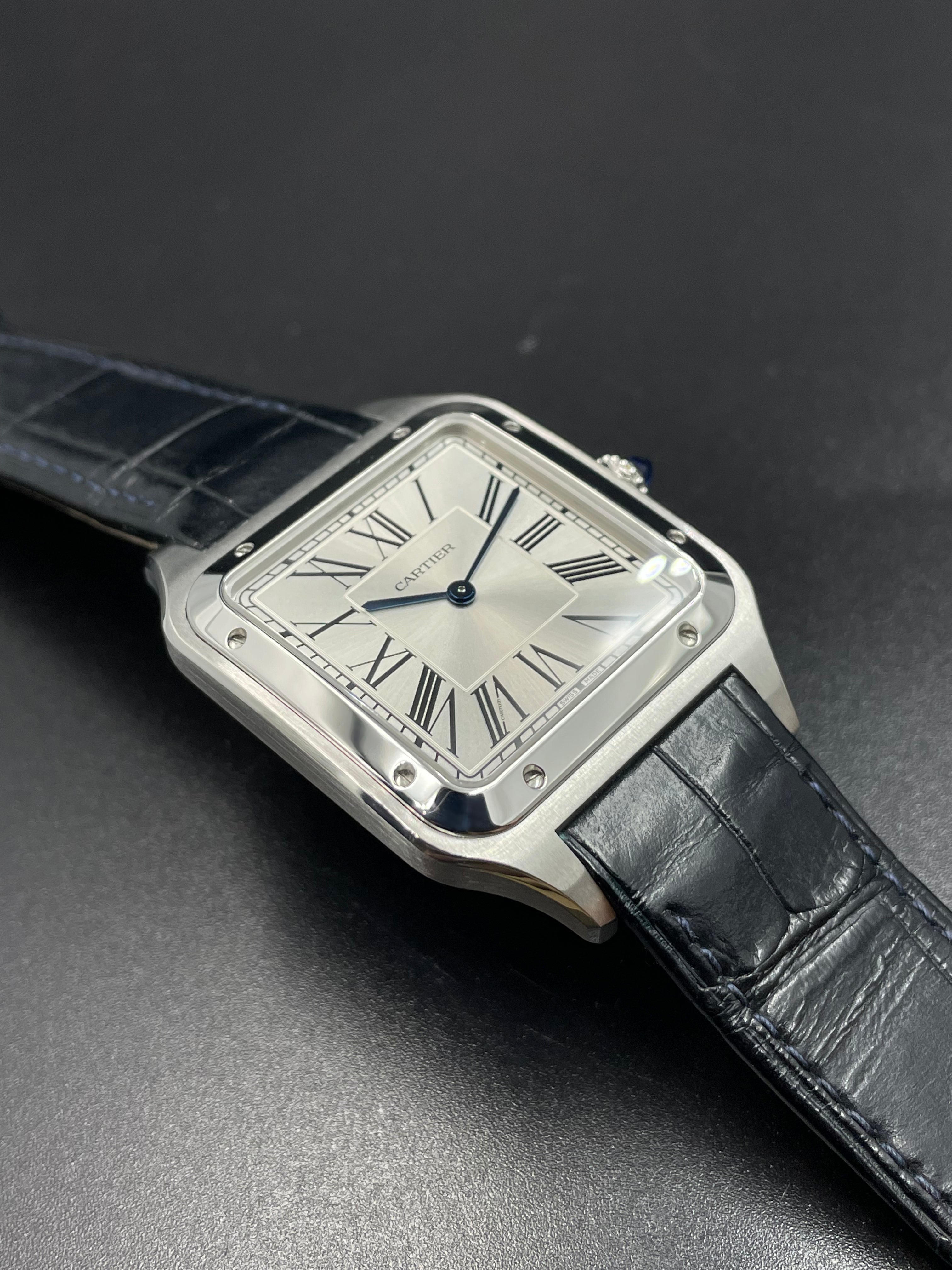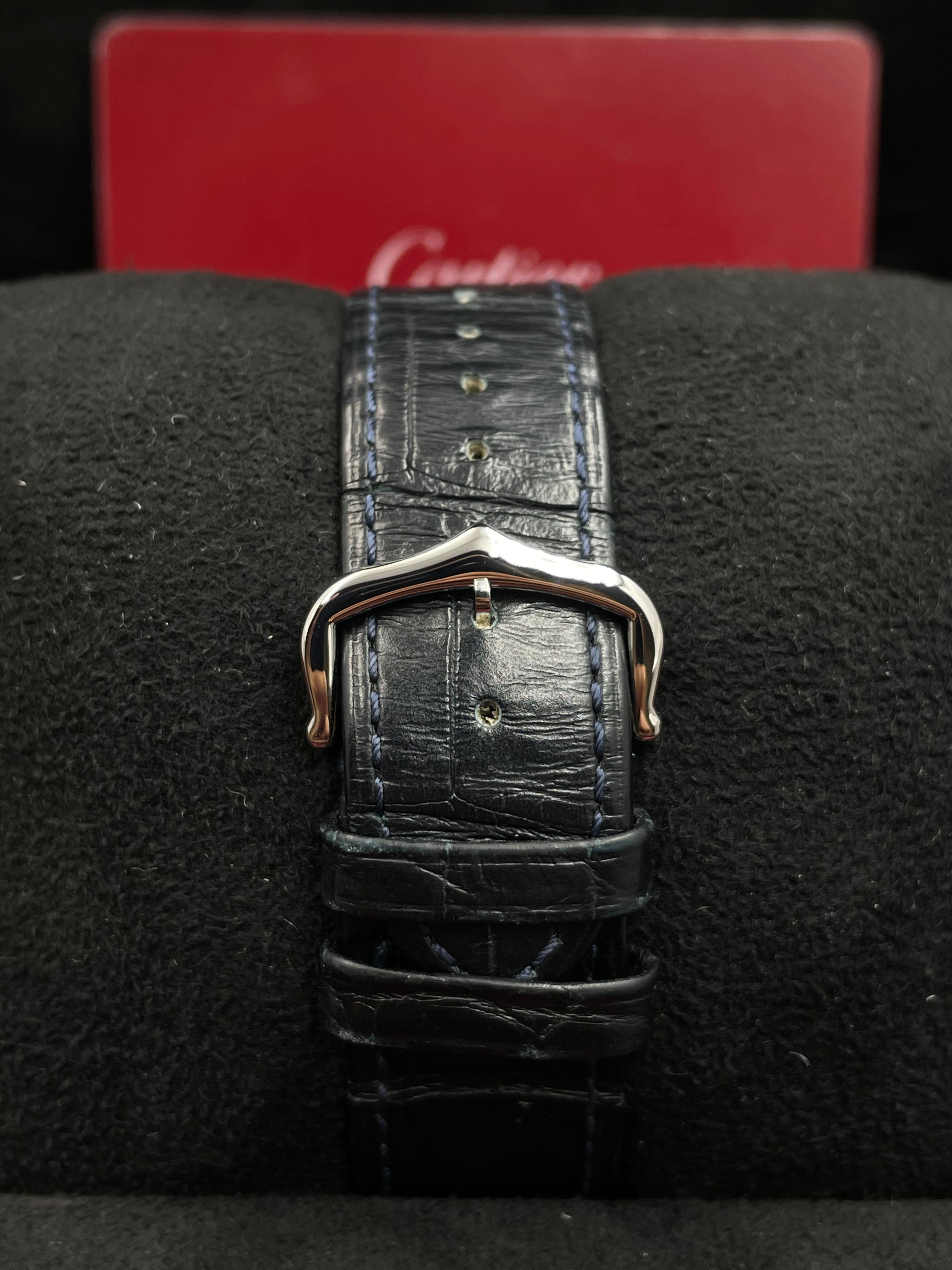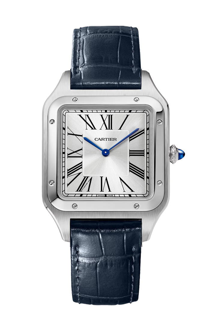 The dial has a silver satin sunray finish with classic Roman numerals and blued-steel sword-shaped hands. The watch comes fitted with a navy blue alligator leather strap and stainless steel ardillon buckle. Other details include a sapphire crystal and 30 meters of water resistance. Overall, the WSSA0032 stays true to the original Santos design while incorporating high-end modern watchmaking like the manufacture movement. The oversized case and intricate guilloche dial epitomize Cartier's dress watch elegance.