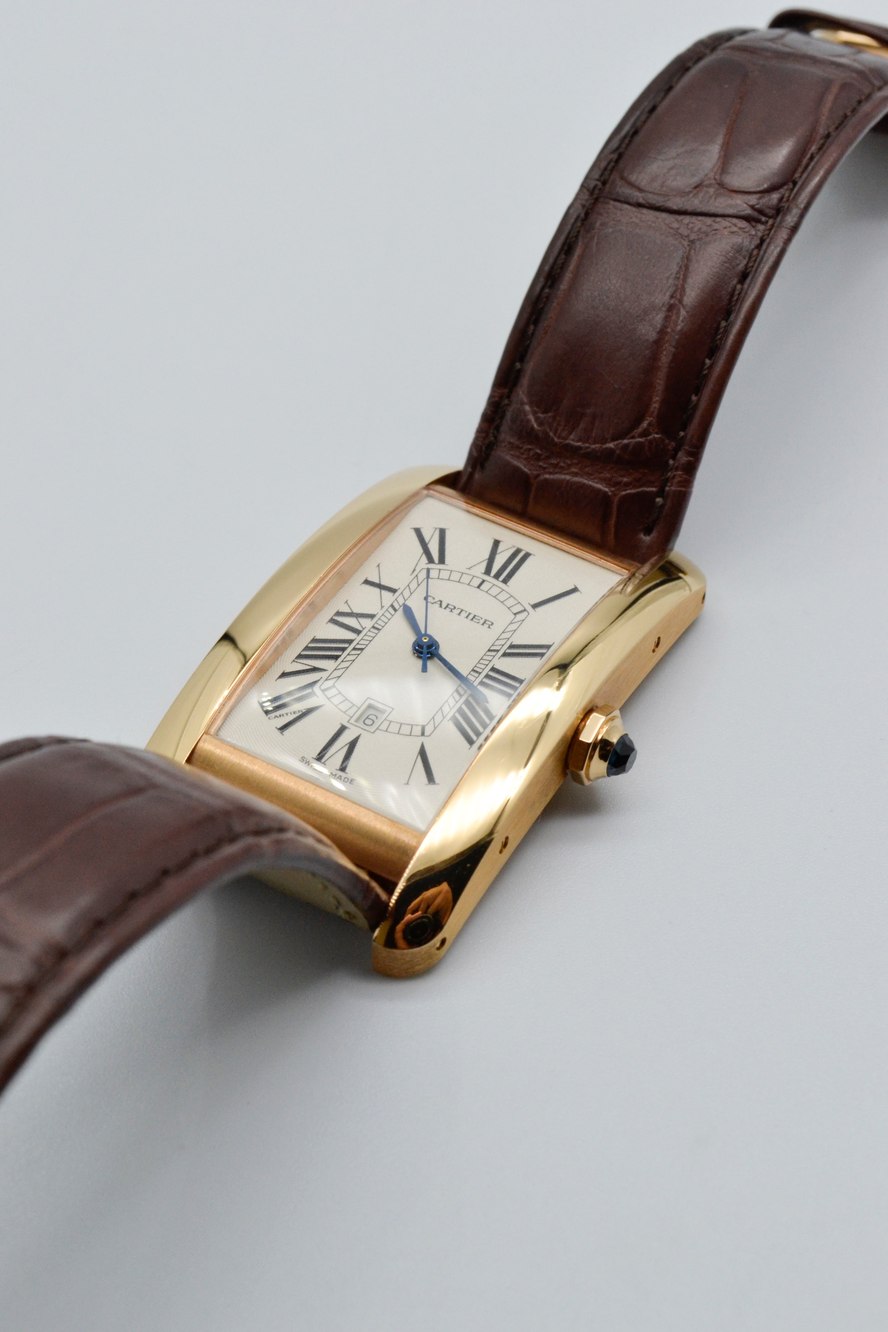 The Cartier Tank Américaine W2609156, introduced in 2005, exemplifies the maison's ability to merge timeless elegance with modern sophistication. Its elongated rectangular case, crafted from 18k rose gold, exudes warmth and luxury, while its rounded edges and sleek profile make it a refined statement piece. Measuring 45mm x 26mm, the watch sits gracefully on the wrist, offering a perfect blend of contemporary design and classic proportions.