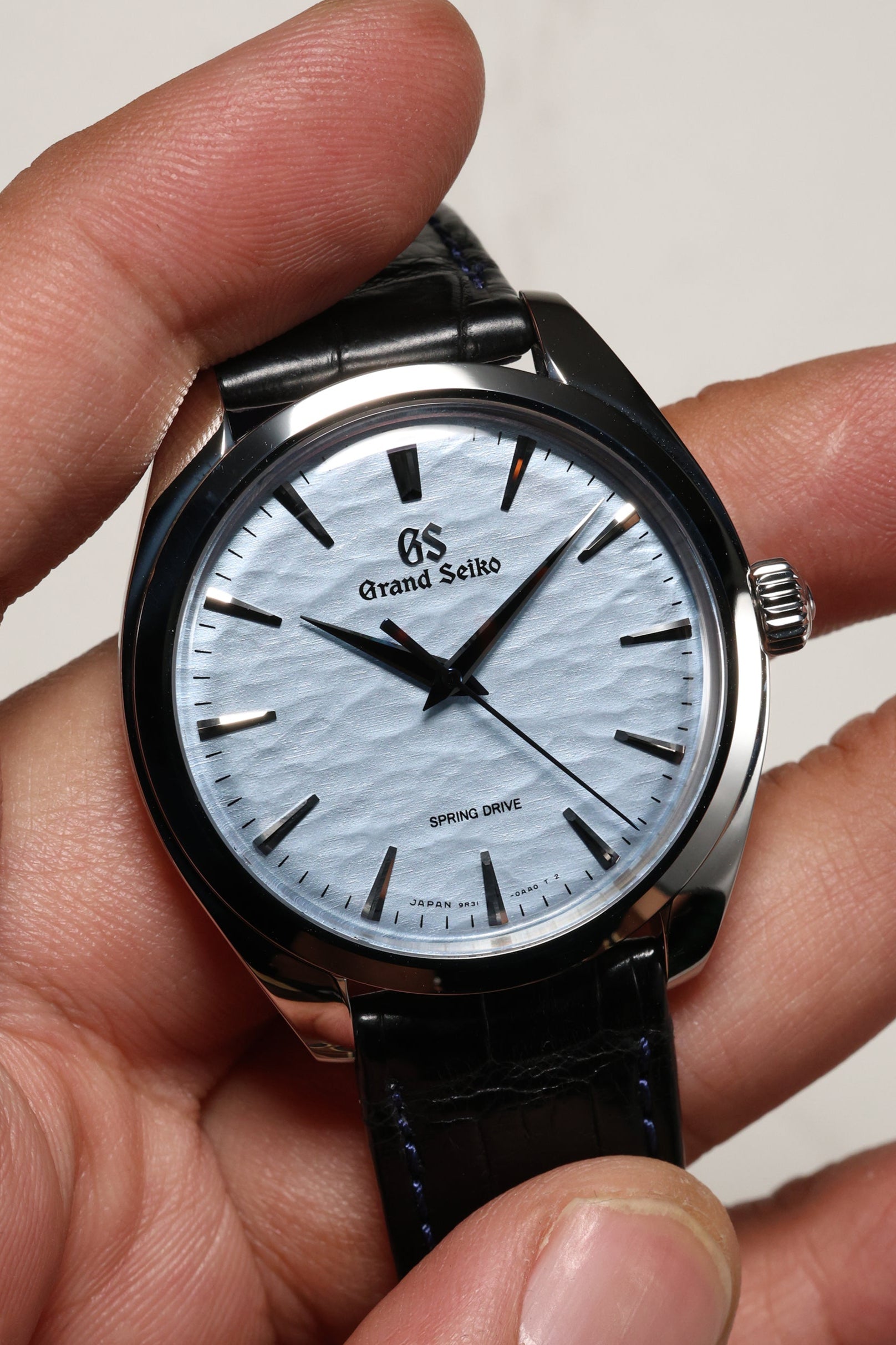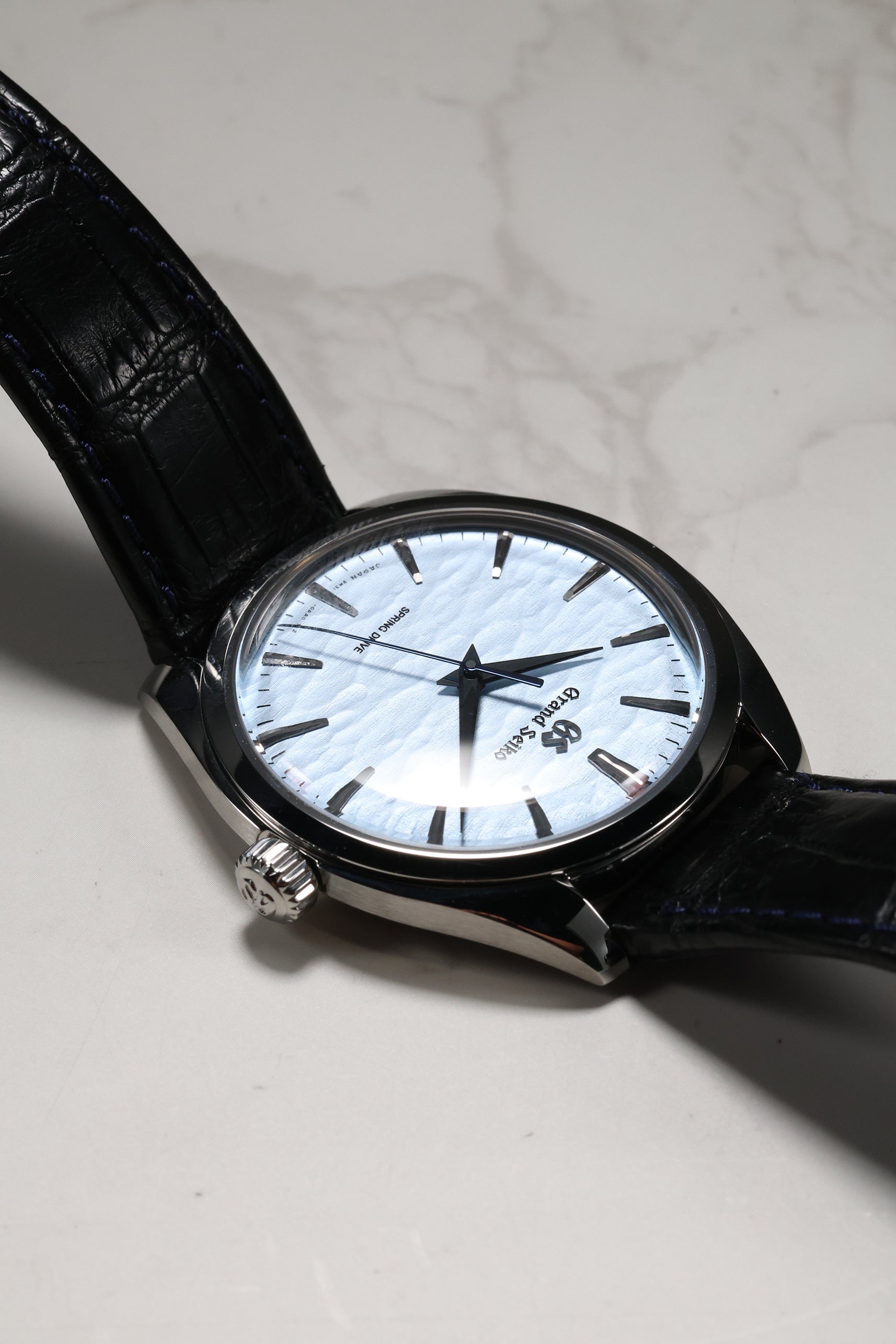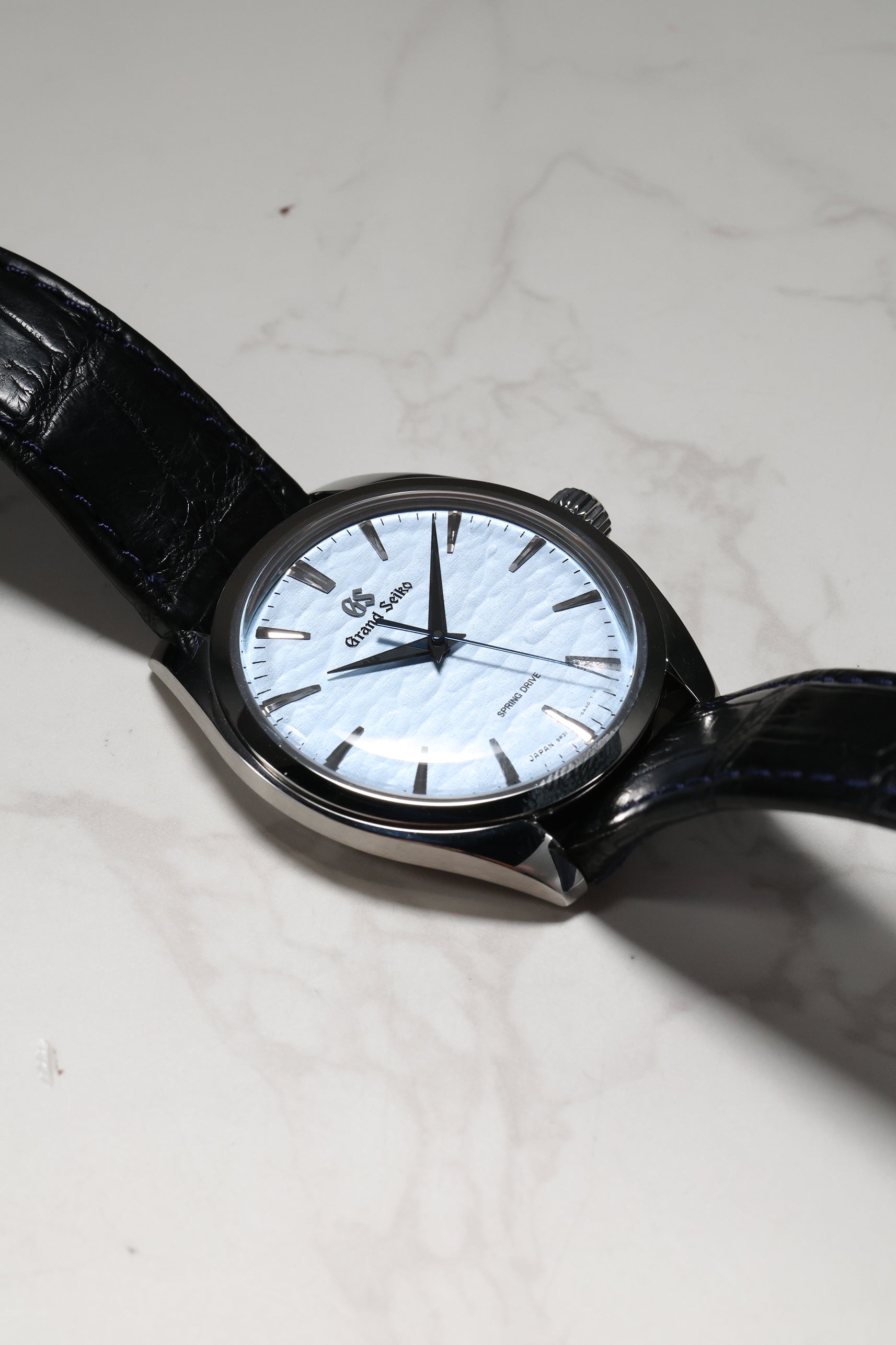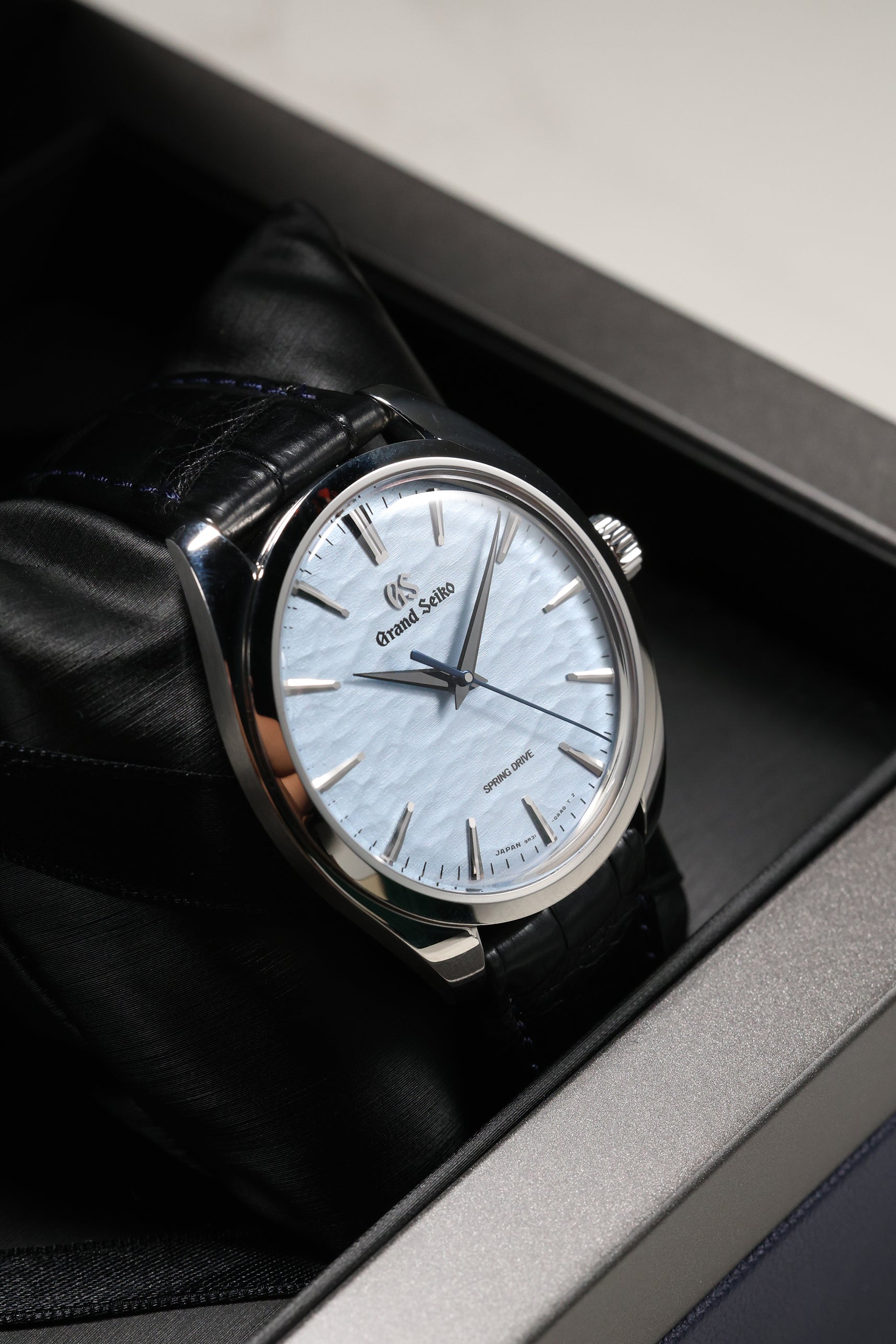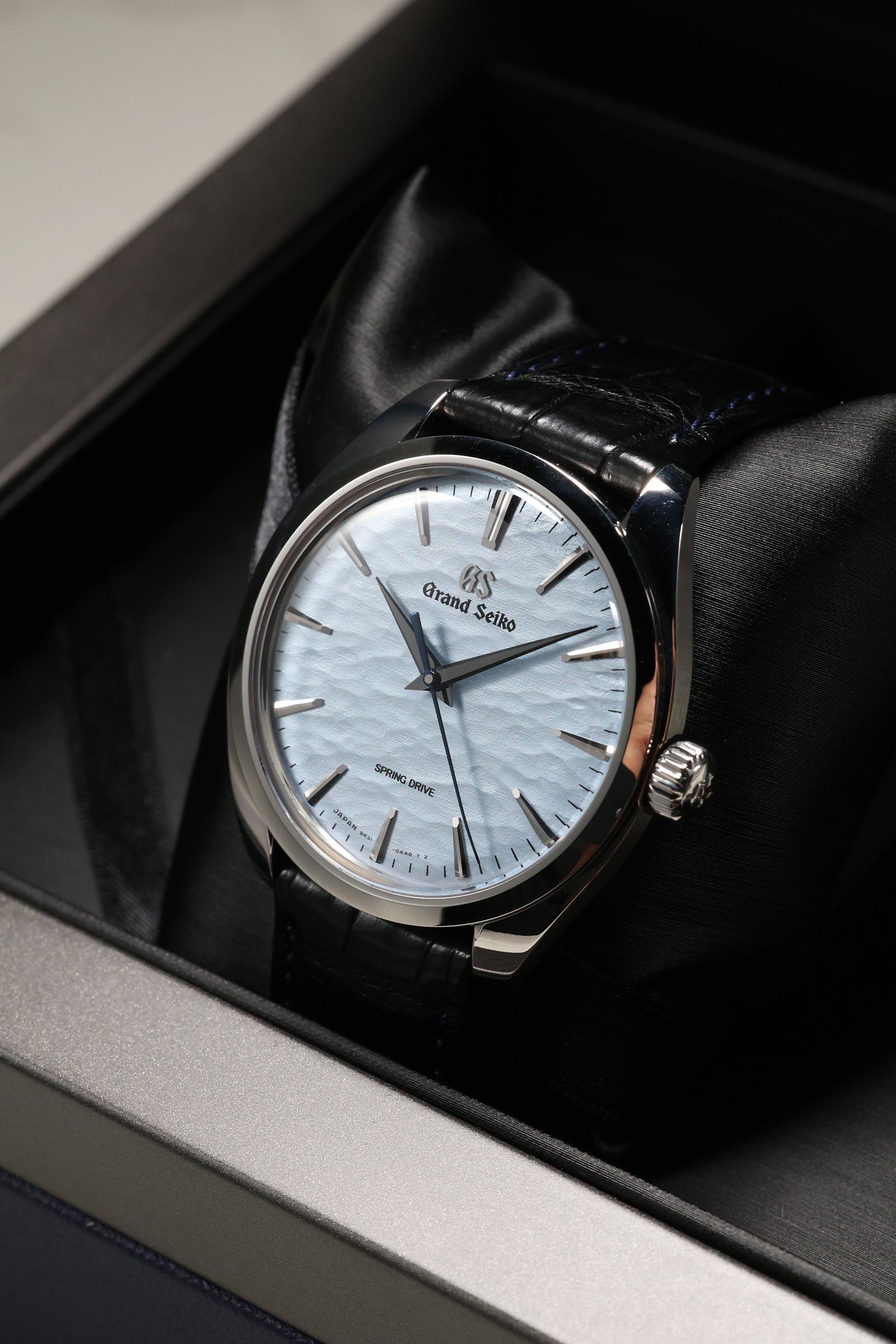 The watch is housed in a sleek 38.5mm stainless steel case, refined to elegant proportions with a slim 10.2mm profile. As part of Grand Seiko's Elegance line, it features the brand's signature Zaratsu polishing, which creates distortion-free mirror surfaces that play subtly with light. A curved sapphire crystal and recessed crown enhance the refined, almost vintage feel of the watch, while a dark blue crocodile strap brings tonal depth and complements the icy dial.