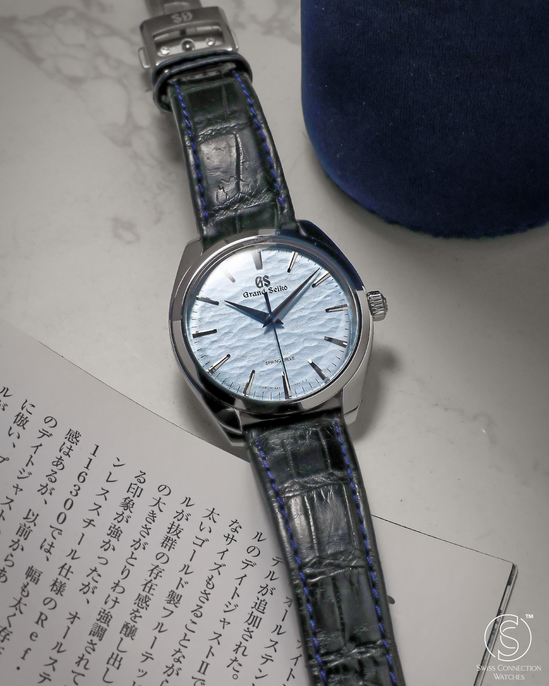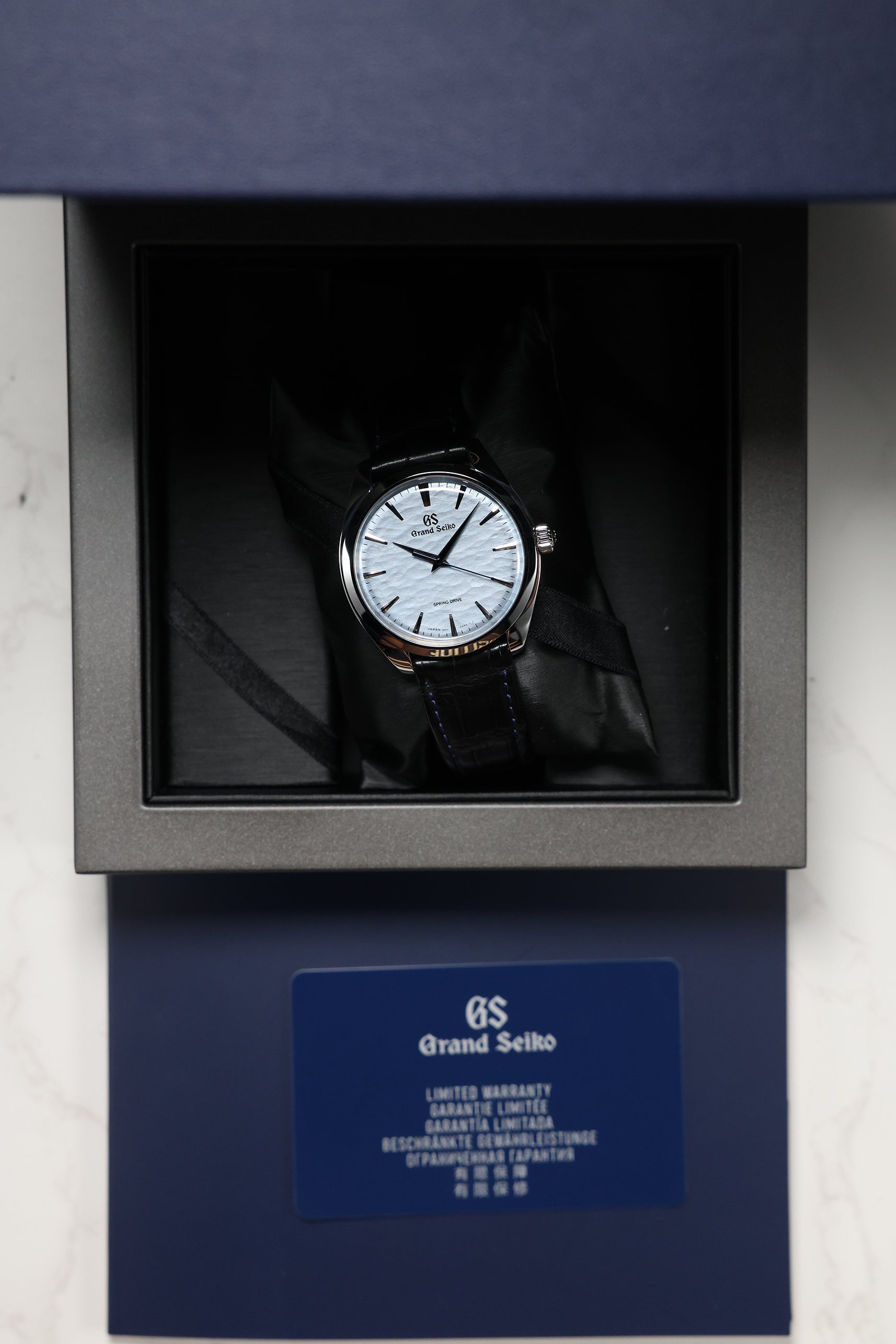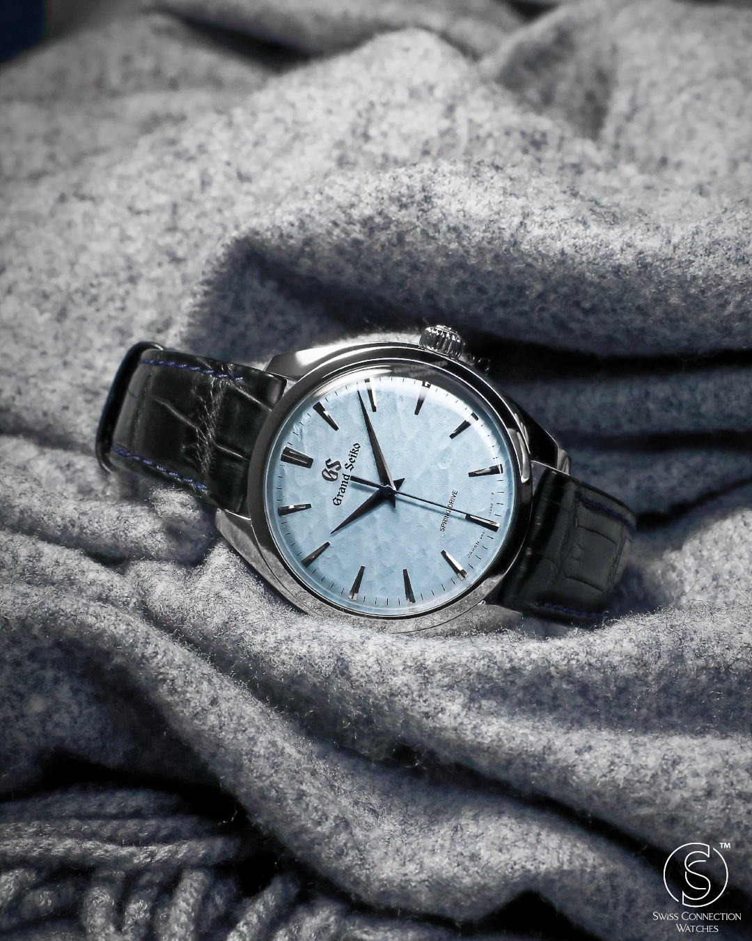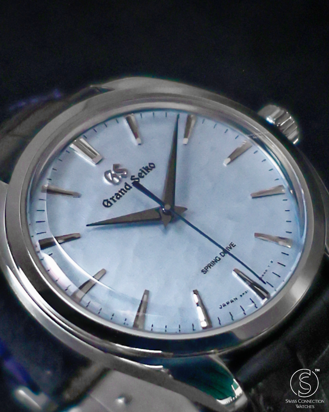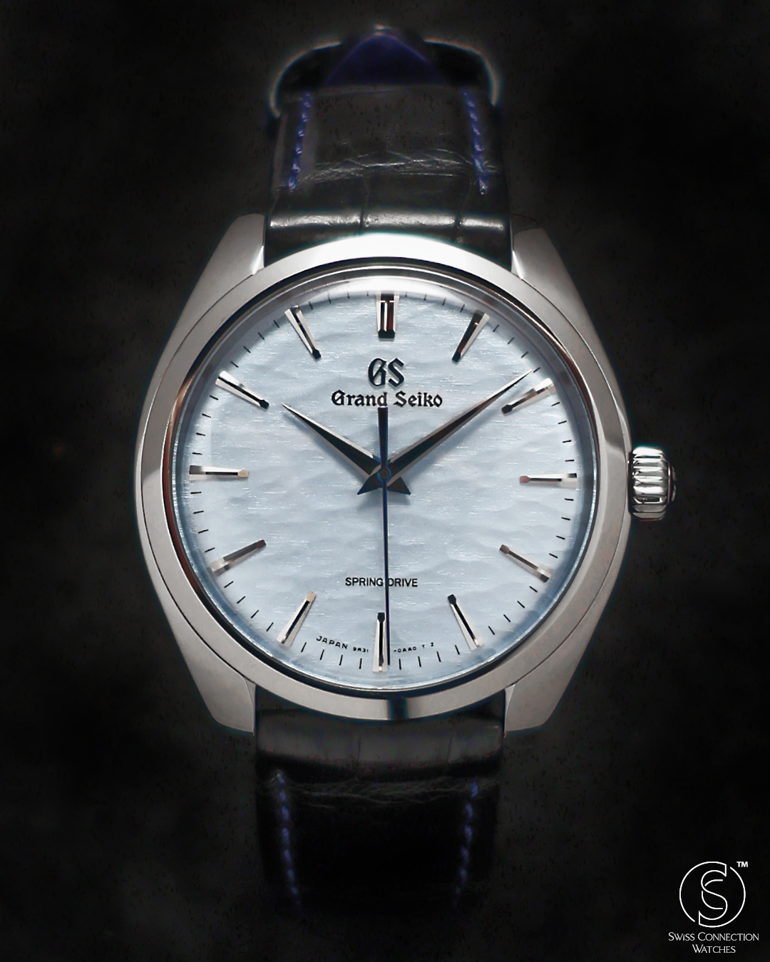 The watch is housed in a sleek 38.5mm stainless steel case, refined to elegant proportions with a slim 10.2mm profile. As part of Grand Seiko's Elegance line, it features the brand's signature Zaratsu polishing, which creates distortion-free mirror surfaces that play subtly with light. A curved sapphire crystal and recessed crown enhance the refined, almost vintage feel of the watch, while a dark blue crocodile strap brings tonal depth and complements the icy dial.