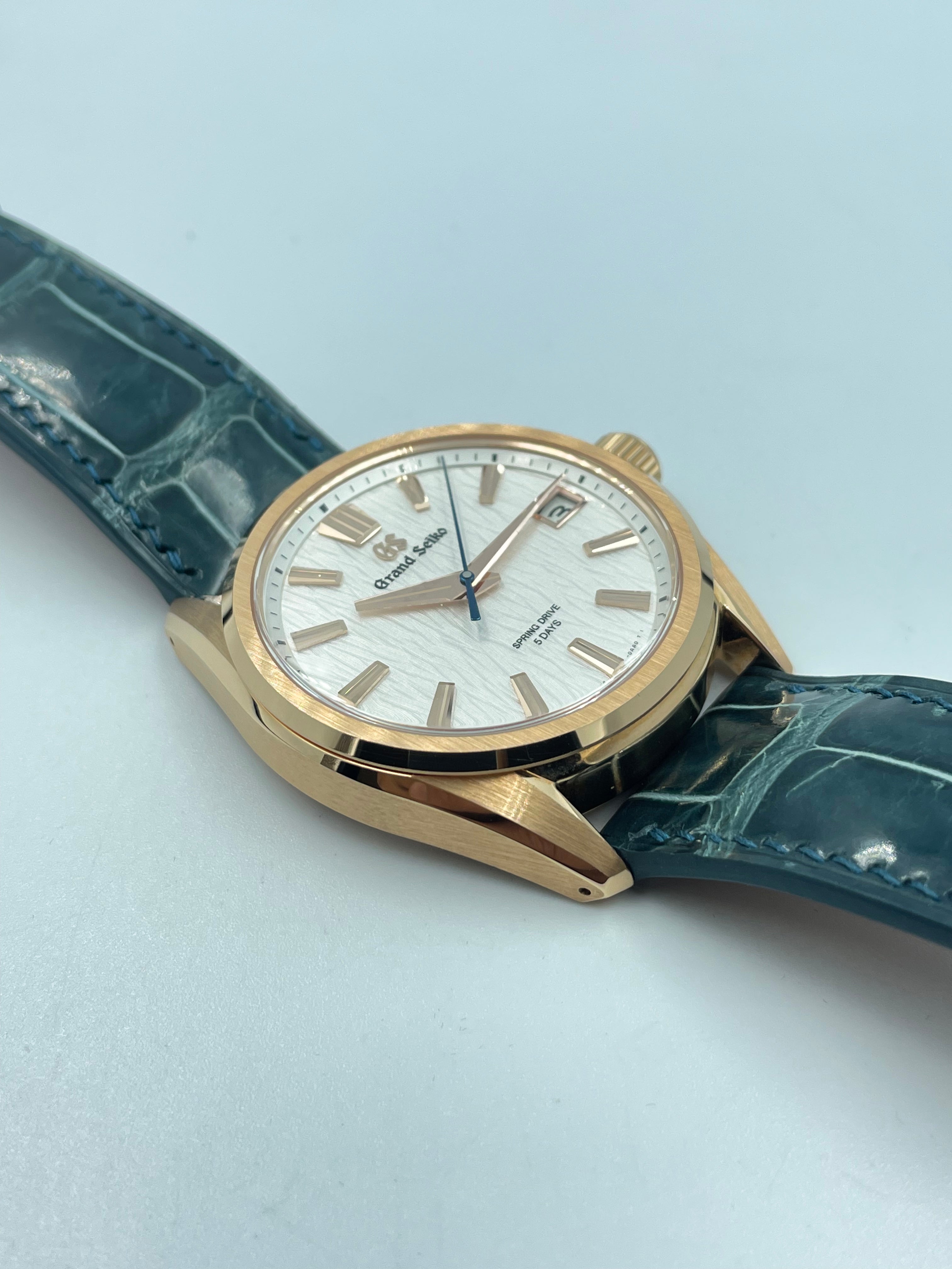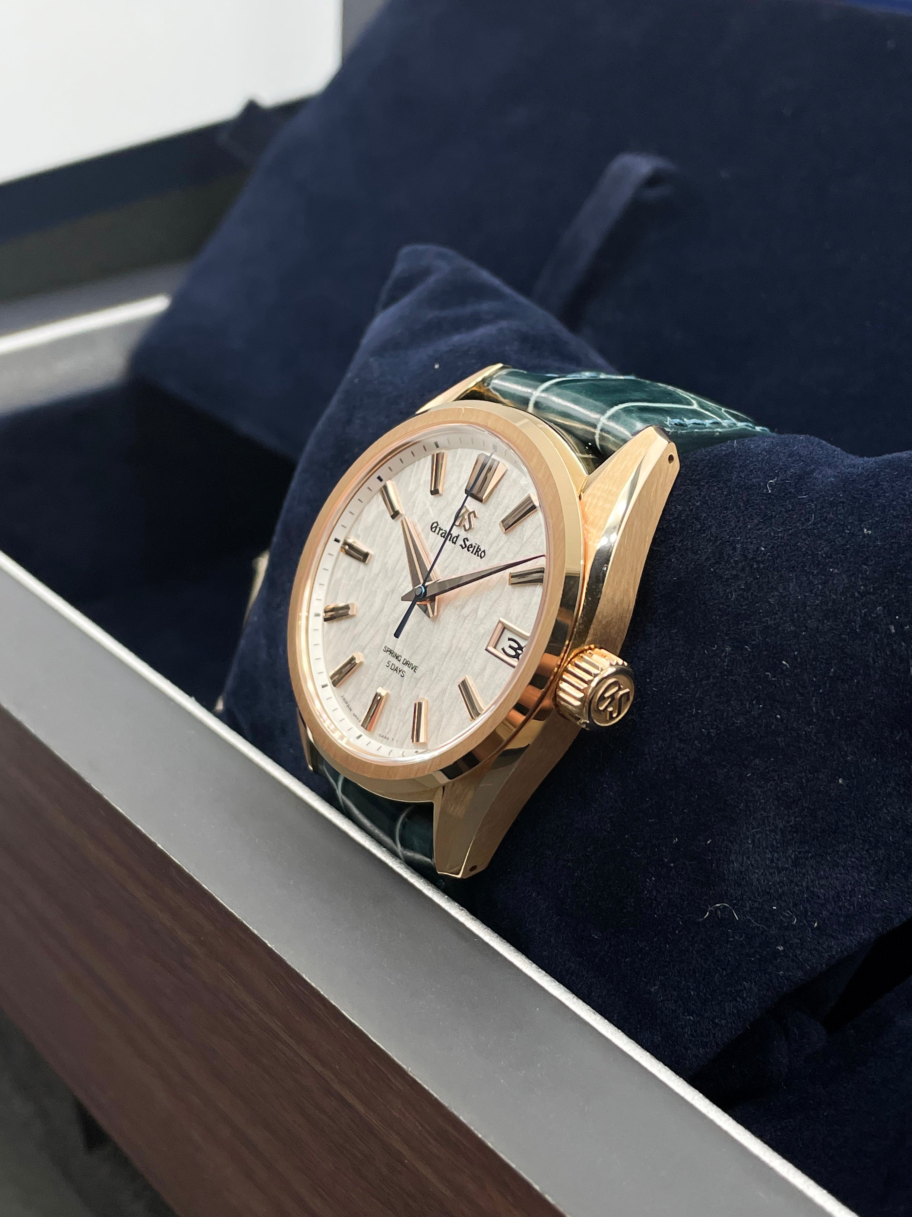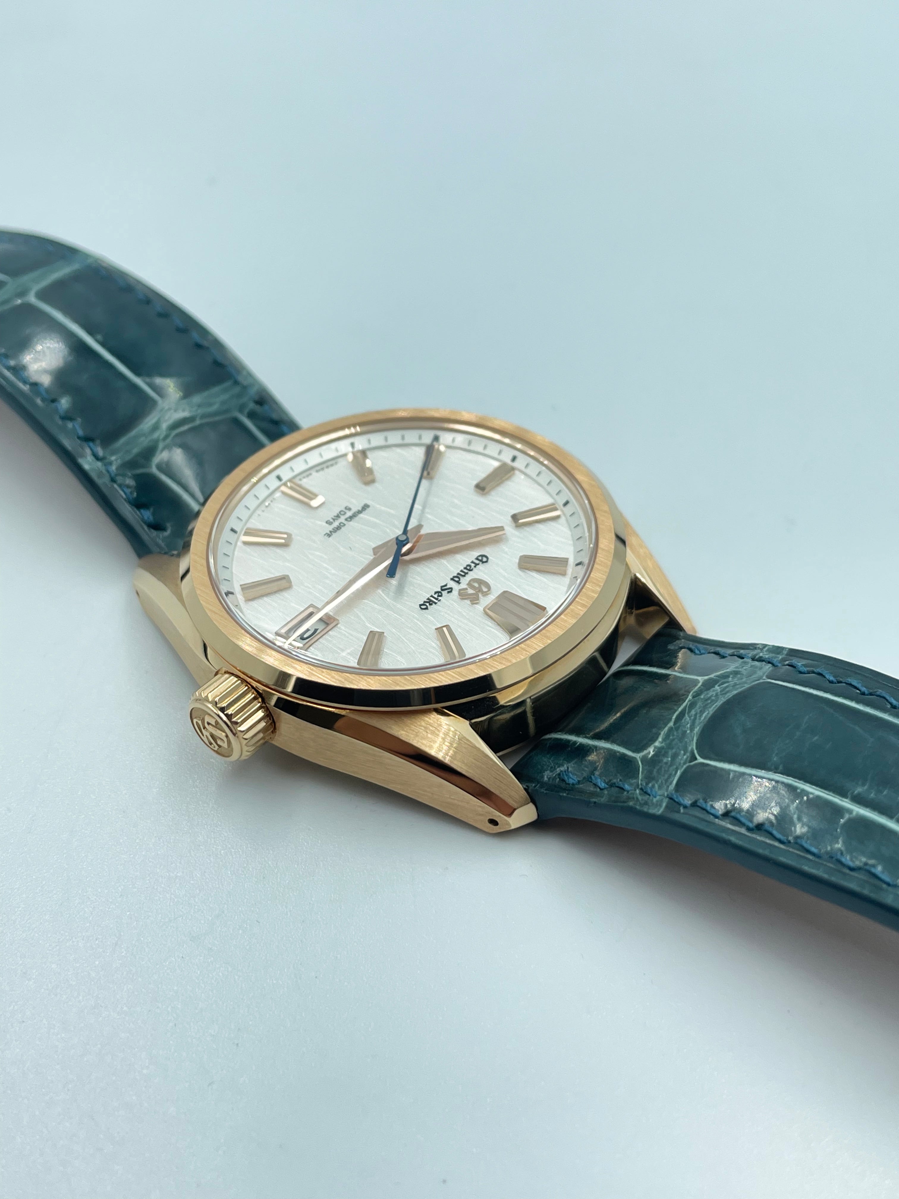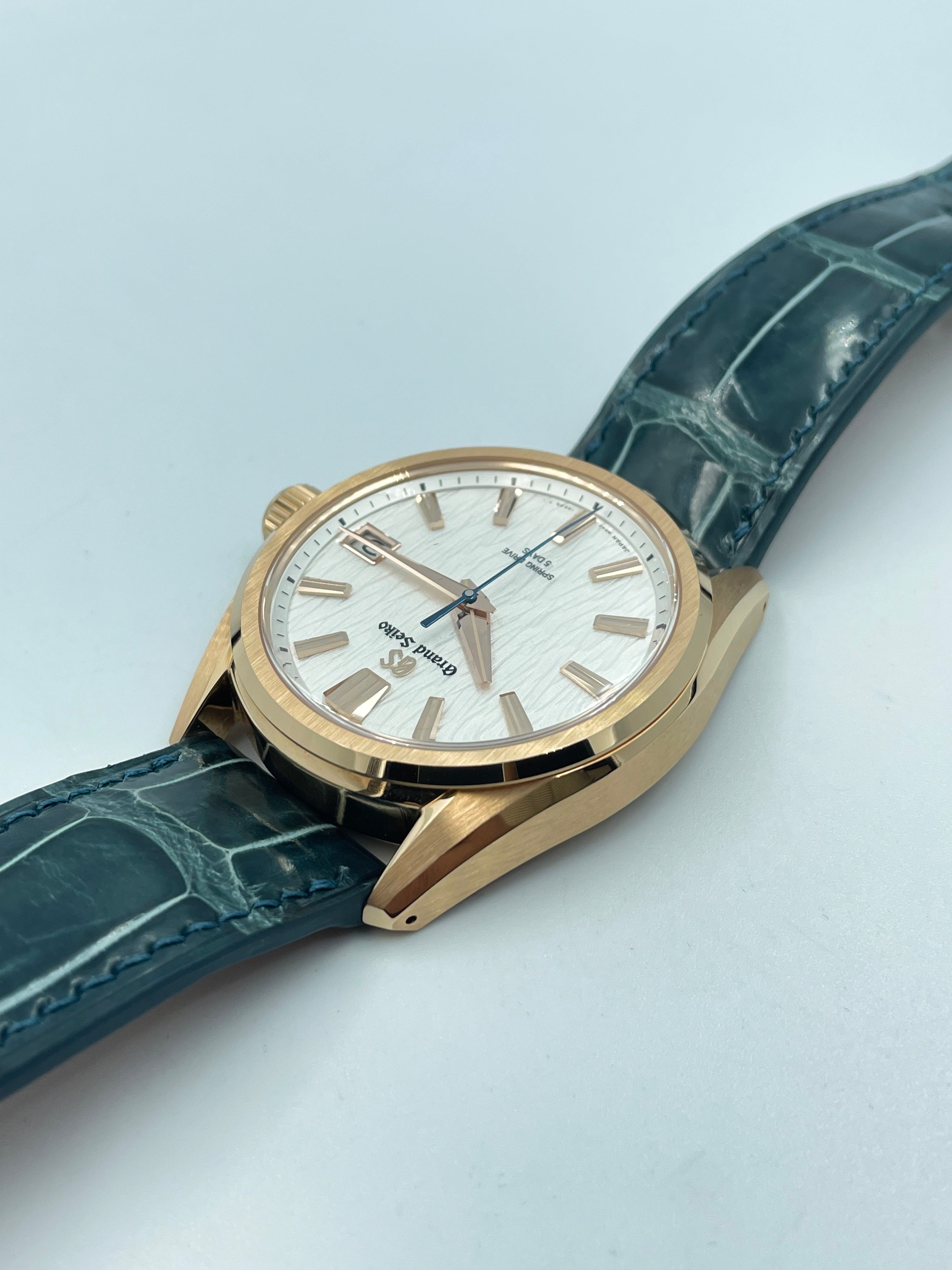 The Grand Seiko Evolution 9 Shirakaba SLGA016 is a compelling testament to the fusion of Japanese artistry and groundbreaking horological innovation. At its heart lies a dial of exceptional beauty, its intricate texture meticulously crafted to evoke the serene white birch (Shirakaba) forests near Grand Seiko’s Shinshu studio. This artistic rendering of nature's tranquility is beautifully framed by the warm embrace of a 40mm rose gold case, creating a harmonious blend of organic inspiration and luxurious material.