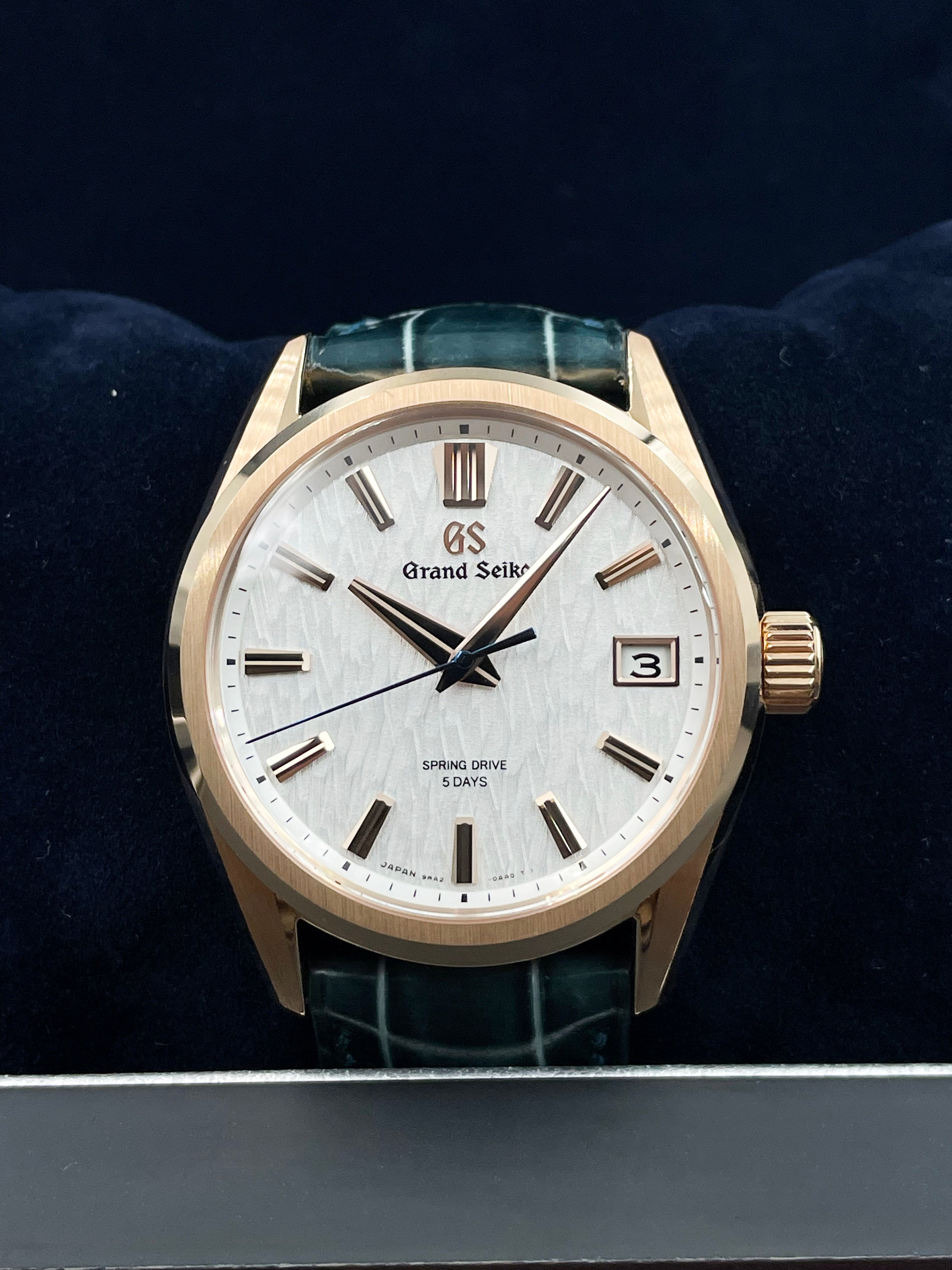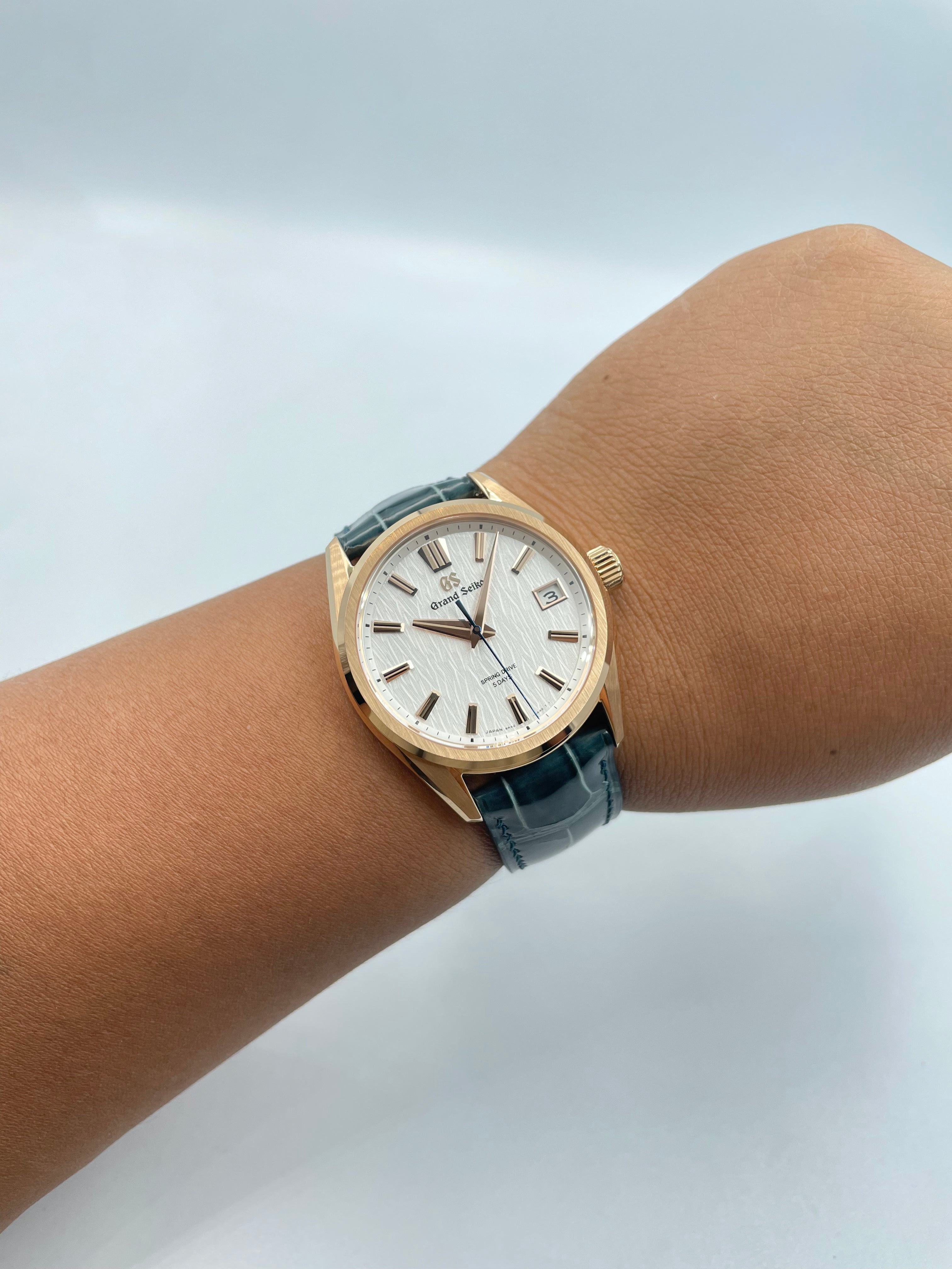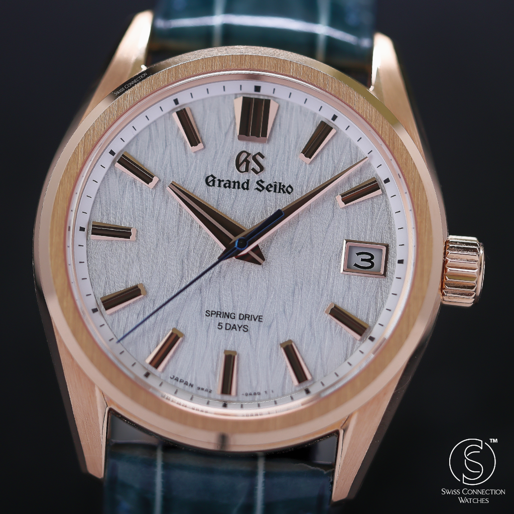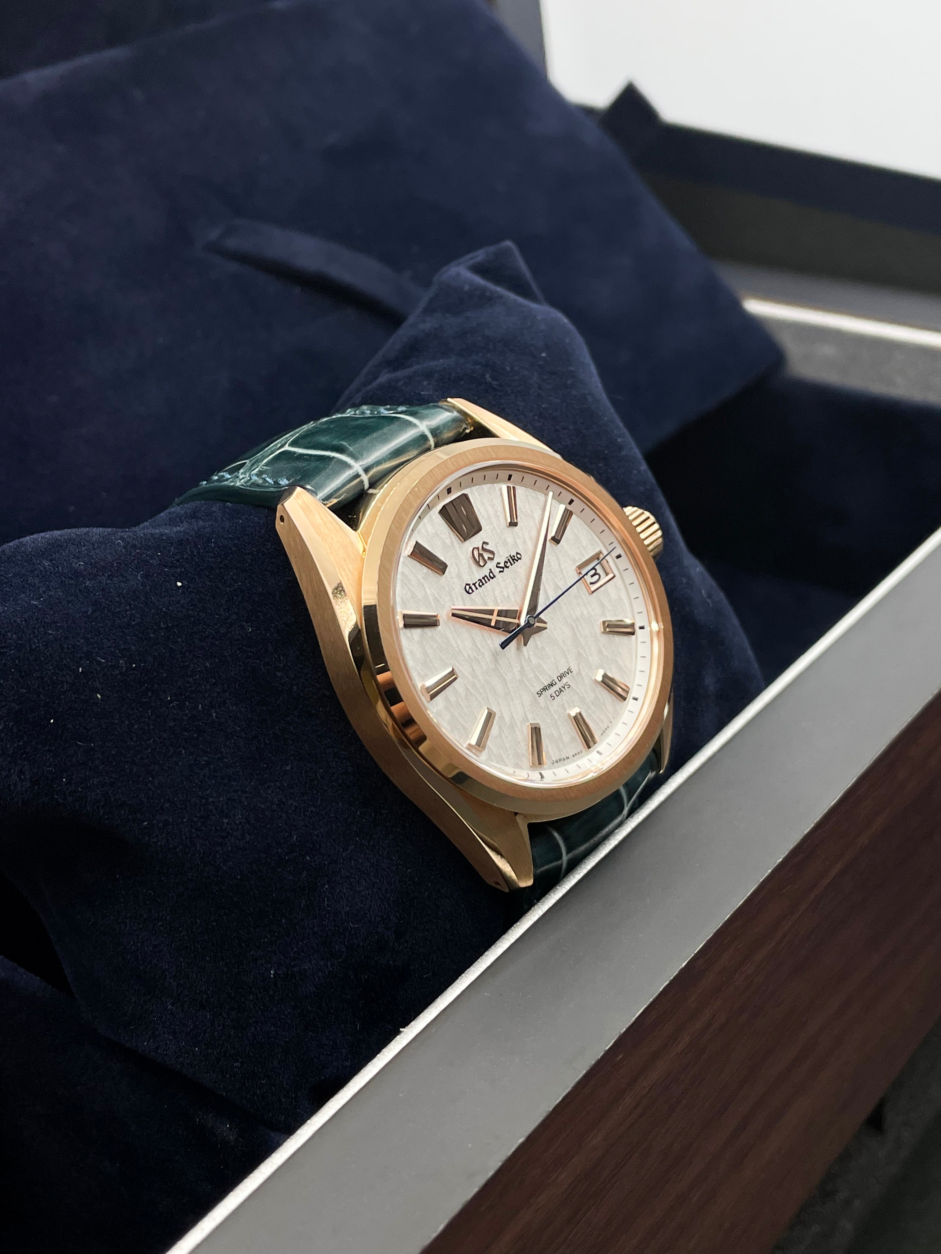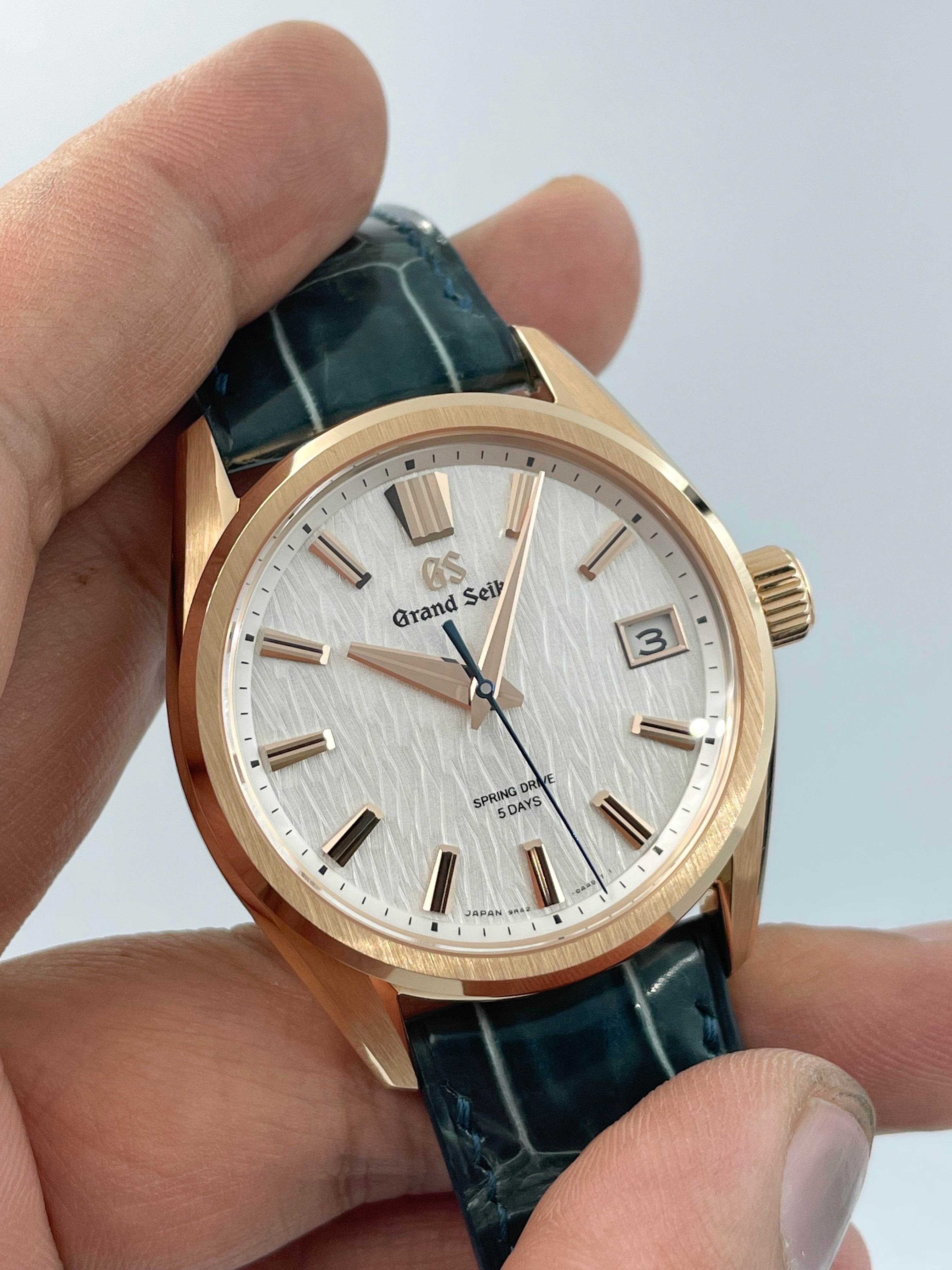 The Grand Seiko Evolution 9 Shirakaba SLGA016 is a compelling testament to the fusion of Japanese artistry and groundbreaking horological innovation. At its heart lies a dial of exceptional beauty, its intricate texture meticulously crafted to evoke the serene white birch (Shirakaba) forests near Grand Seiko’s Shinshu studio. This artistic rendering of nature's tranquility is beautifully framed by the warm embrace of a 40mm rose gold case, creating a harmonious blend of organic inspiration and luxurious material.