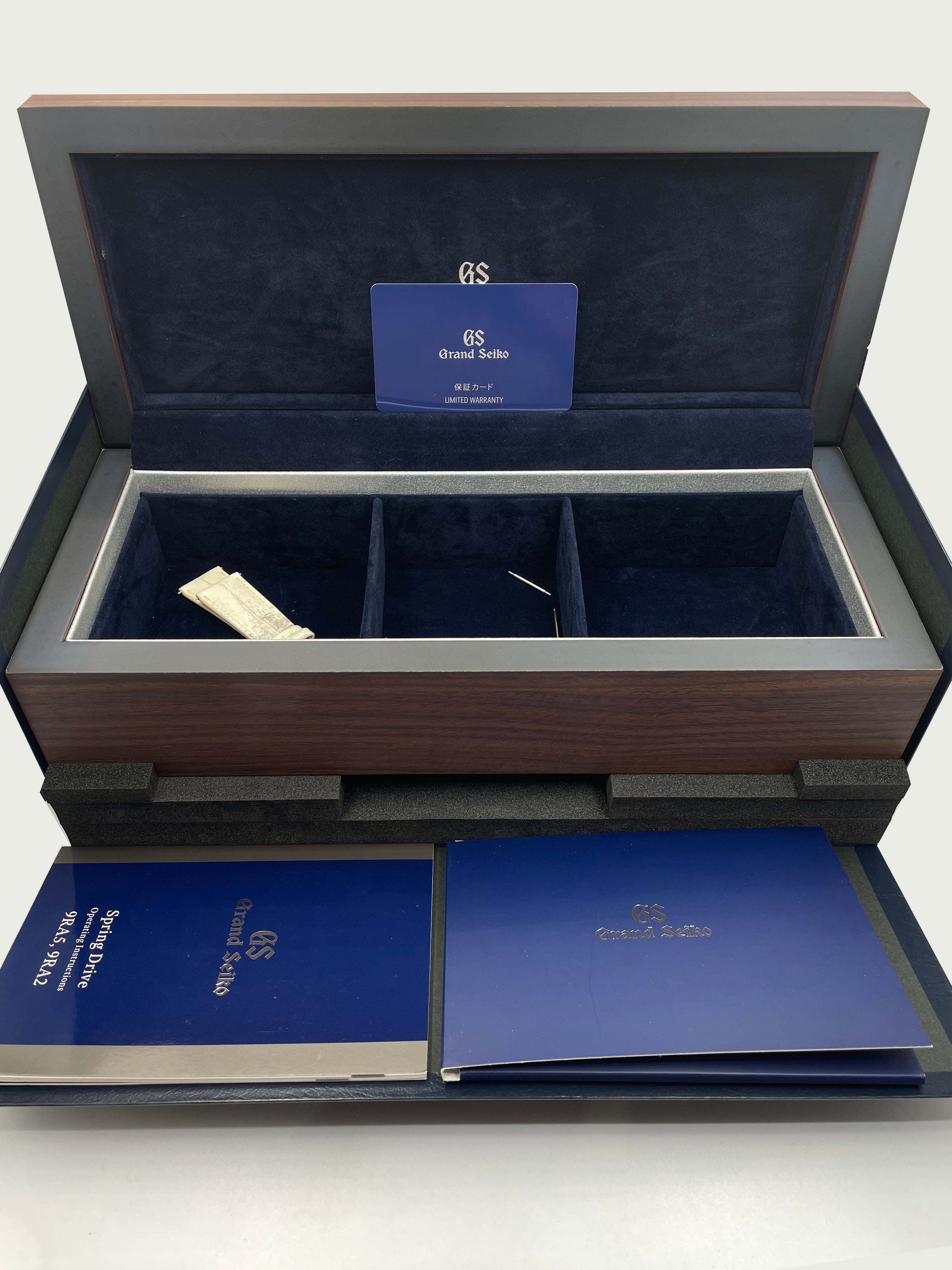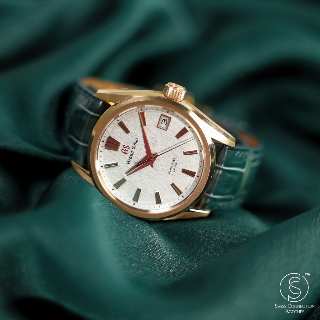 Complementing this artistic dial is Grand Seiko's revolutionary Spring Drive Caliber 9RA2. This innovative movement represents a unique synthesis of quartz accuracy and the graceful glide of mechanical hands, achieving an impressive precision of ±0.5 seconds per day and a remarkable 120-hour power reserve. The seamless sweep of the seconds hand across the textured dial is a visual representation of this horological innovation, visible through the exhibition case back.