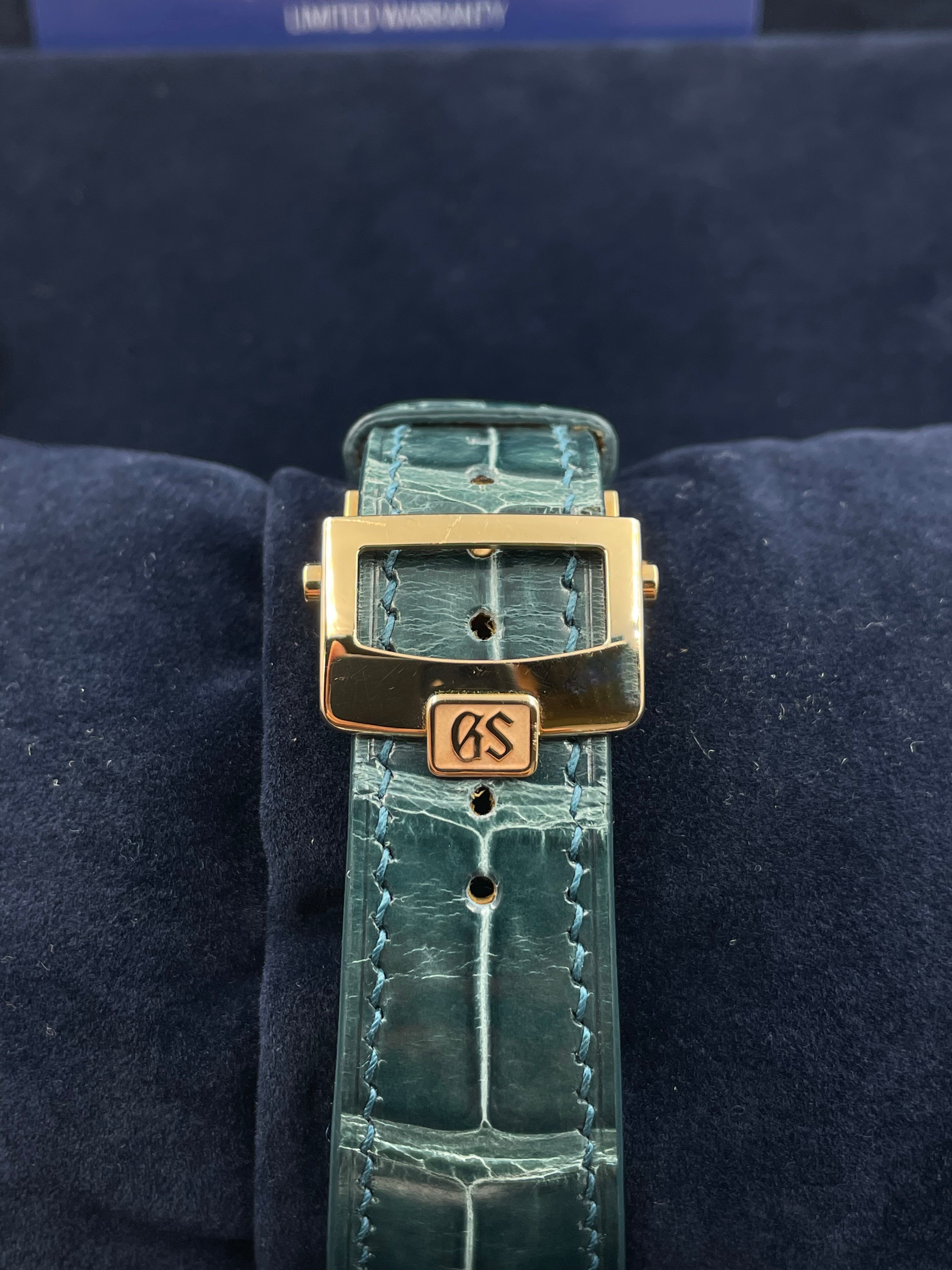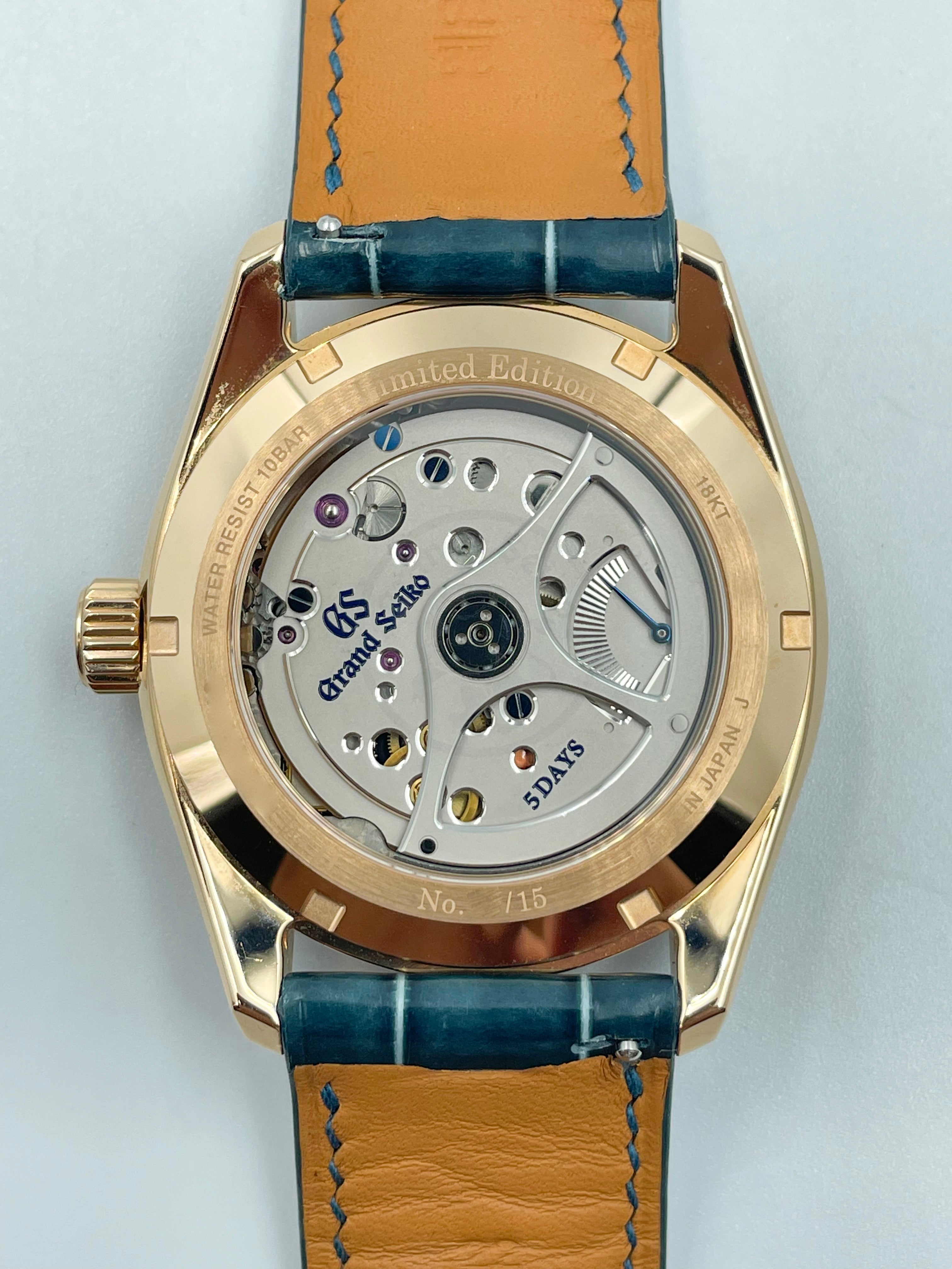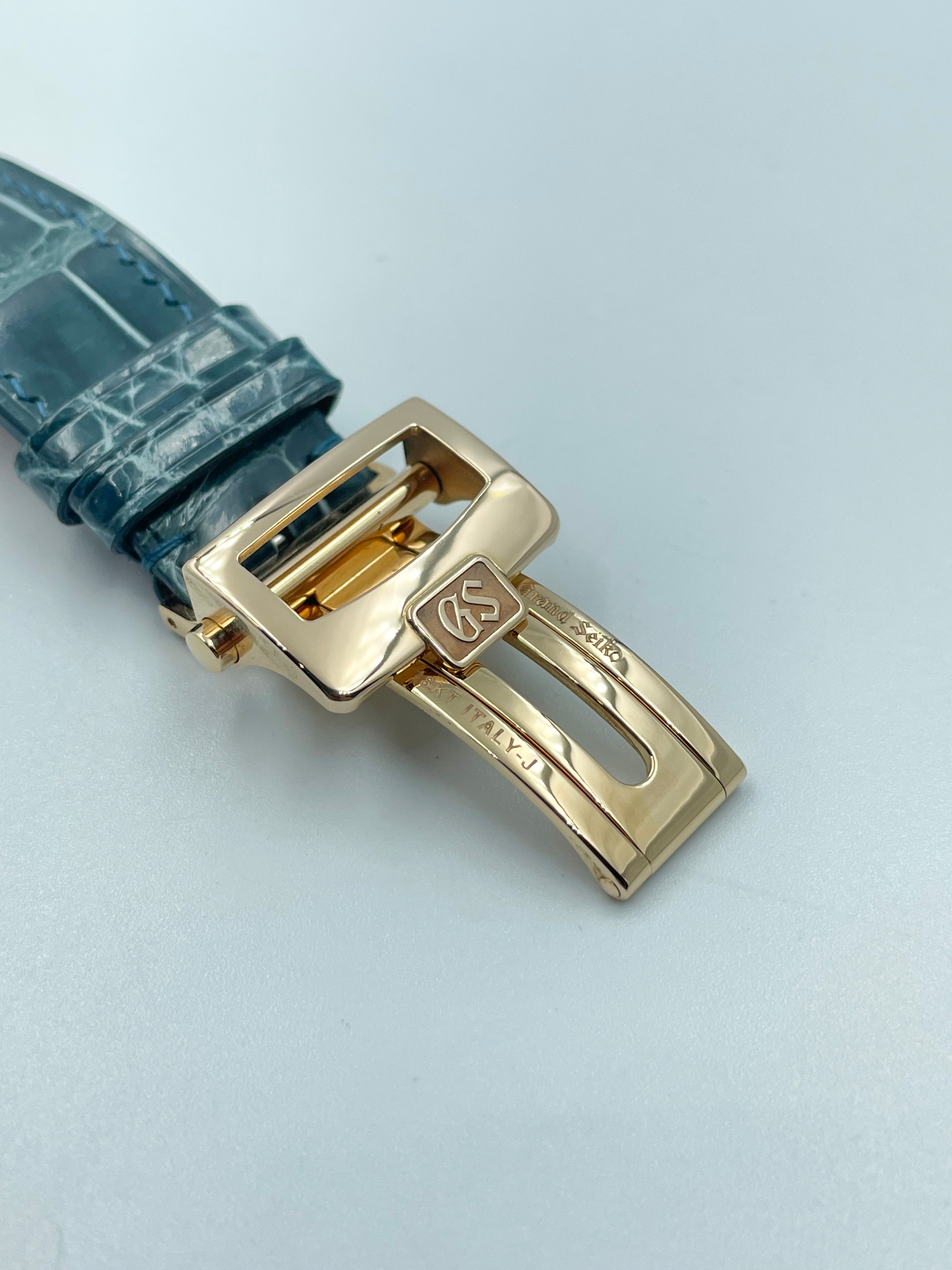 The "Evolution 9 Style" design language further enhances the artistry and legibility of the SLGA016. Bold, precisely finished hands and prominent markers stand out against the textured dial, ensuring effortless time reading. The warmth of the rose gold case, with its signature Zaratsu polishing, adds a layer of refined beauty, while the deep blue alligator strap provides a sophisticated and comfortable contrast, underscoring the watch's artistic flair.