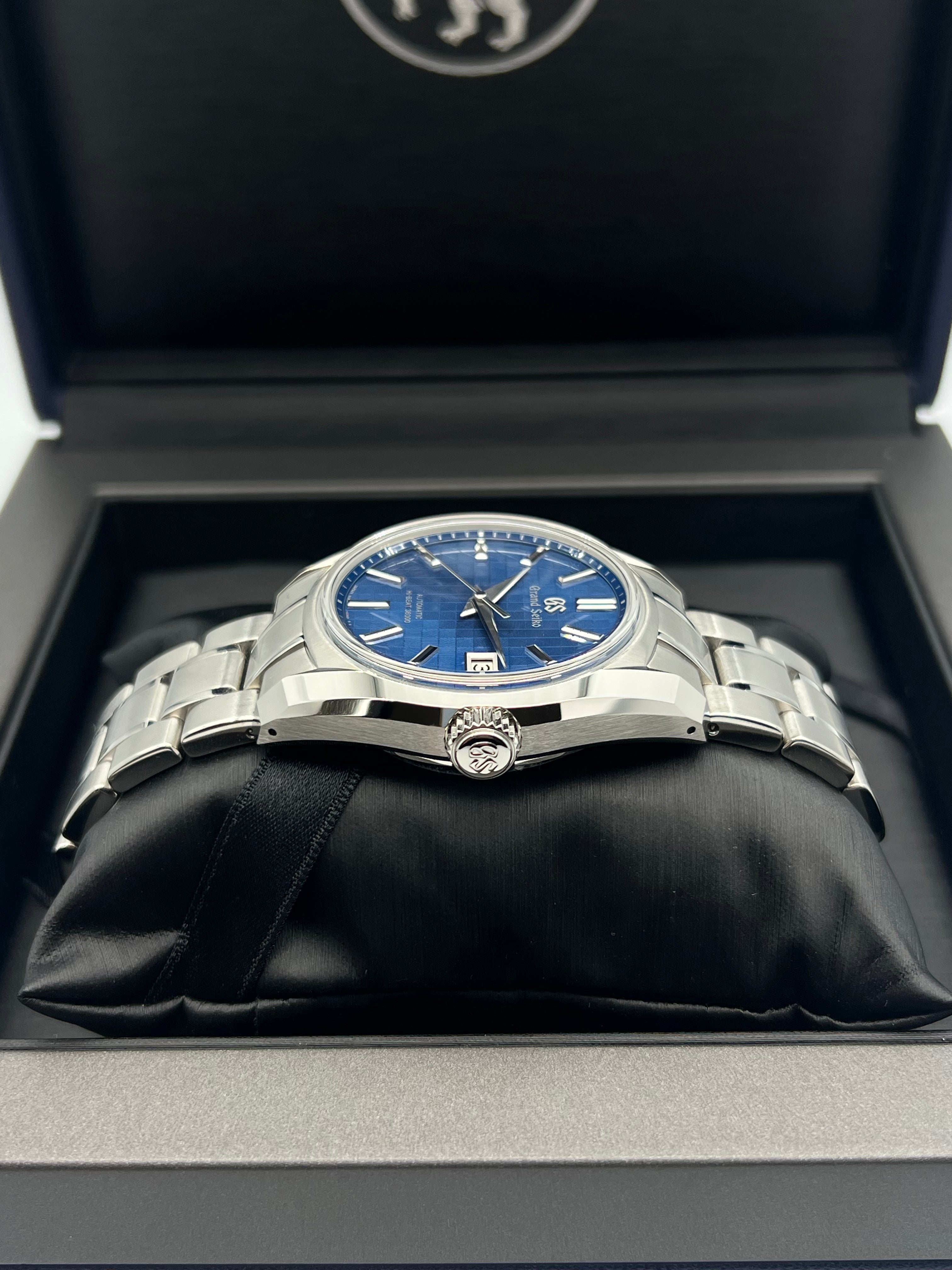 The heart of the SBGH315 is its mesmerizing blue dial, a testament to Grand Seiko's renowned mastery of texture and light. A unique "Ginza grid" pattern, subtly transparent, overlays a finely stamped lattice, creating a dynamic interplay of geometric precision and organic depth. The deep blue hue evokes the twilight glow over Ginza's iconic skyline, while meticulously polished hour markers and razor-sharp hands ensure brilliance and clarity. This dial rewards close inspection, revealing a sophisticated, architectural composition deeply rooted in its place of inspiration.