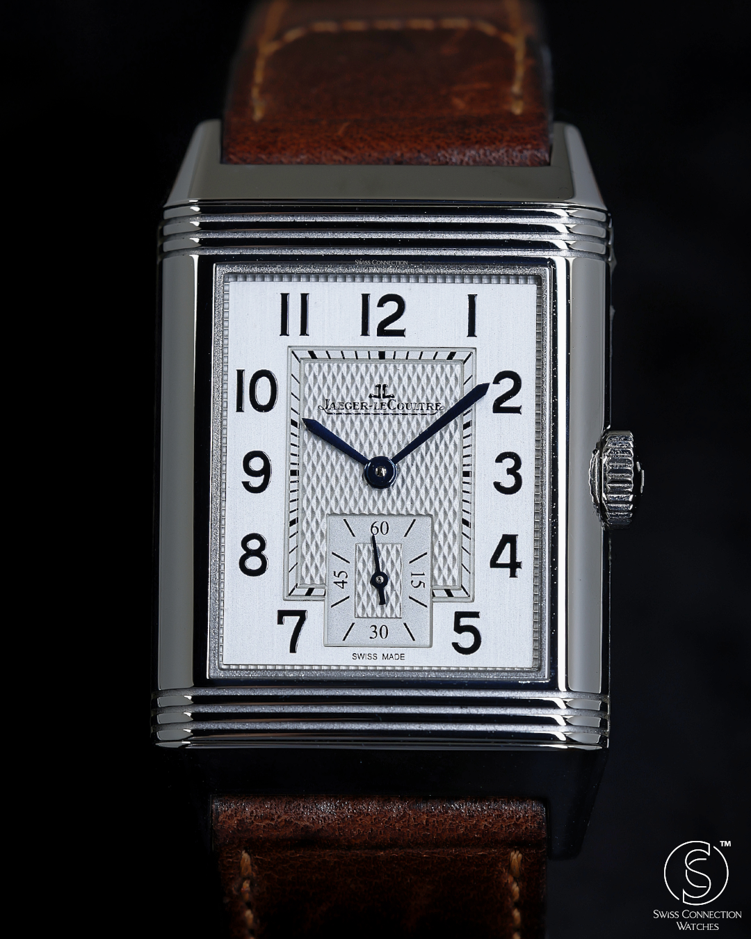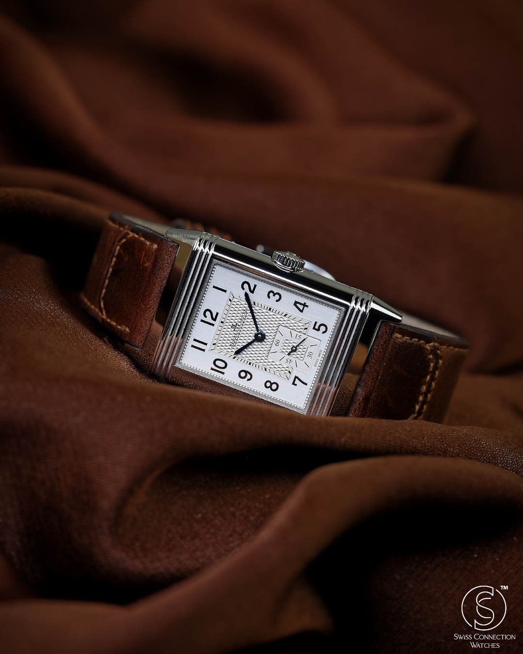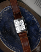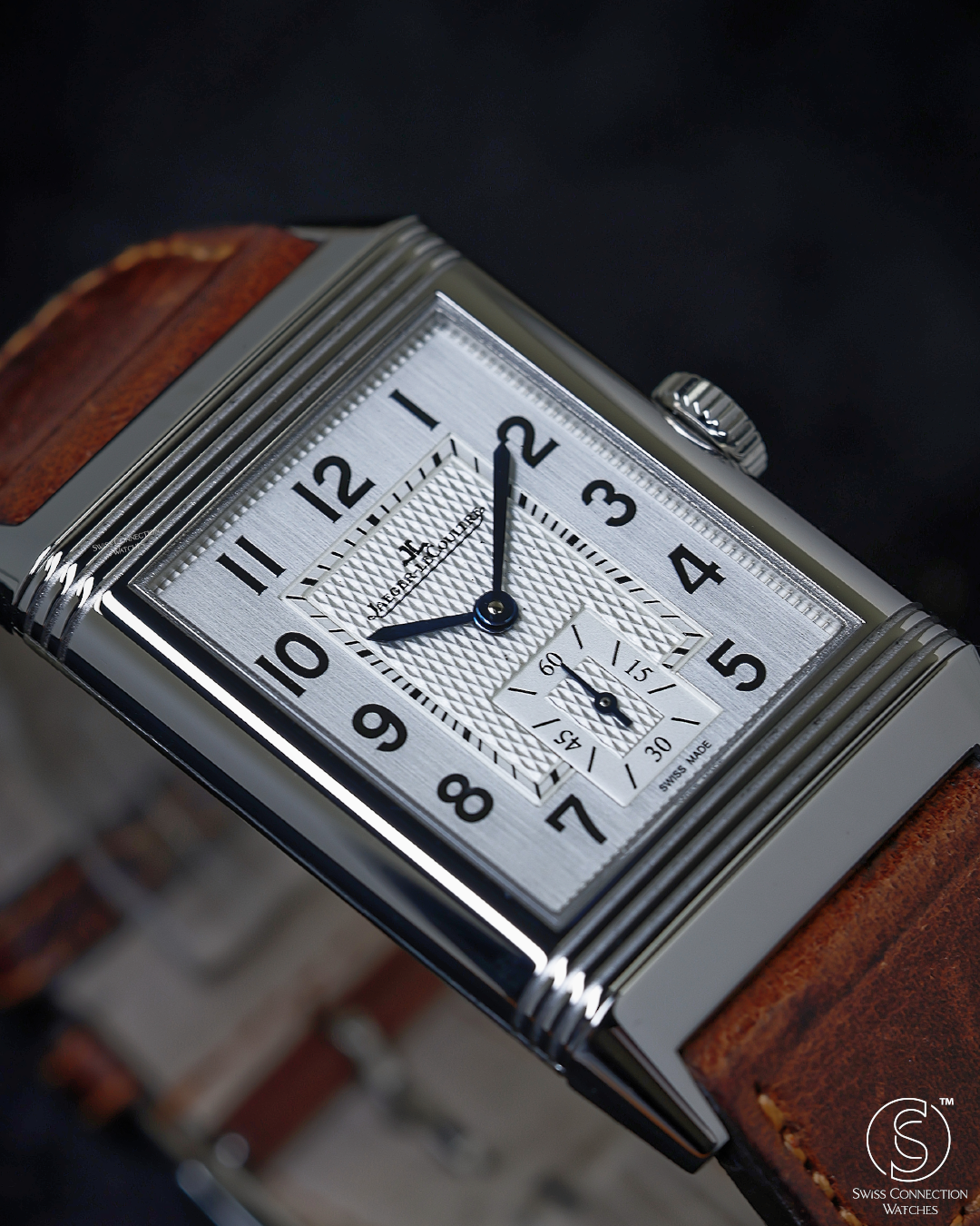 The front dial is a celebration of symmetry and texture—a silvered guilloché center framed by a vertically brushed outer track. Bold black Arabic numerals, blued sword-shaped hands, and a recessed small seconds subdial at 6 o’clock evoke a sense of classical balance, while remaining crisp and contemporary. This is the Reverso at its most traditional: pure, understated, and quietly confident—a perfect companion for daily wear or formal occasions.