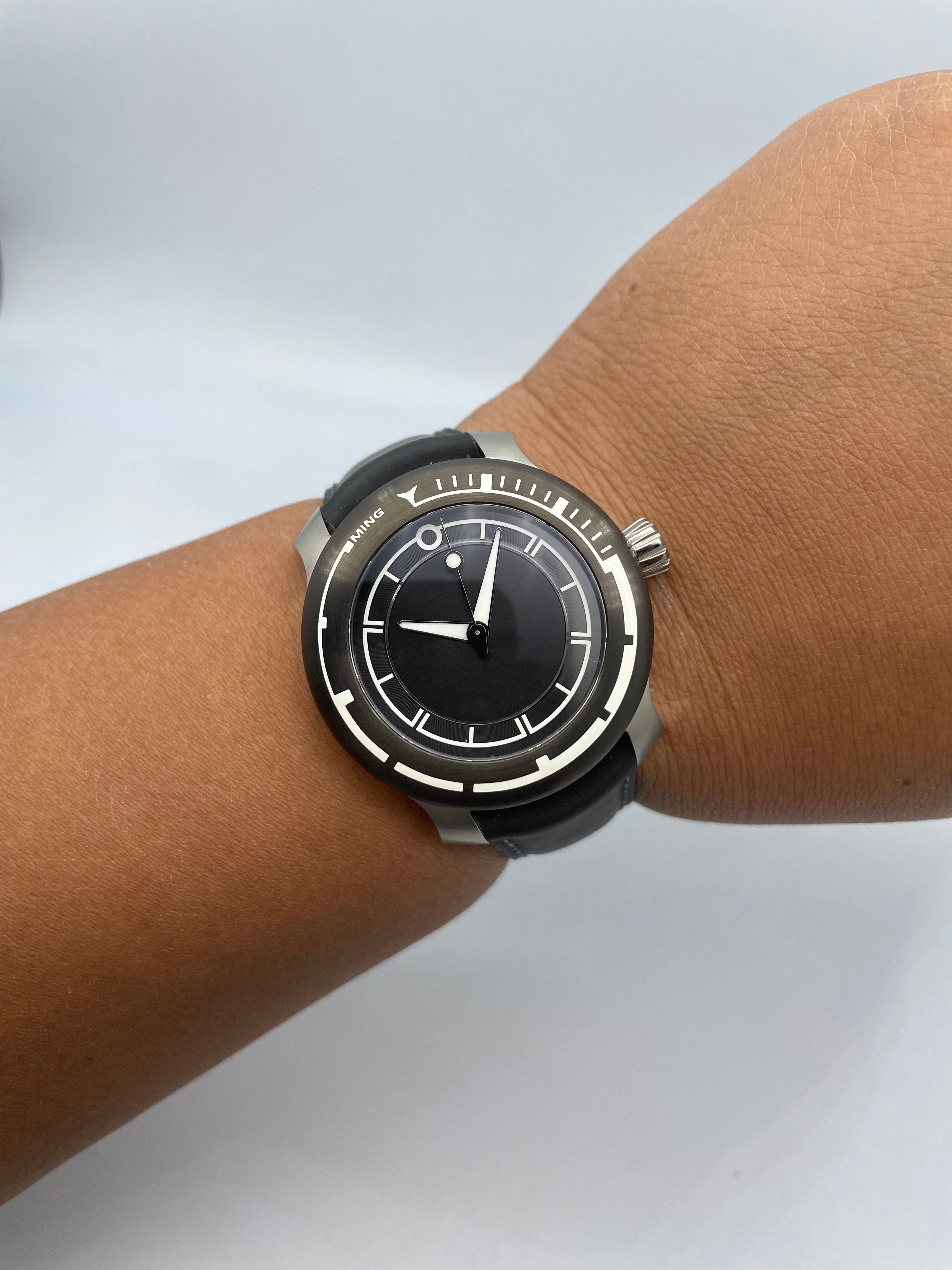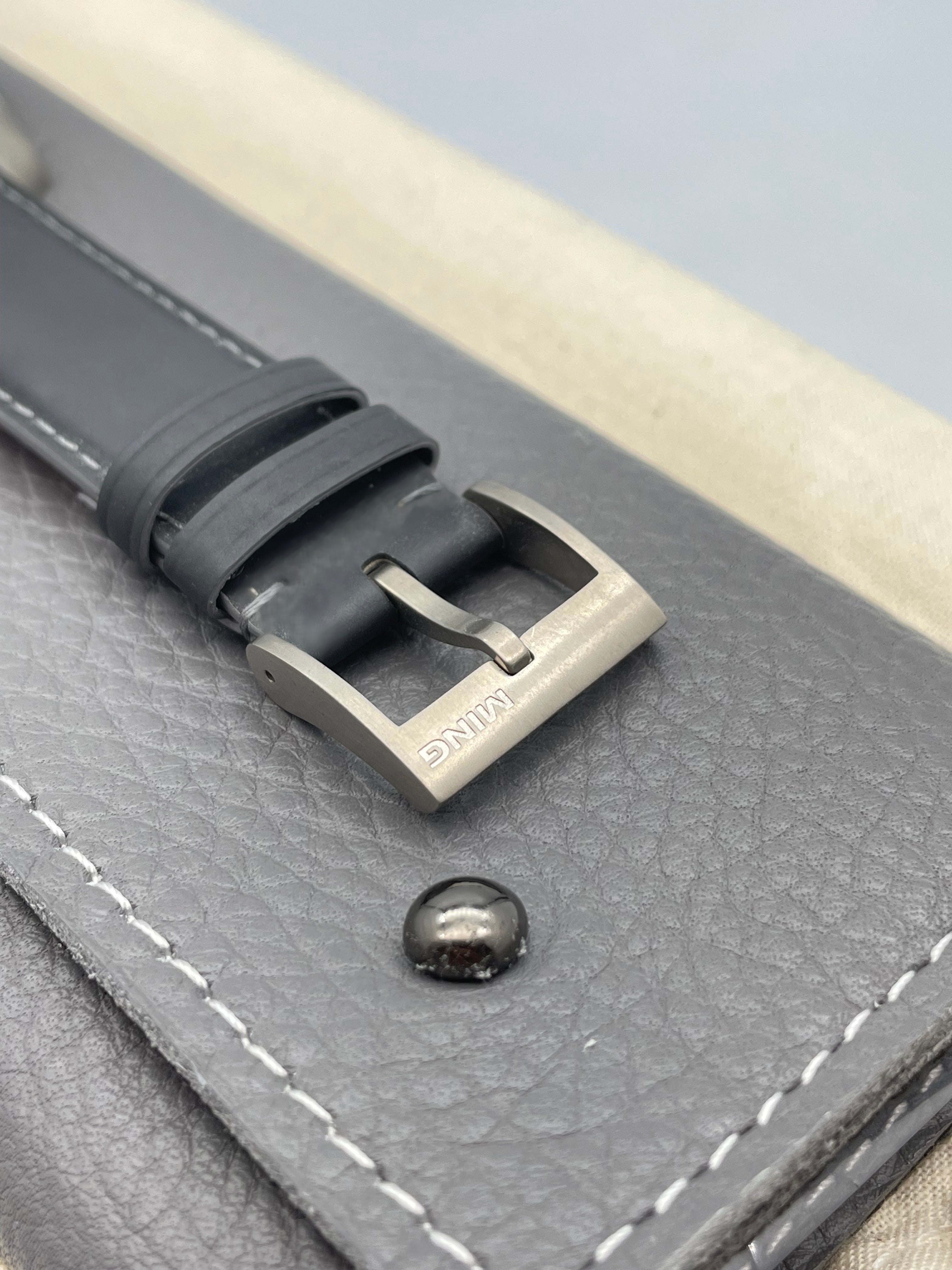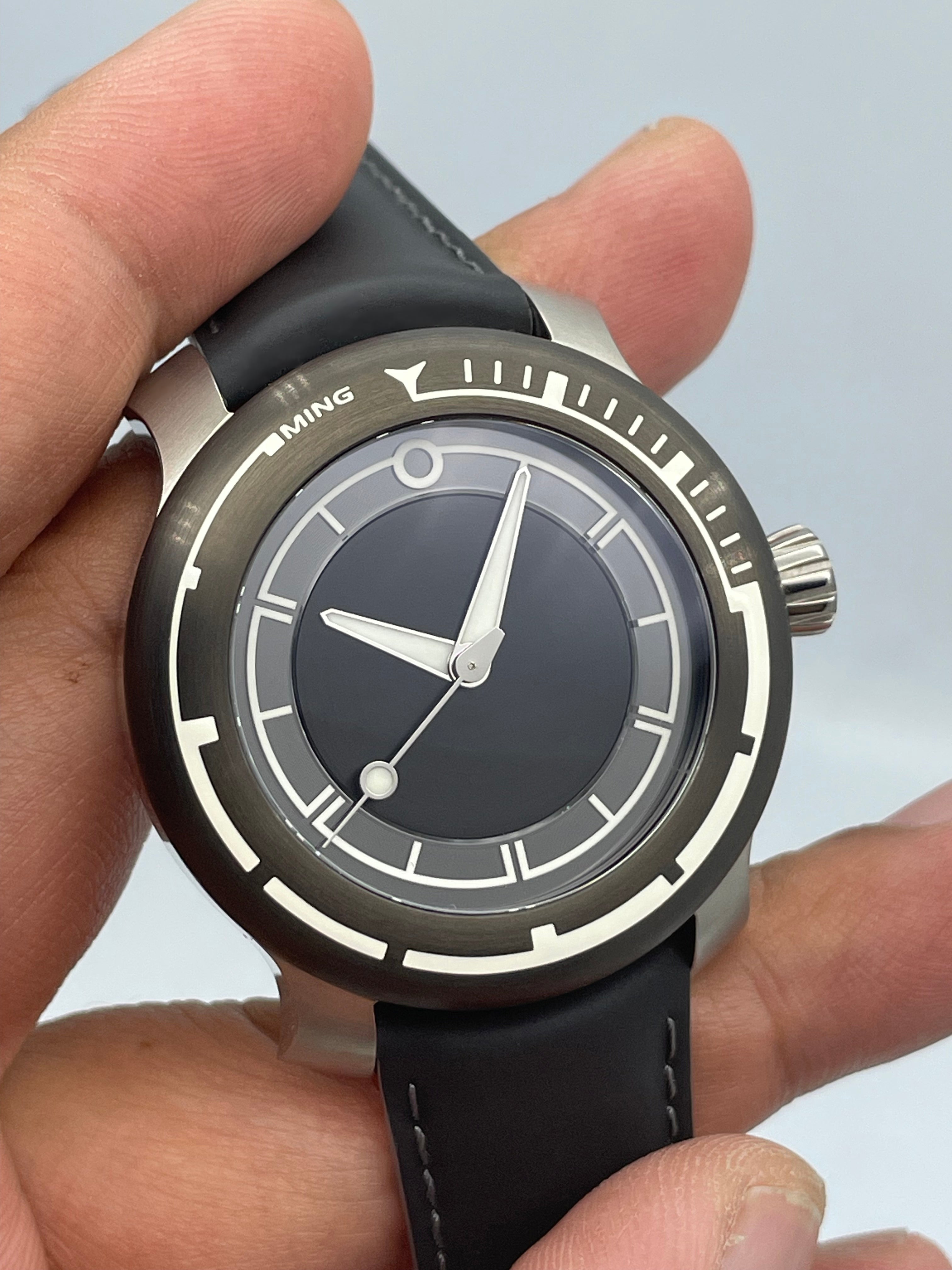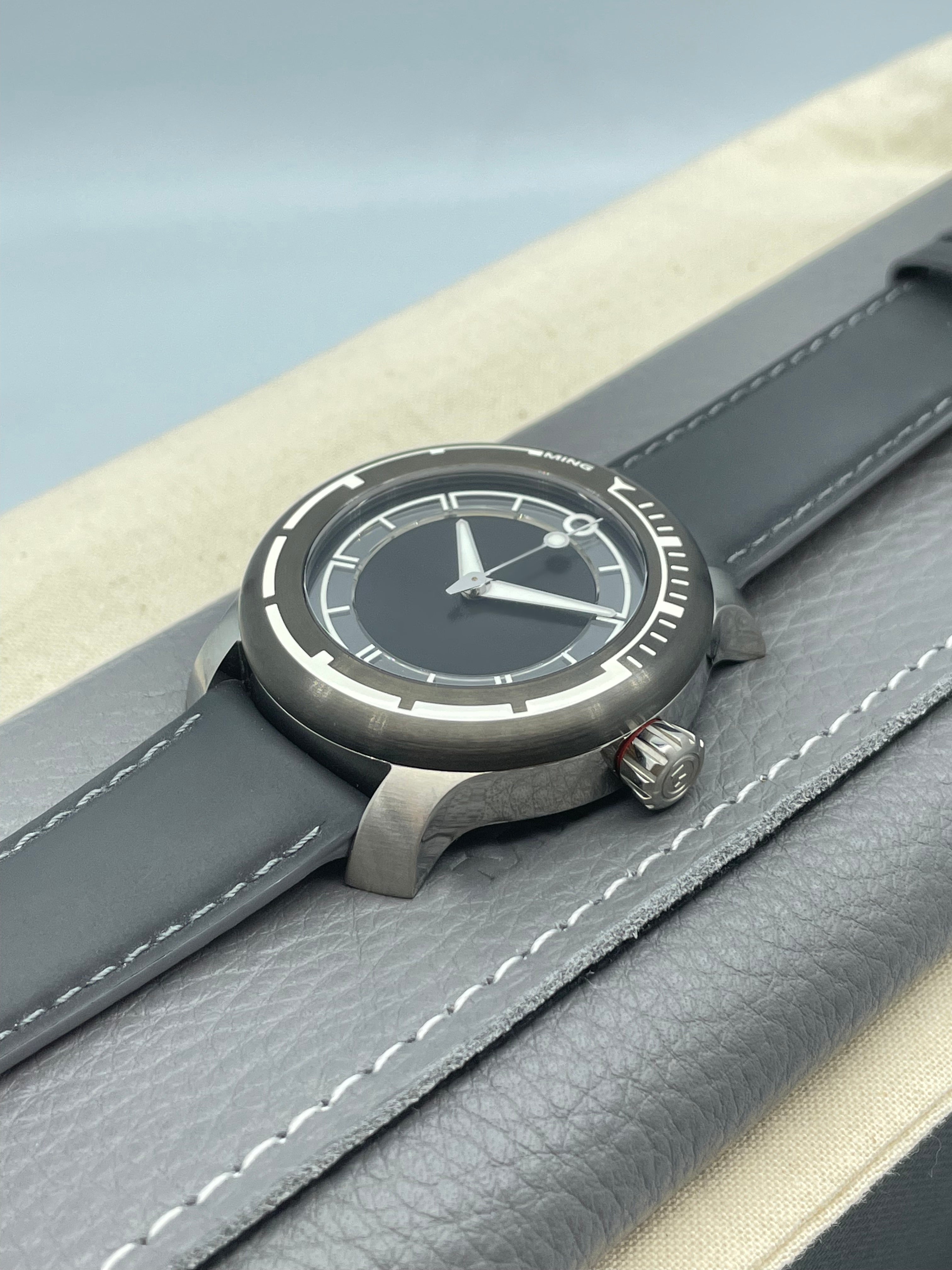 The watch focuses a lot on luminosity, featuring Ming’s signature floating ring design, which is coated with Super-LumiNova for exceptional readability in low-light environments. Unlike conventional dive watches with applied indices, Ming’s unique approach integrates luminescent material directly into the dial’s structure, creating a visually striking effect in darkness. The absence of a date window preserves the symmetrical balance of the dial, ensuring a distraction-free experience for divers and collectors who appreciate clean design. The broad sword-style hands provide strong contrast against the dial, enhancing visibility and ease of reading underwater.