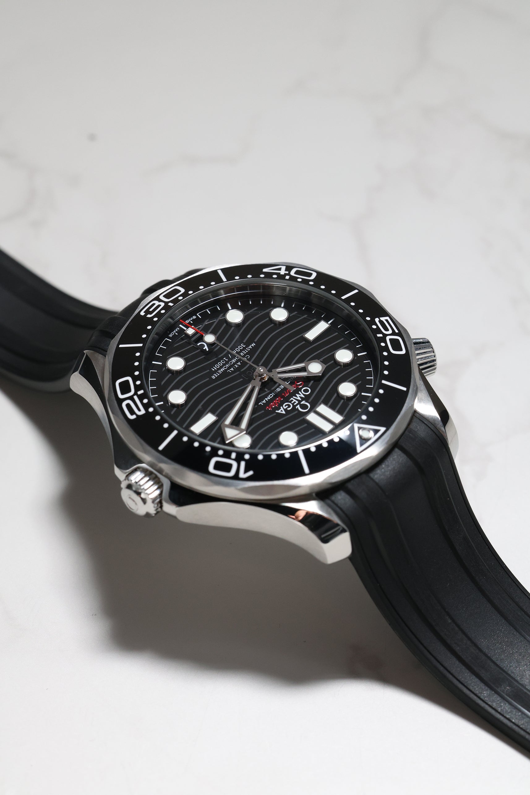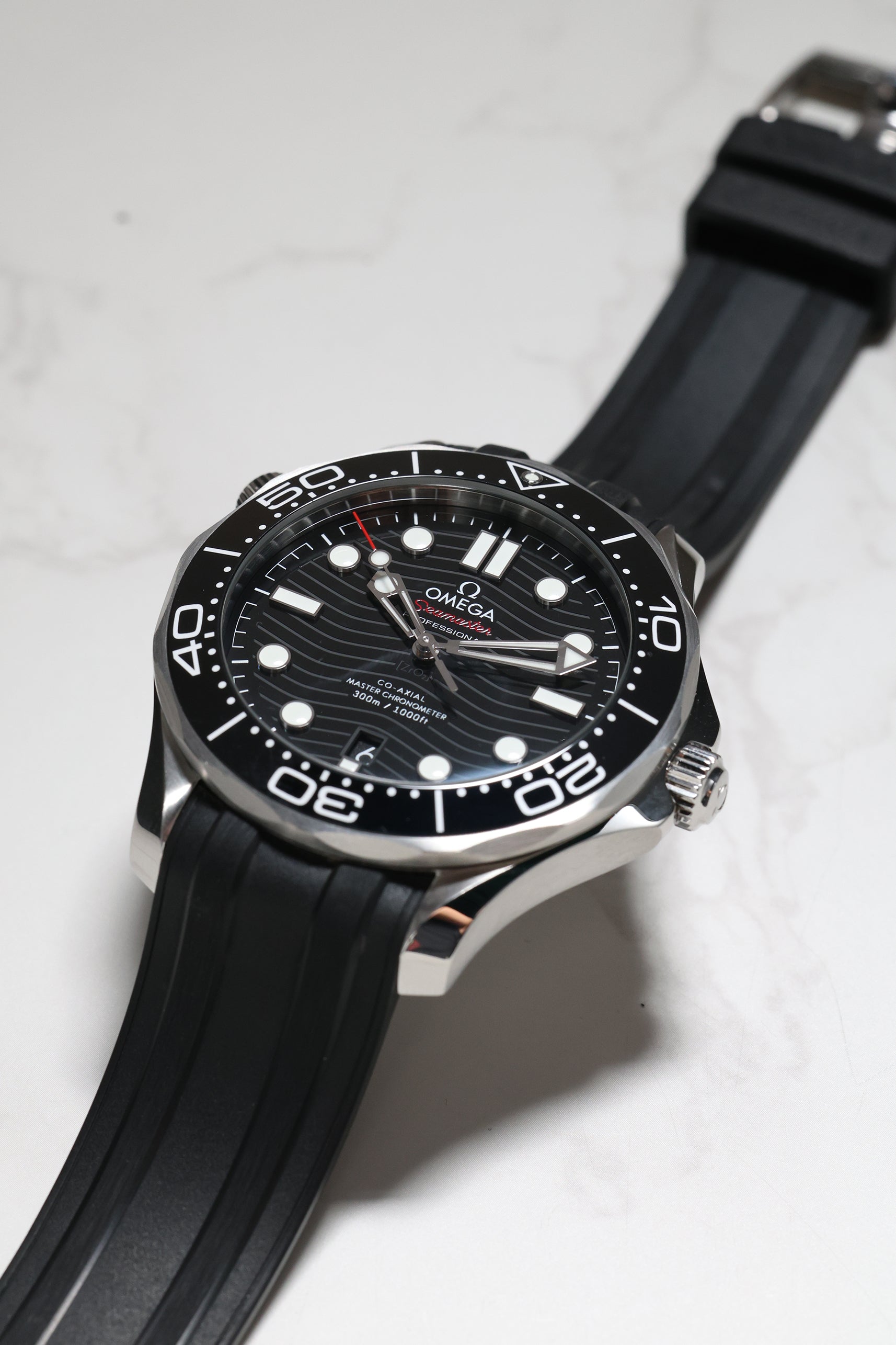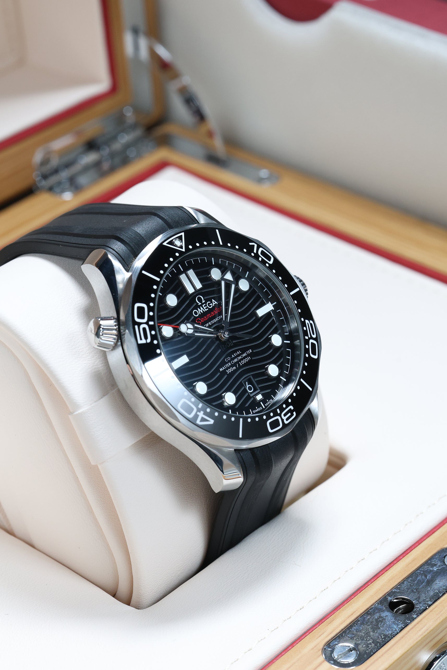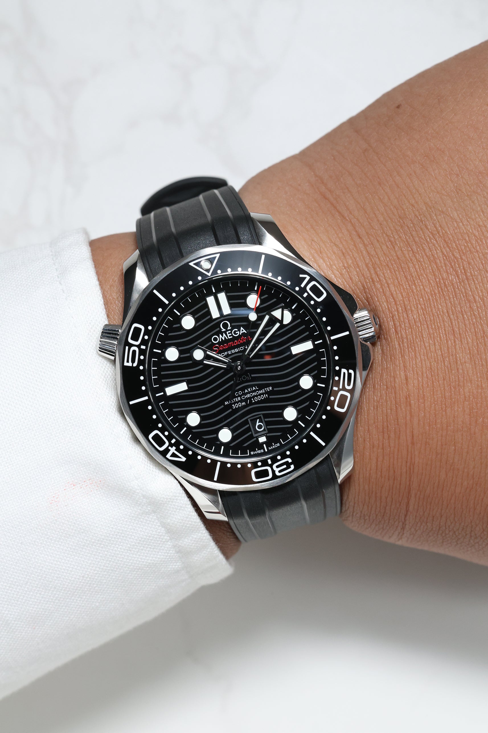 The black rubber strap adds a sporty edge, providing comfort, flexibility, and water resistance—perfect for an active lifestyle. Whether paired with a wetsuit or worn beneath a cuff, the Seamaster Diver 300M 210.32.42.20.01.001 delivers versatility with an unmistakably modern Omega flair. Its refined design, robust build, and iconic status make it a compelling choice for both seasoned collectors and first-time luxury watch buyers.