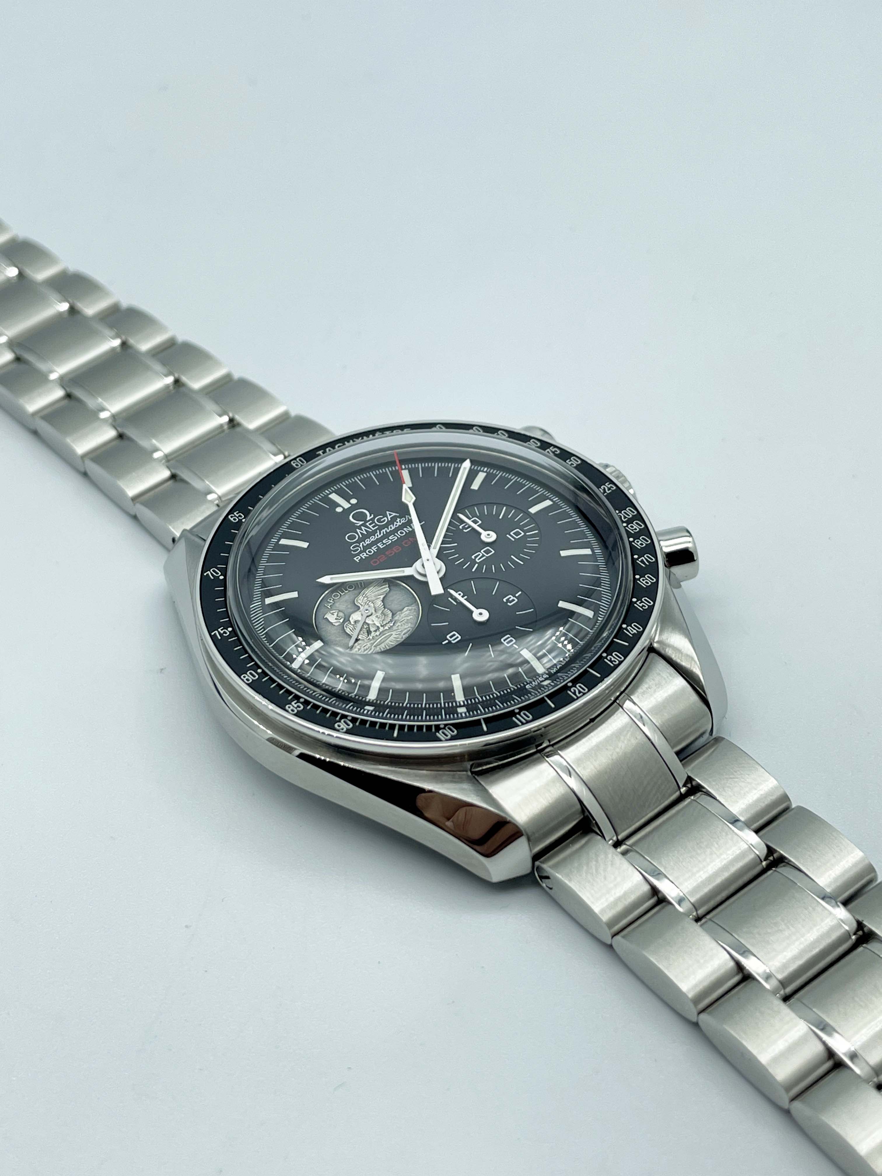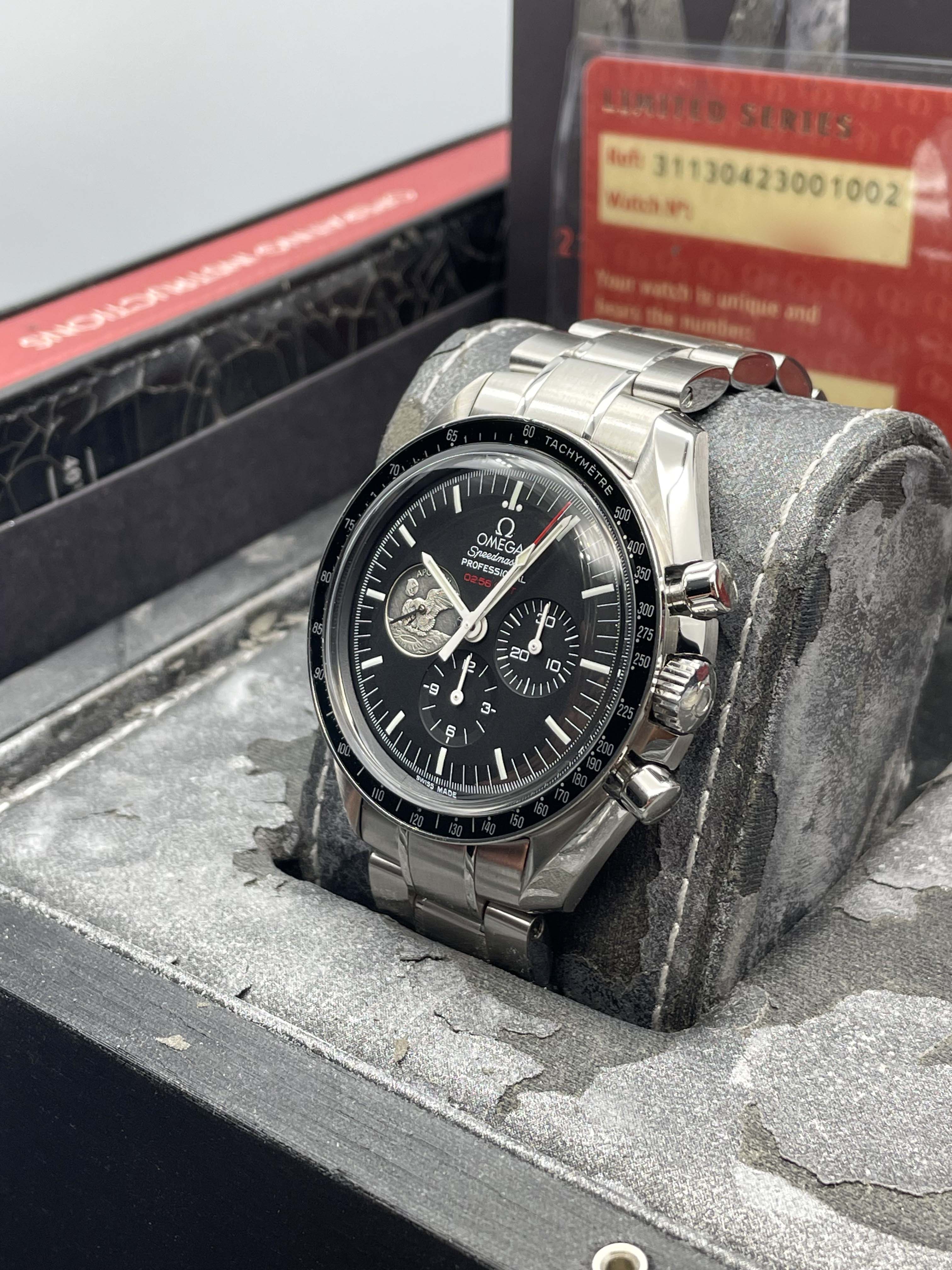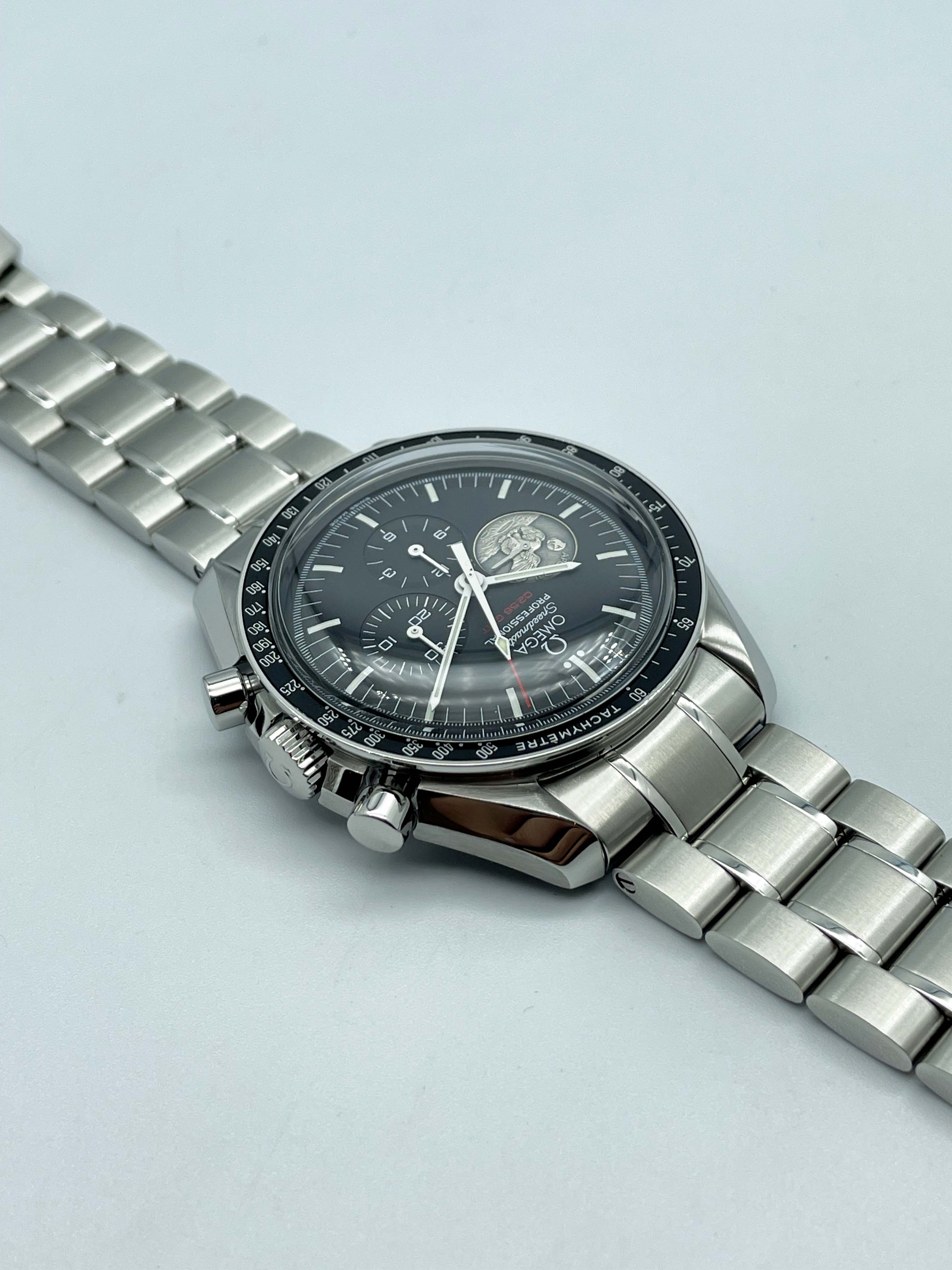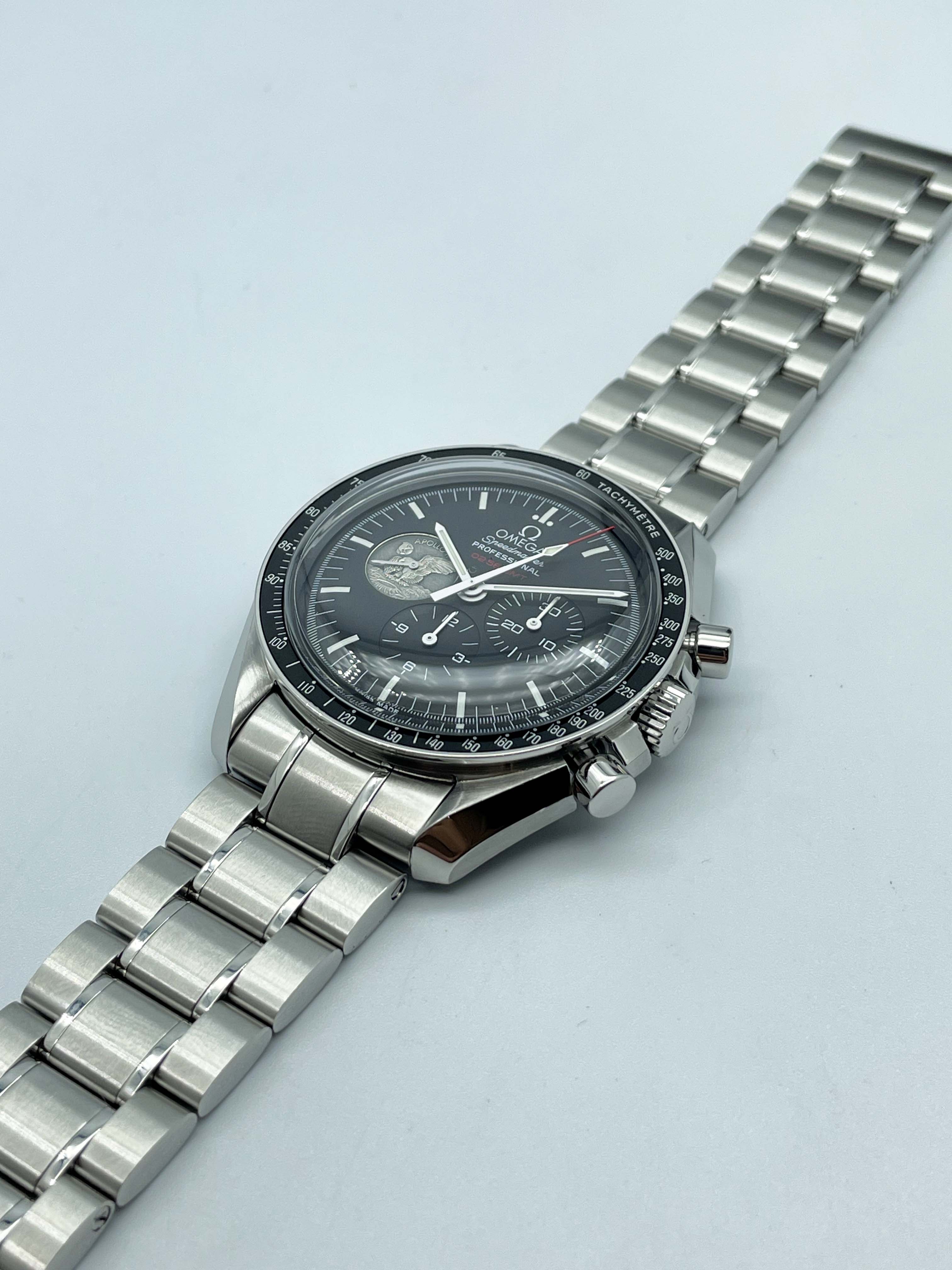 The Omega Speedmaster Moonwatch 1861 Apollo 11 40th Anniversary 311.30.42.30.01.002 is a commemorative edition celebrating the 1969 Apollo 11 moon landing, one of the most significant moments in both space exploration and watchmaking history. Released in 2009 to mark the 40th anniversary, this limited-edition Speedmaster remains faithful to the original Moonwatch worn by astronauts, featuring a 42mm stainless steel case, Hesalite crystal, and the manually wound Calibre 1861 movement. Staying true to the heritage of the Speedmaster, it retains the professional chronograph layout and the classic tachymeter bezel that has become synonymous with NASA's space missions.