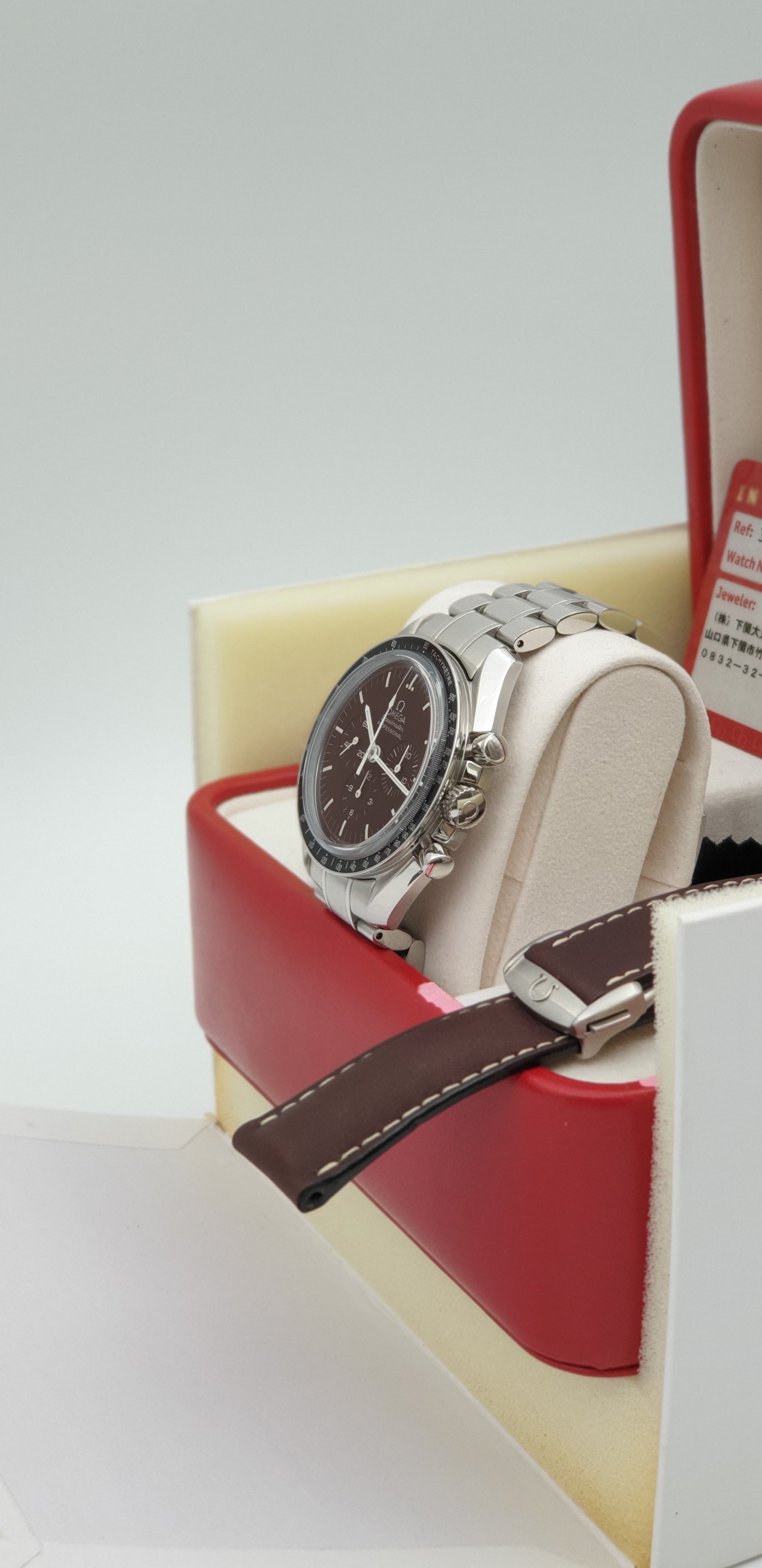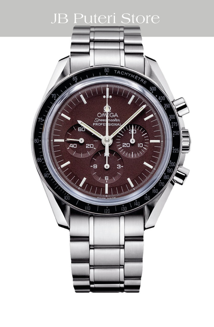Completing the aesthetic allure of the Moonwatch Chocolate is its brown leather strap. Crafted from high-quality leather, the strap provides comfort and a refined look. The strap is secured by a stainless steel buckle engraved with the Omega logo, ensuring a secure and stylish fit on the wrist.