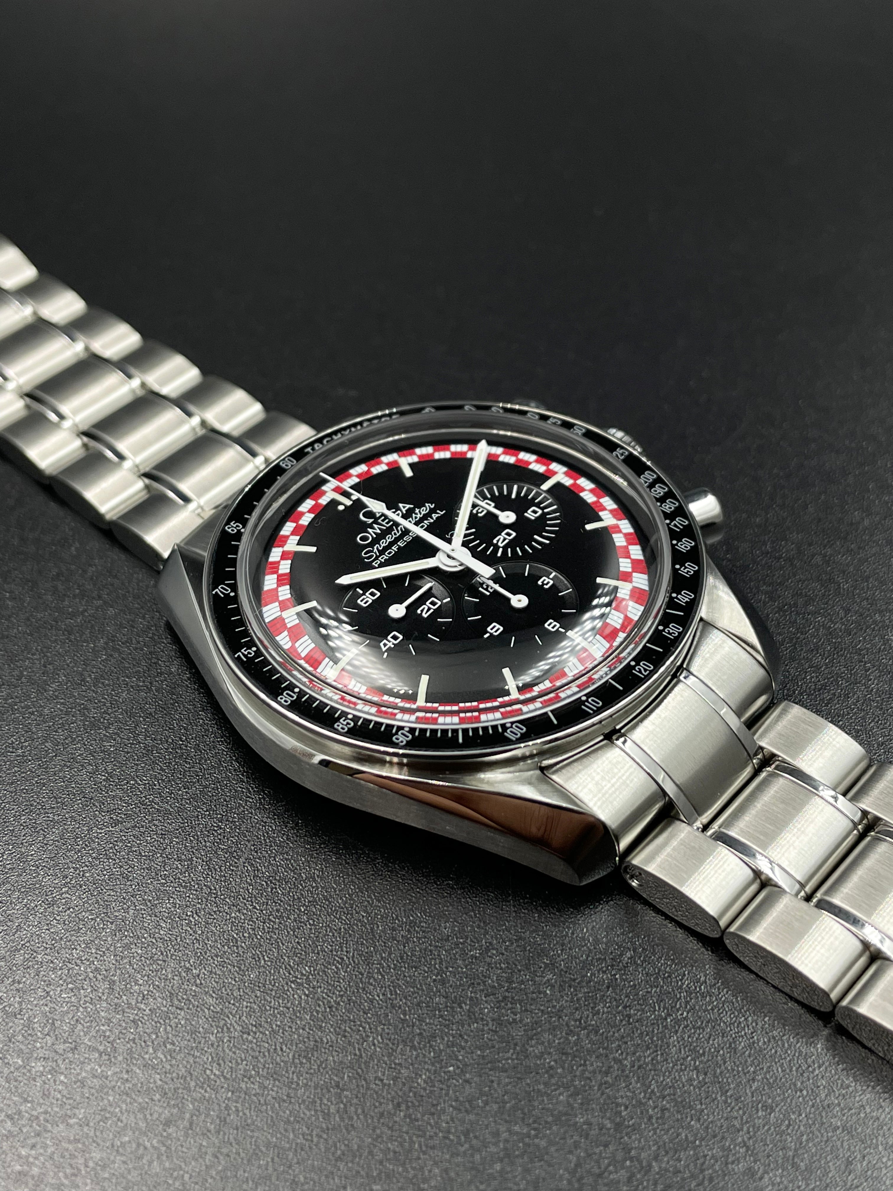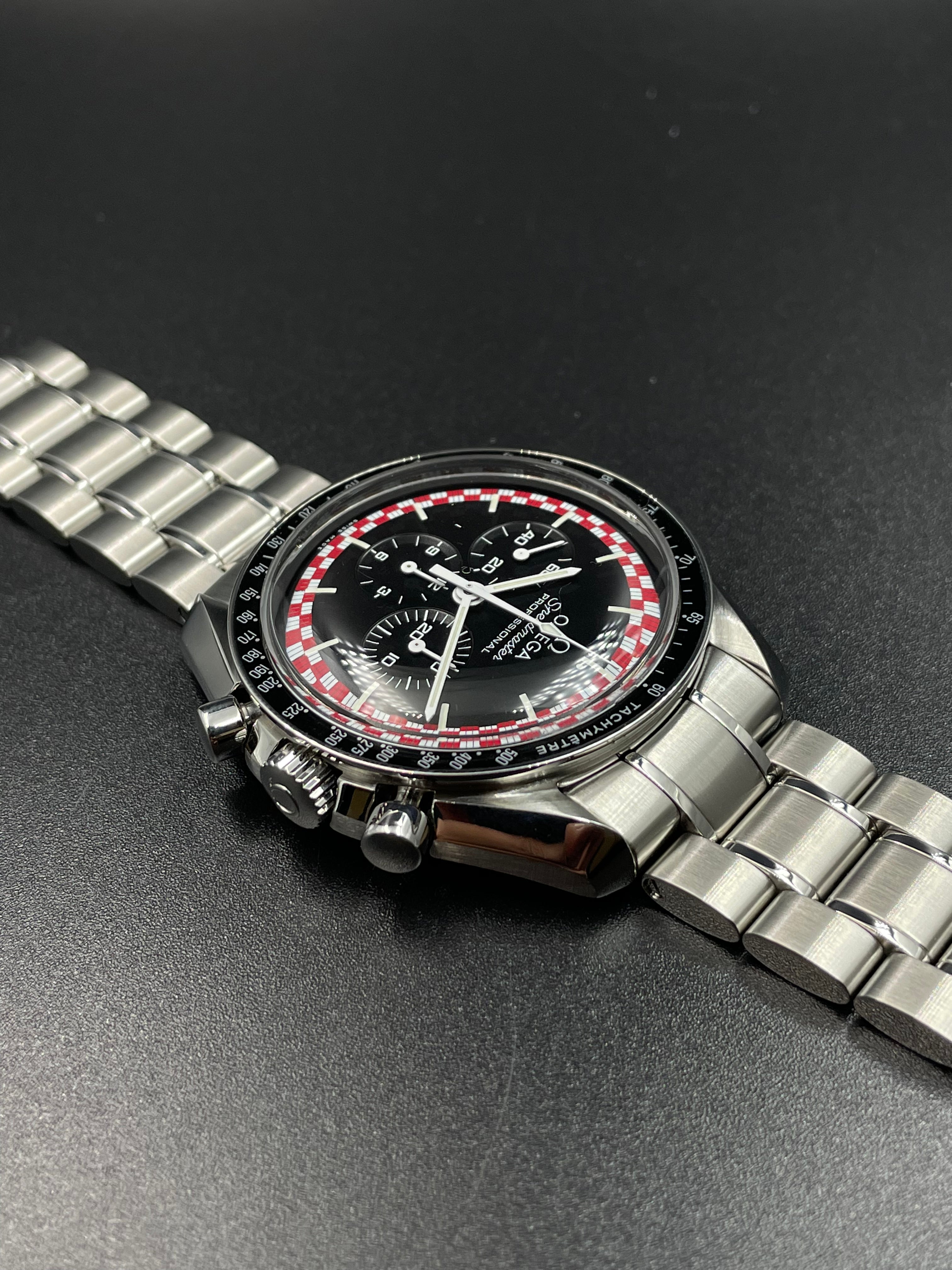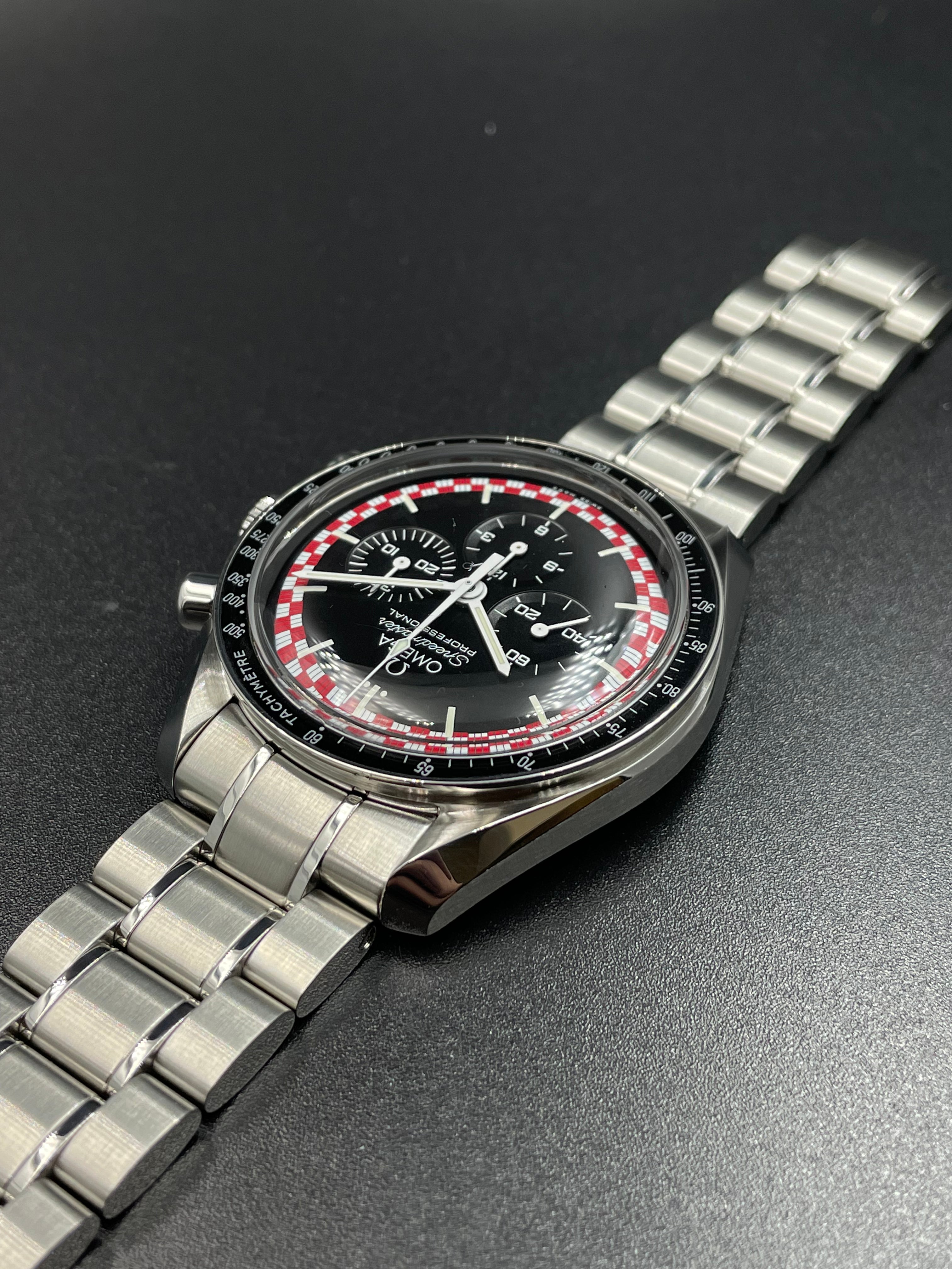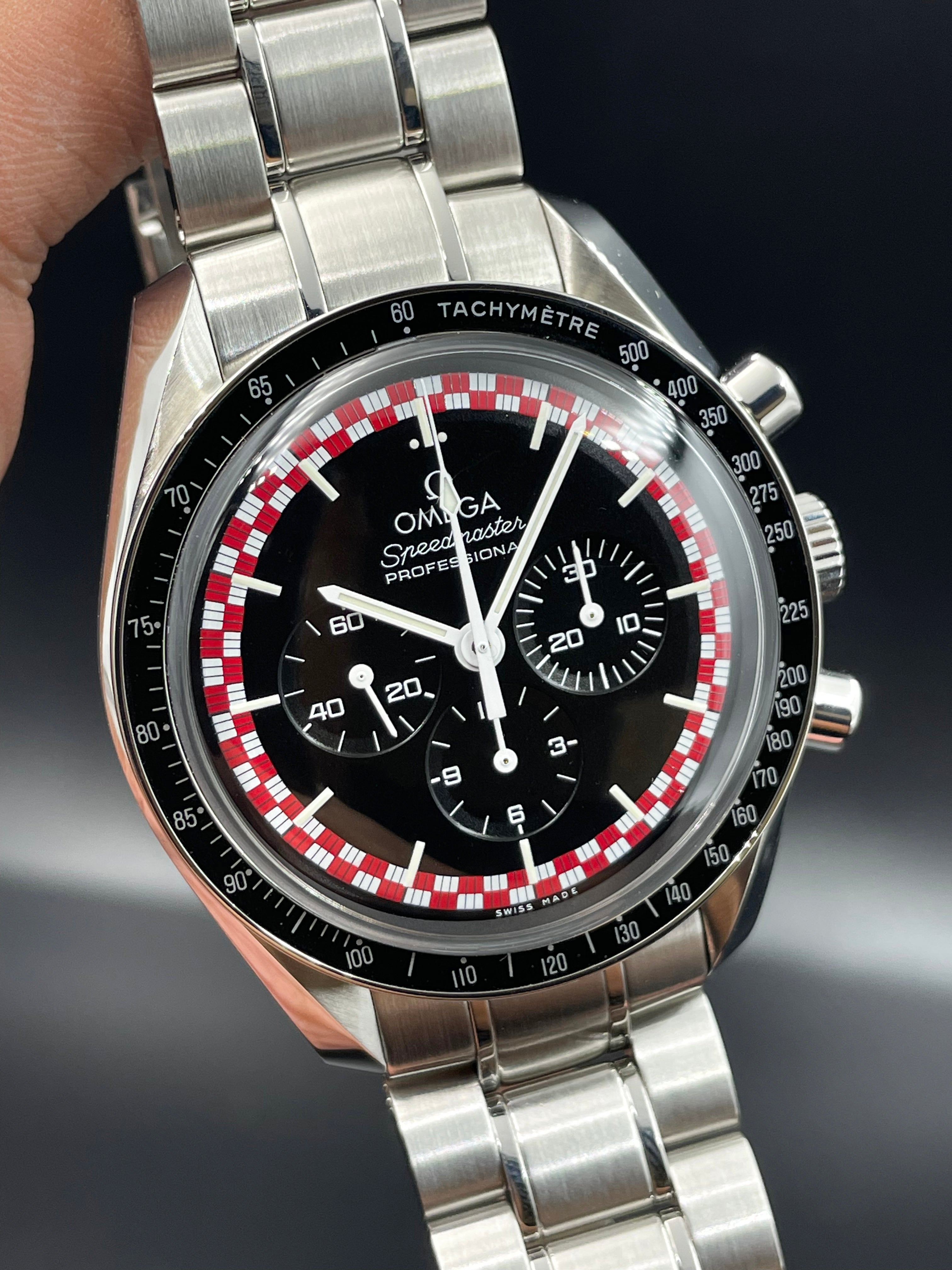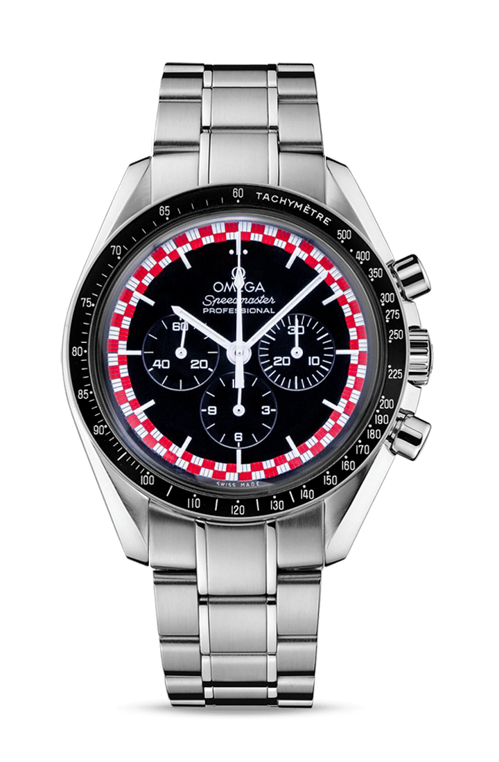 This version of the Moonwatch was released in 2013 and is coined the Tintin (after the famous Belgian comic character). It has a unique red & white racing motif on its dial - which is alike the design of the rocket in which Tintin famously goes to the Moon (refer to Adventures of Tintin - Destination Moon).