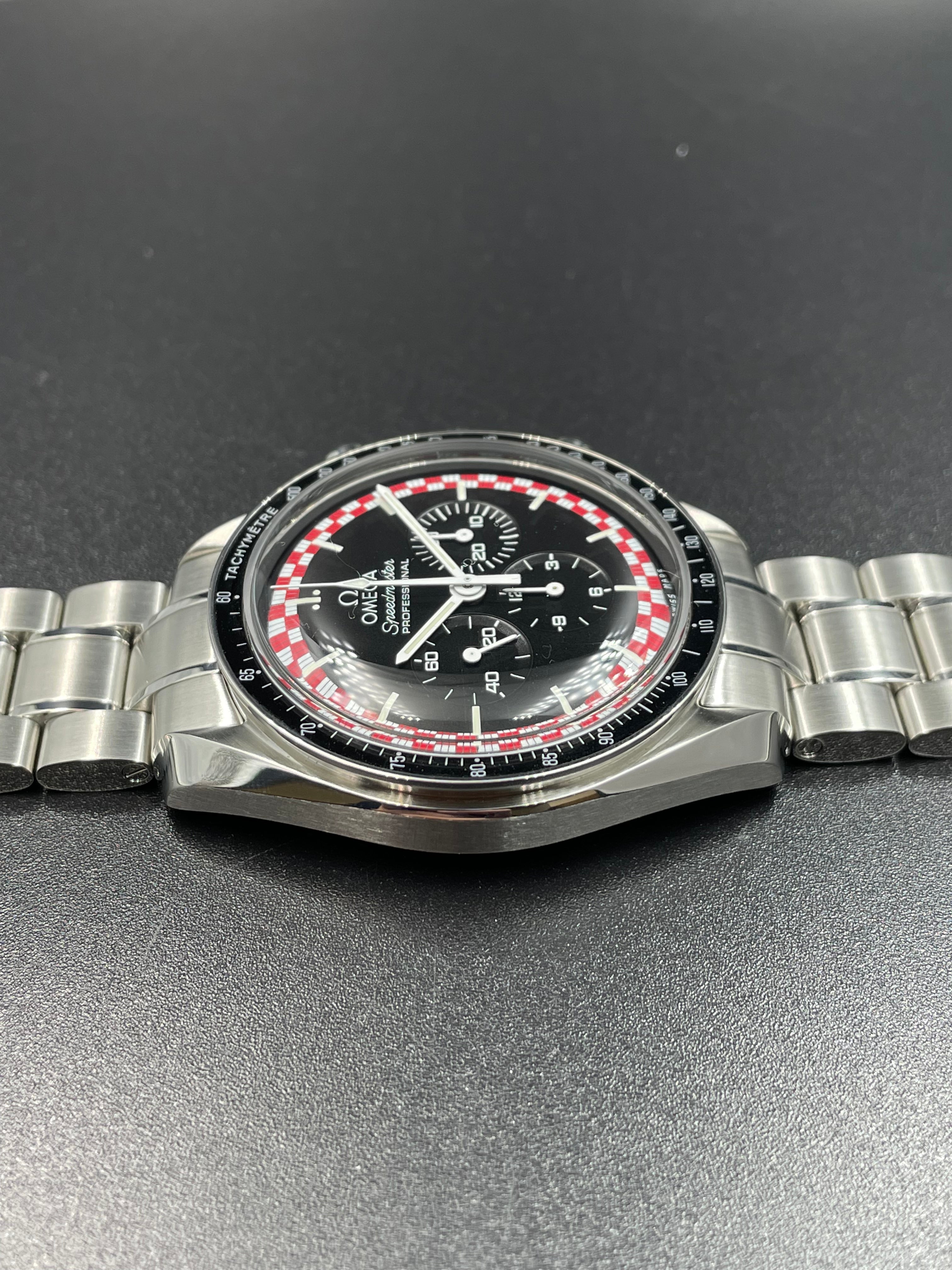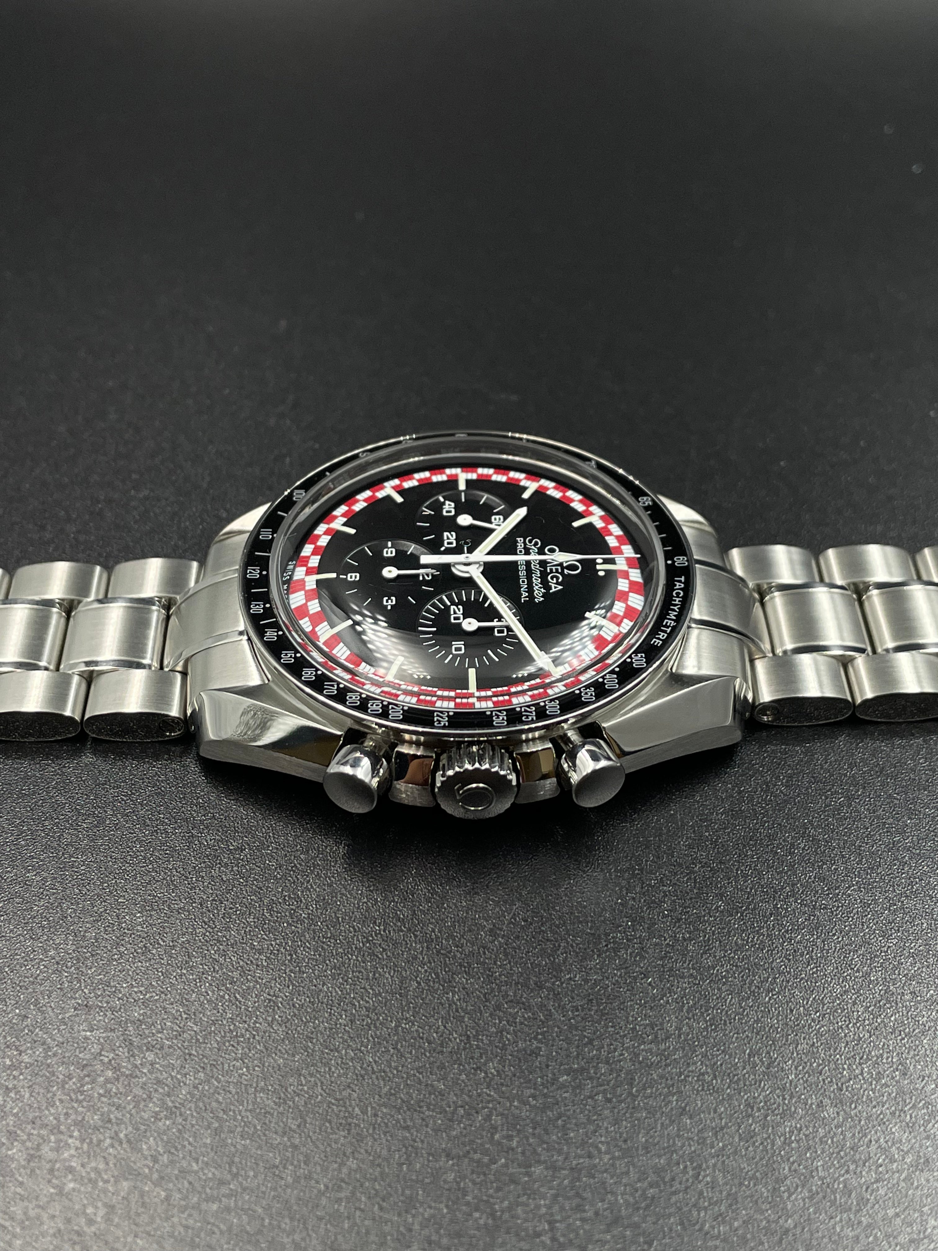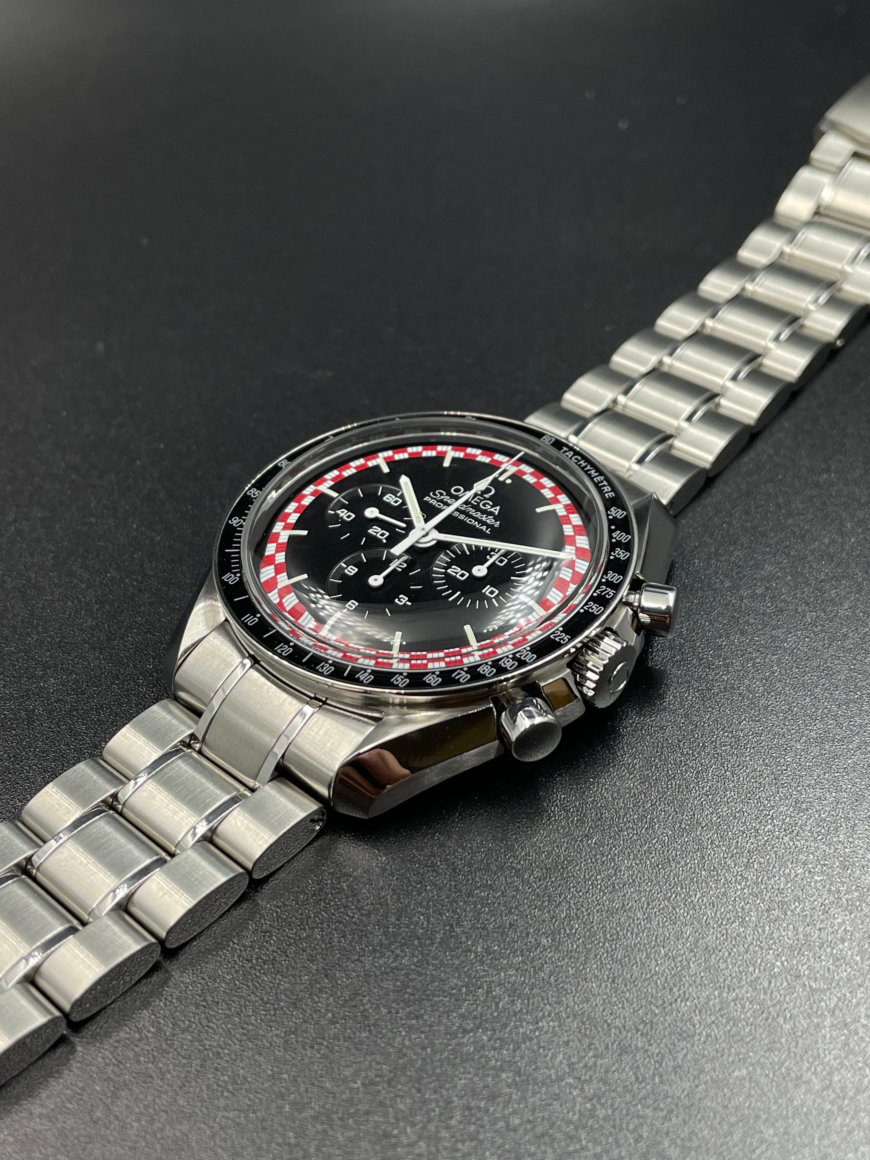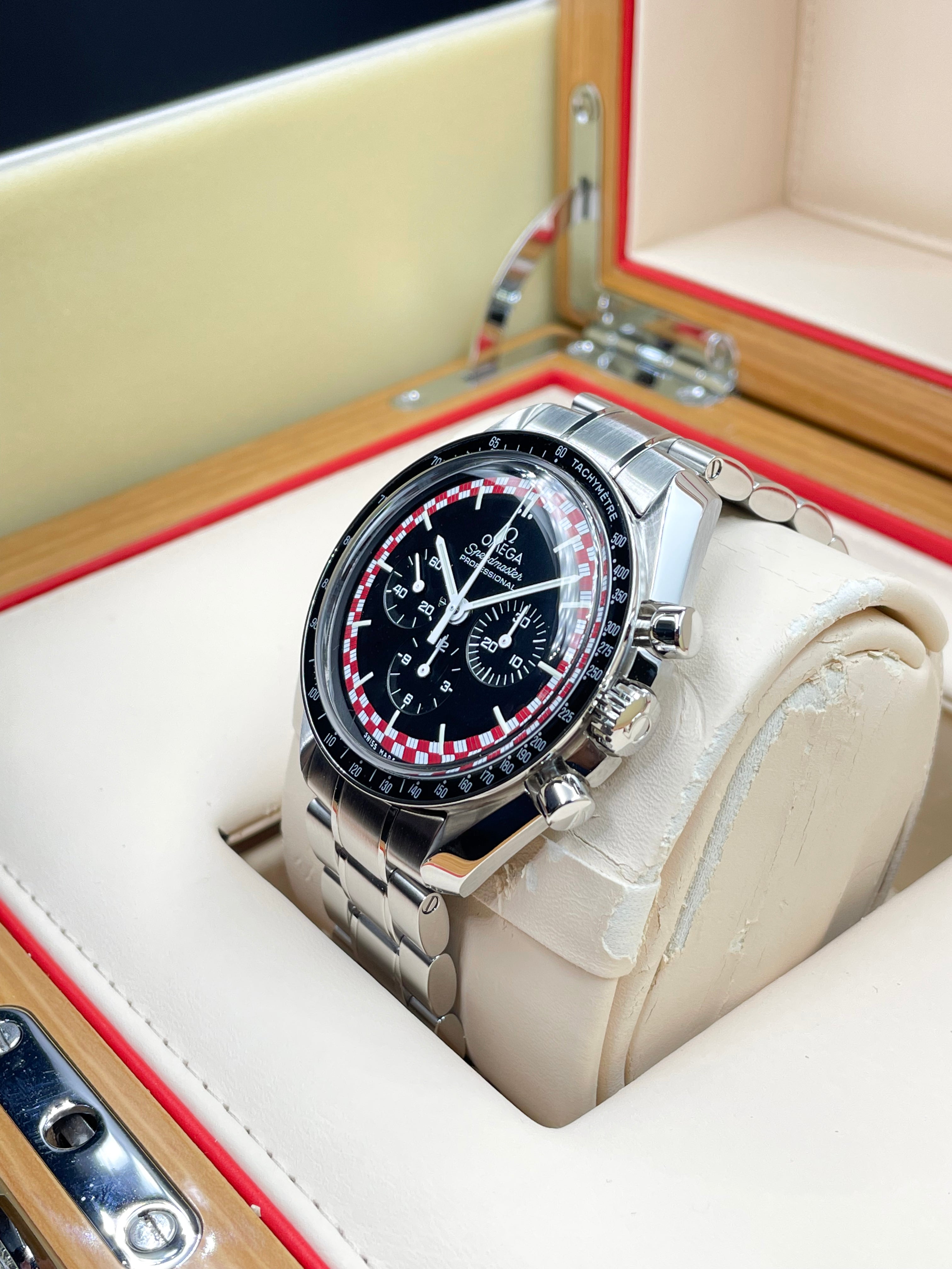 This version of the Moonwatch was released in 2013 and is coined the Tintin (after the famous Belgian comic character). It has a unique red & white racing motif on its dial - which is alike the design of the rocket in which Tintin famously goes to the Moon (refer to Adventures of Tintin - Destination Moon).